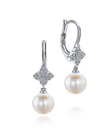 These elegant drop earrings each highlight a precious hanging cultured pearl. Floral clusters of diamonds totaling 0.09cts add a touch of feminine sparkle to the 14k white gold design. Perfect for wedding attire or any day you want to add a hint of femininity.