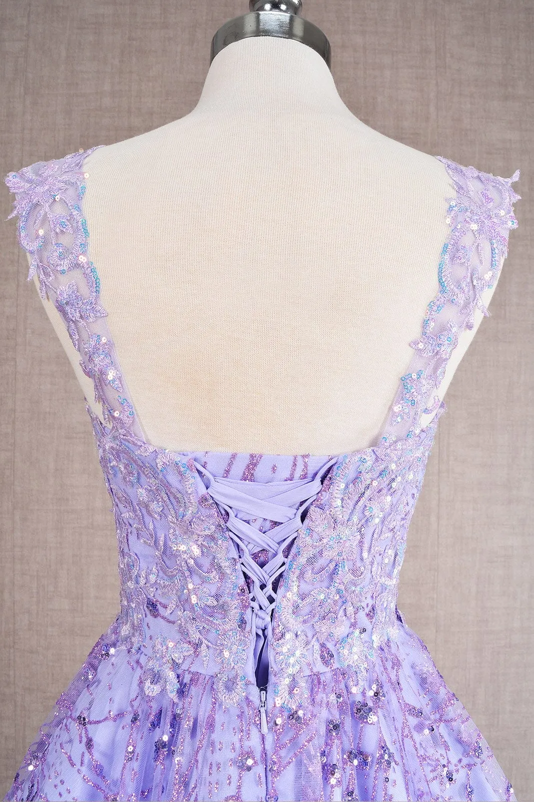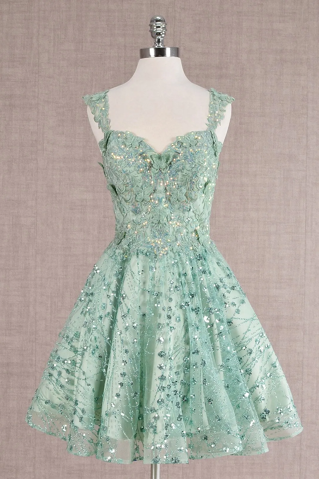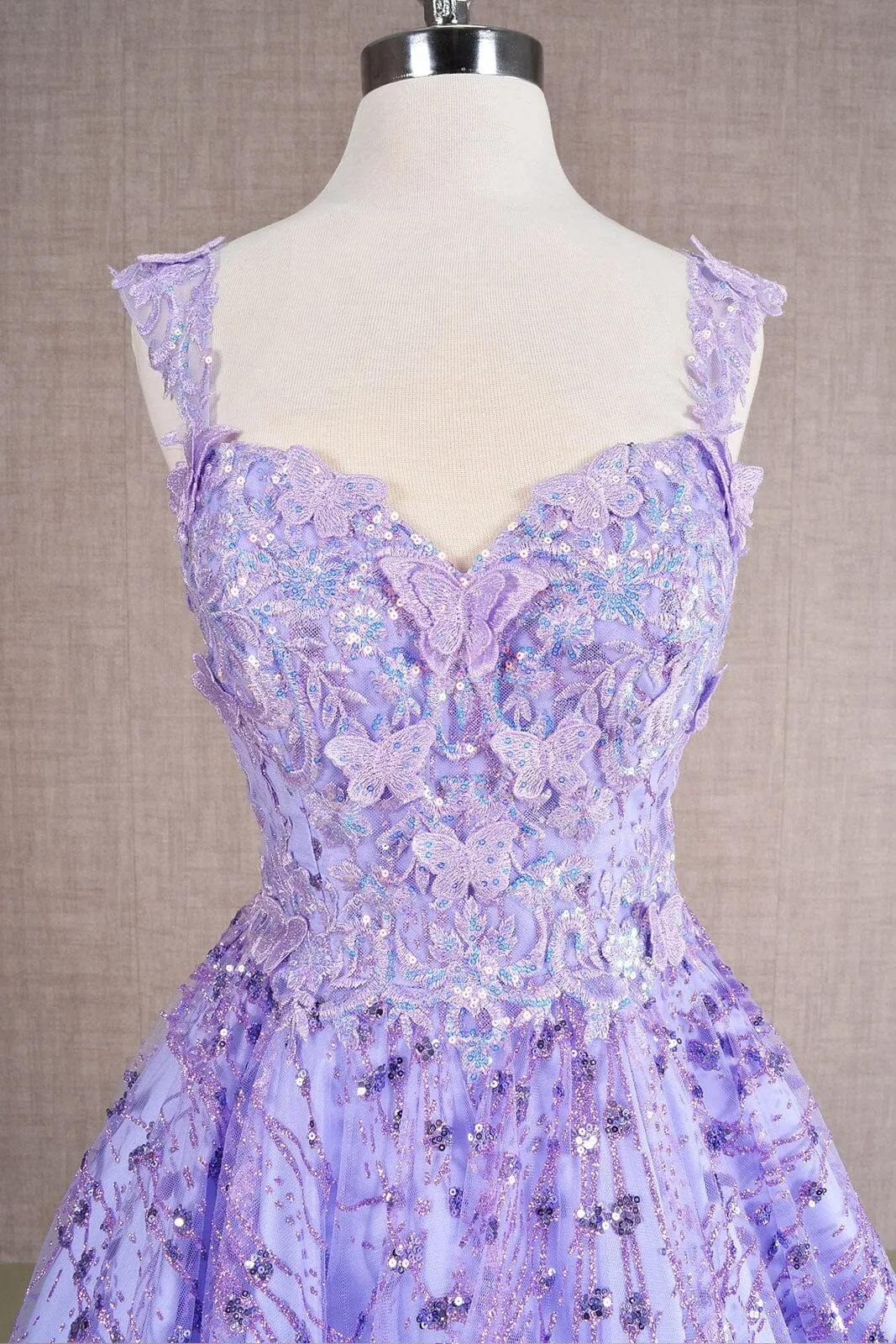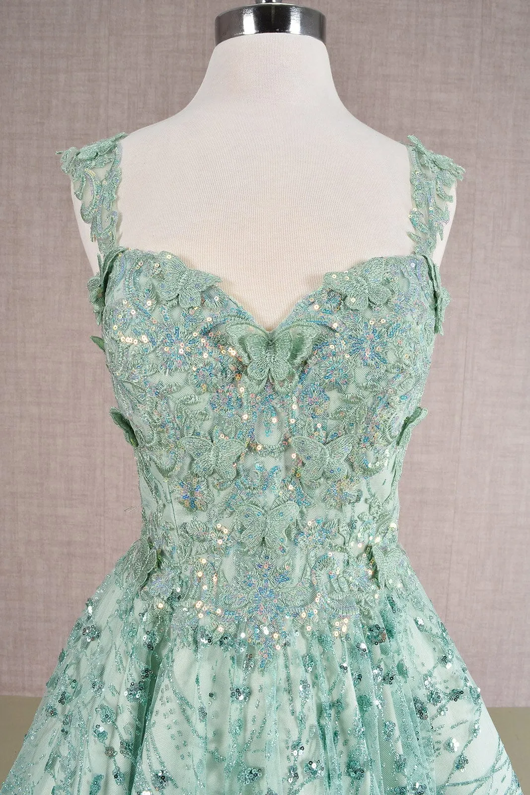 Be the center of attention in this 3D butterfly applique short sleeveless glitter dress with A-line skirt by Elizabeth K GS3187.