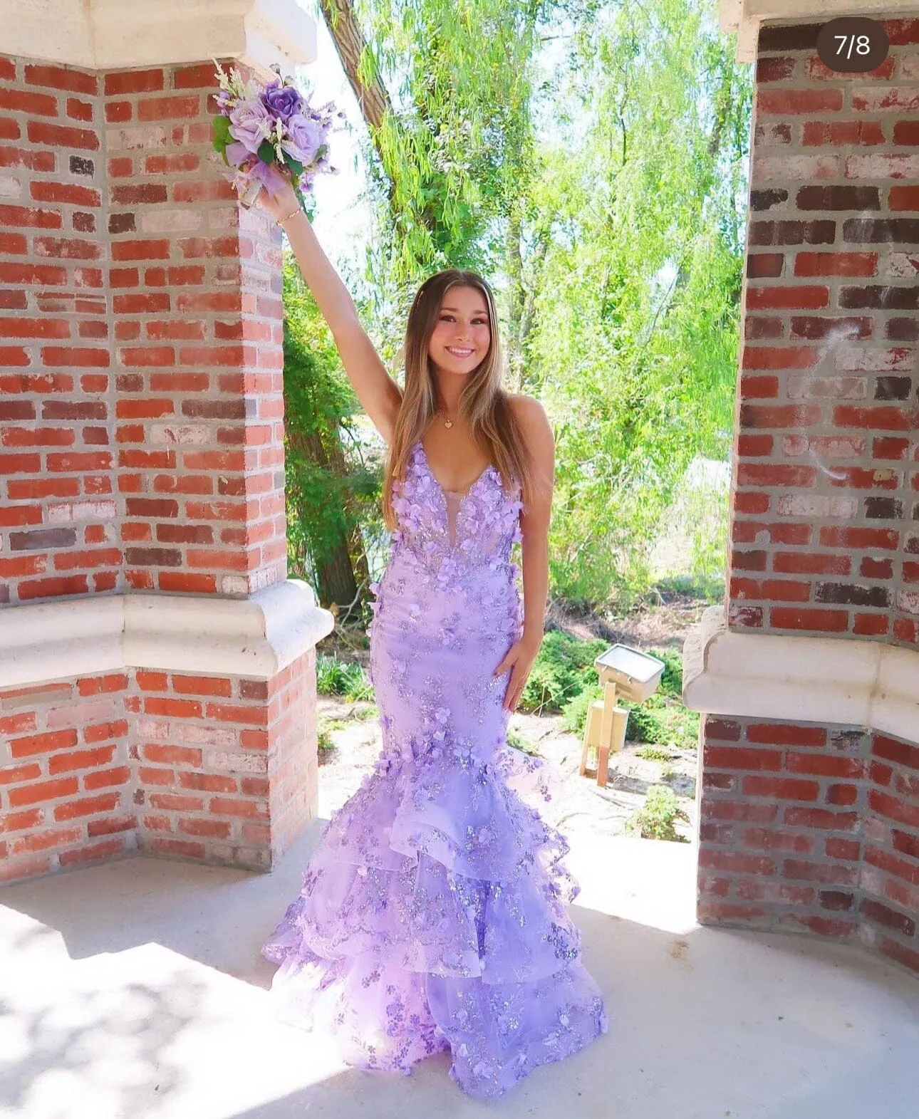 Dazzle the room in this 3D floral applique long sleeveless corset dress with tiered ruffled mermaid skirt from Ladivine by Cinderella Divine CD332. Elegance and sophistication come together in the exquisite floral mermaid gown. The fitted silhouette elegantly follows your shape, while the sheer boned bodice gives a touch of glamour to the look. An added statement piece comes from the dimensional floral applique that adds a unique finish to the dress. The tiered layered skirt which falls below the knee adds a beautiful movement as you walk, while thin straps complete the dress and give it an extra touch of refinement. And don't forget about the intricate lace up corset back - laced up for a versatile fit. A stunning glitter floral print is another finishing touch that adds that perfect bit of sparkle whenever you make an entrance.