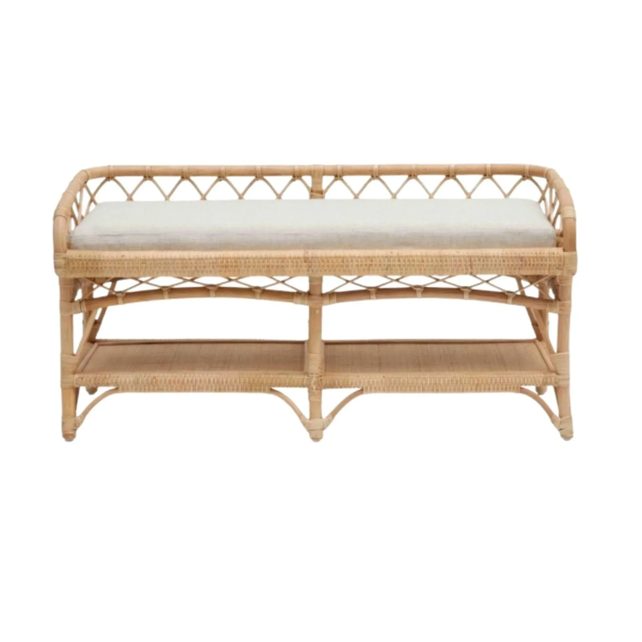 Natural woven rattan bench with cream cushion and shelf below for storage. Indoor use only. Perfect for a window nook, entry way, or dining area. Measures: 48"W x 20"D x 24"H. Click images for greater details.