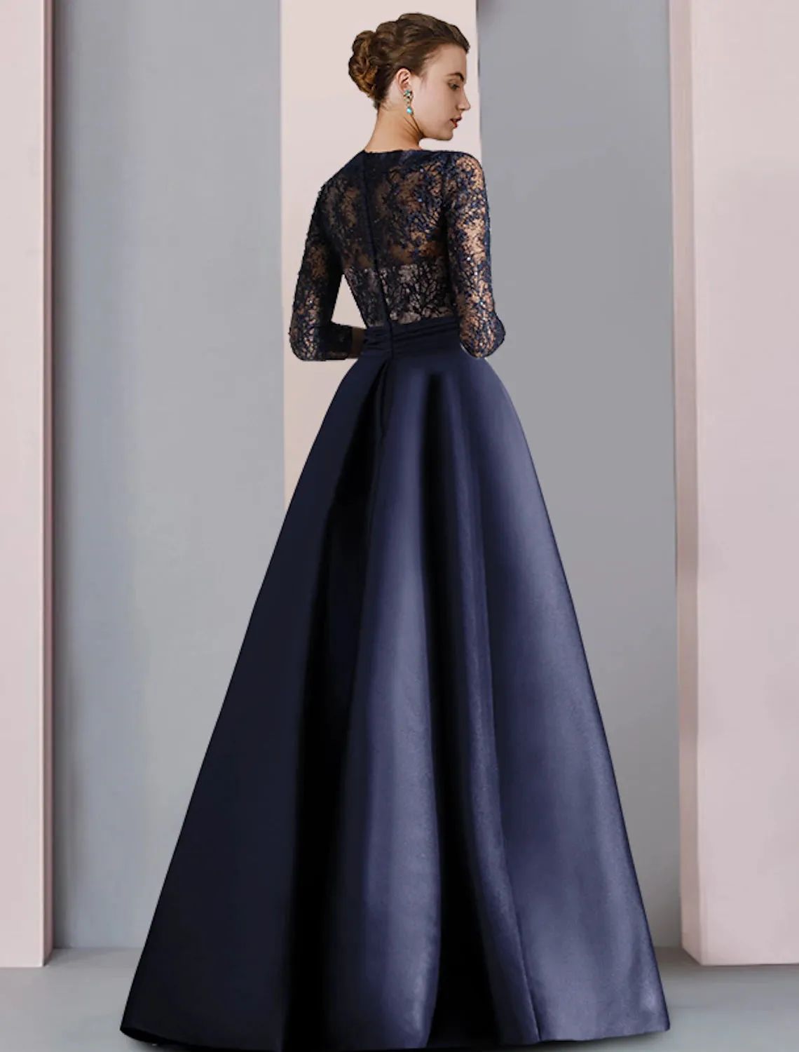 A-Line Mother of the Bride Dress Formal Party Elegant V Neck Floor Length Satin Lace Half Sleeve with Bow(s) Pleats Split Front