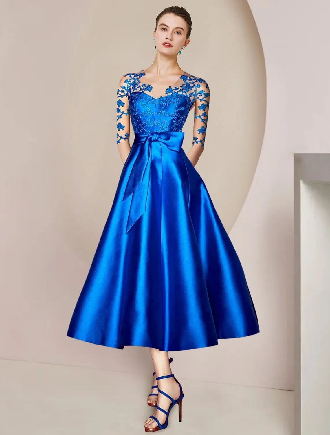 A-Line Mother of the Bride Dress Wedding Guest Party Elegant V Neck Tea Length Satin Lace Half Sleeve with Bow(s) Pleats Appliques