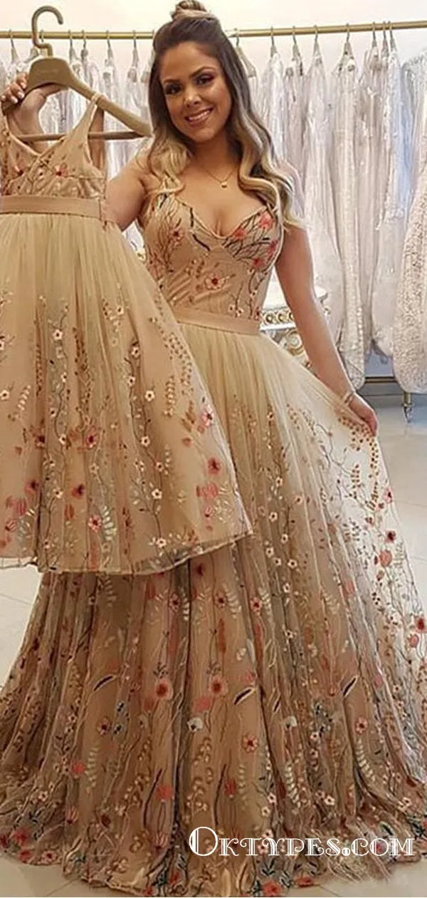A Line Spaghetti Straps Champagne Prom Dresses With Appliques, TYP1821