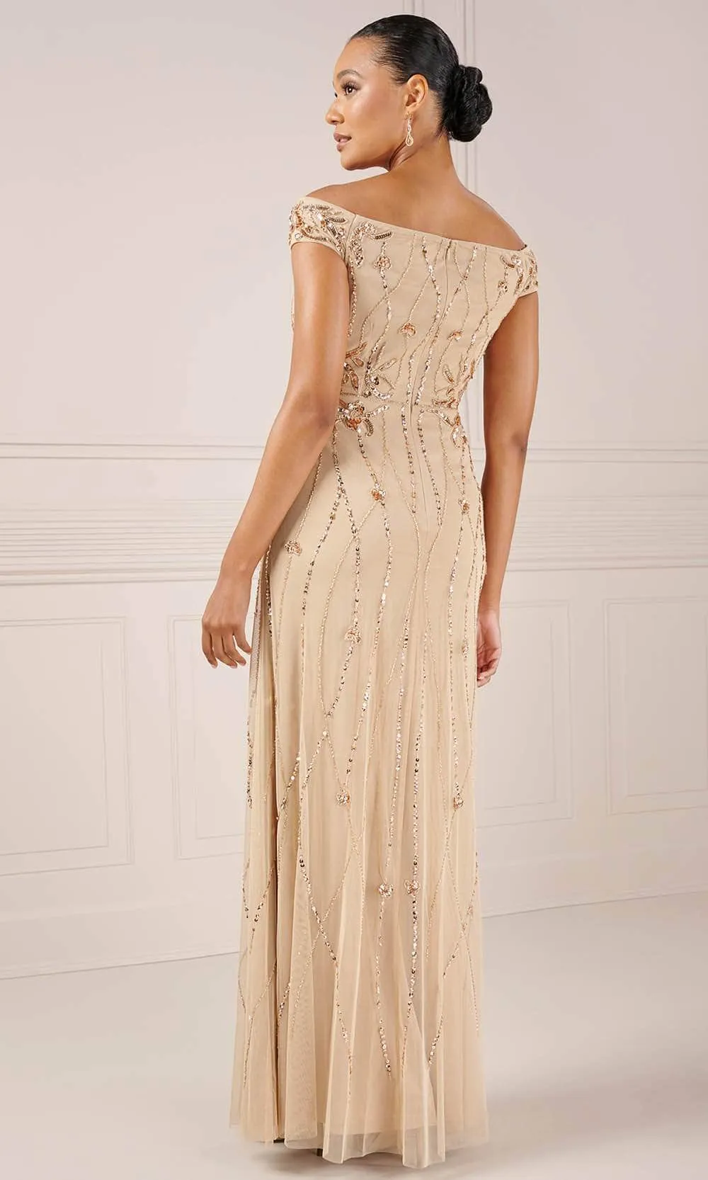 The breathtaking Adrianna Papell Platinum 40435 is an exquisite evening gown that seamlessly combines elegance and allure. It flaunts an off-the-shoulder neckline, a fitted bodice, adorned with intricate allover beading, sets a captivating and ethereal tone. The floor-length skirt, enhanced with a delicate skirt drape, creates a stunning and timeless silhouette, perfect for any special occasion. With its enchanting design and sophisticated detailing, this Adrianna Papell Platinum 40435 ensures a truly unforgettable entrance. Models are wearing Gunmetal and Champagne colors.
