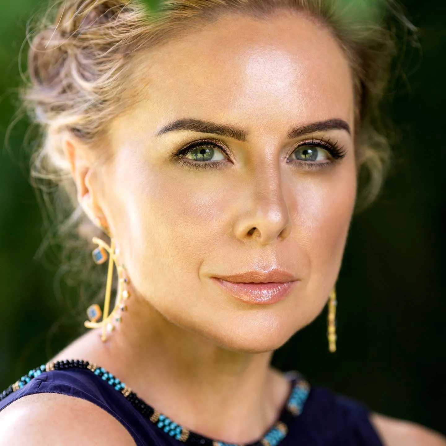 Recycled brass - gold plated 18k. adorned with semi-precious stones, such as Carnelian, Black Onyx, Pearl, Blue Turquoise, Amethyst, and Blue Quartz.