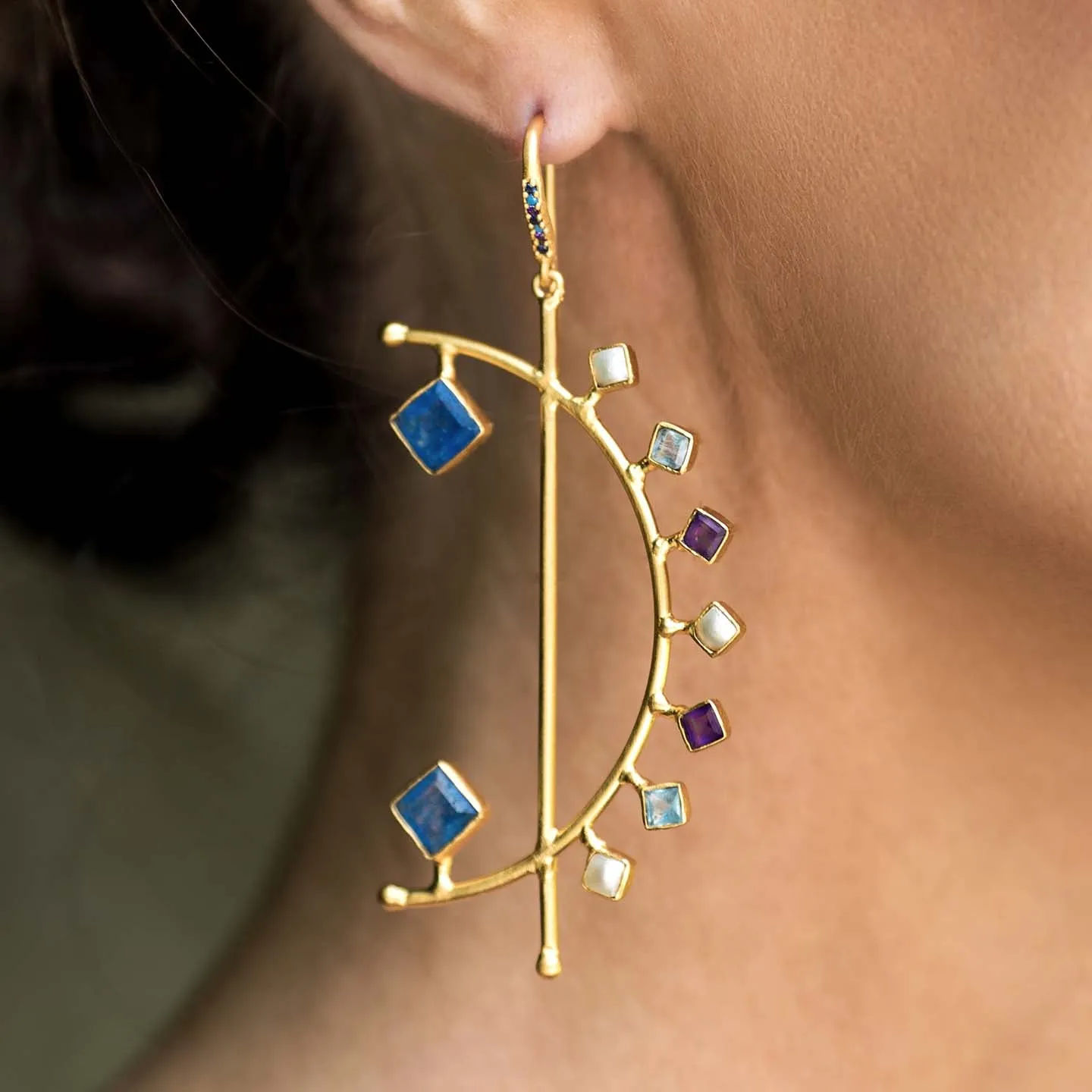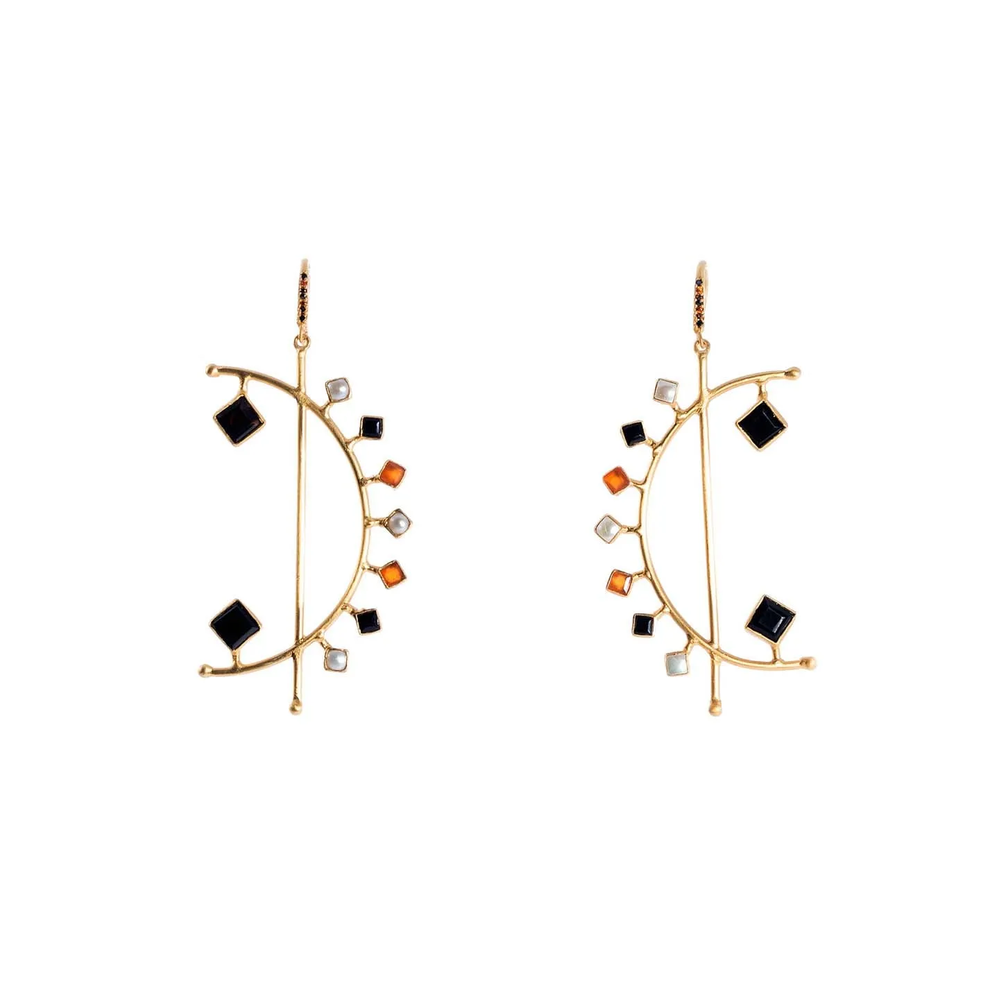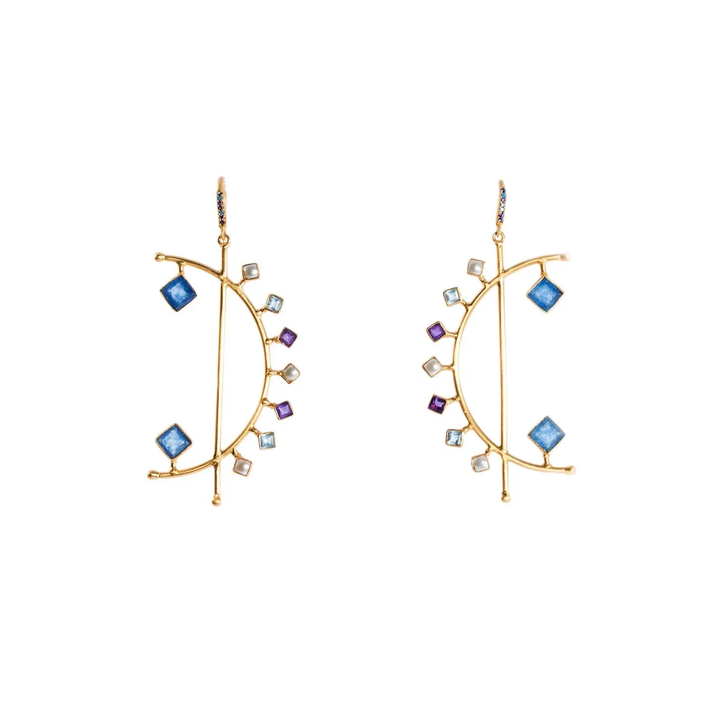 These dramatic earrings draw their inspiration from the legendary archery skills fo the Amazon warriors. The golden bow is held in tension at the ready with a hallow of semi-precious stones.