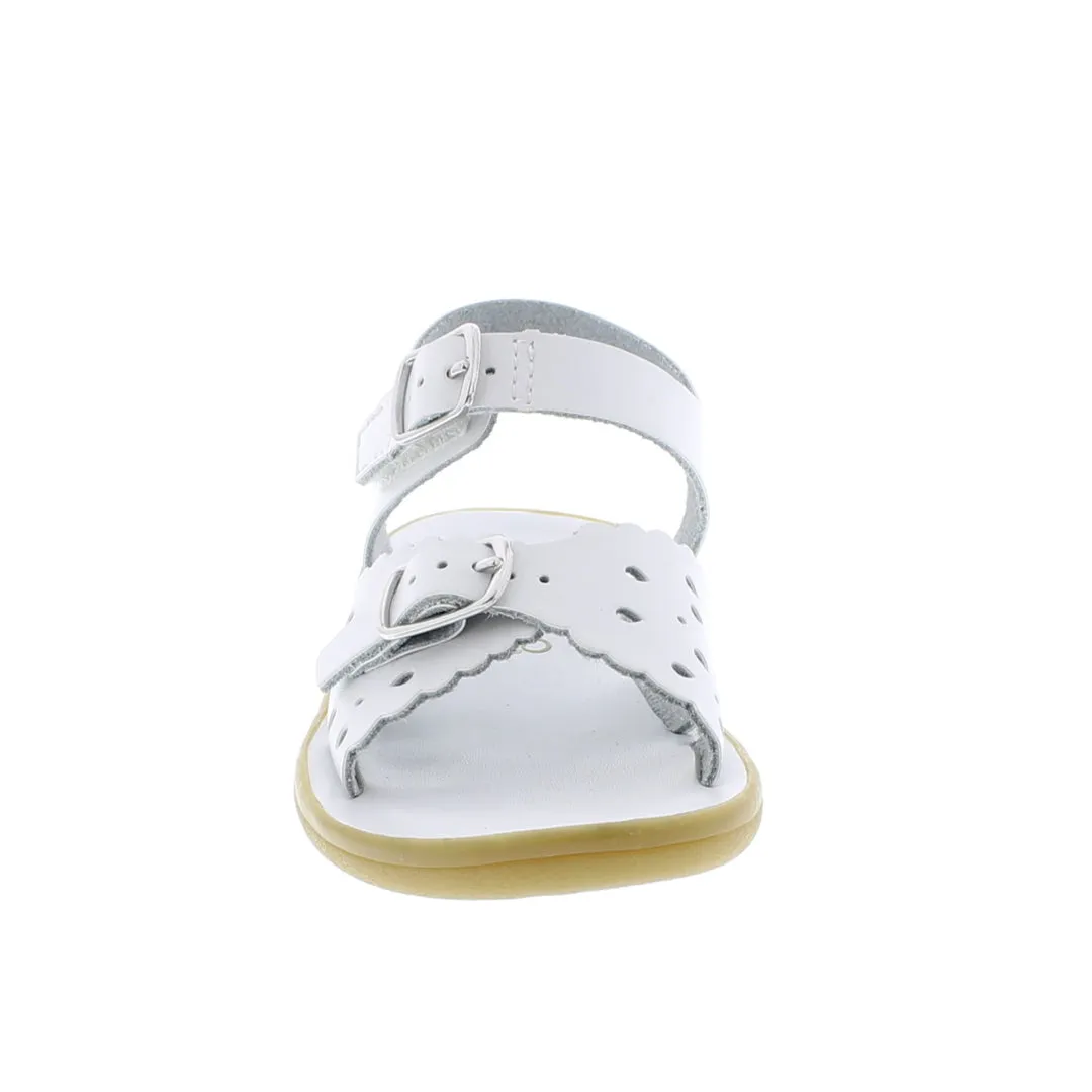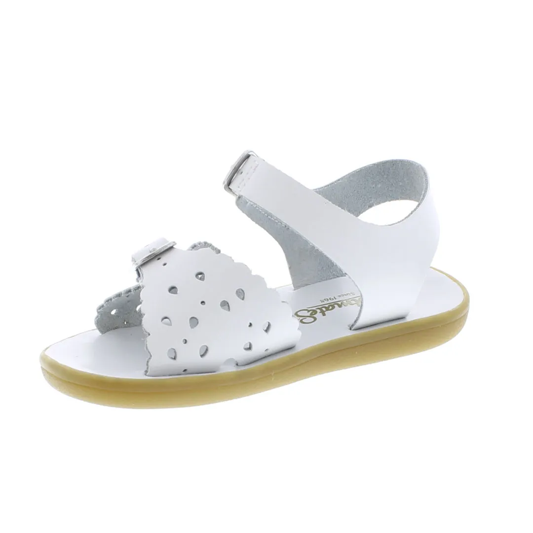 OPEN-TOE, OPEN-HEEL LEATHER SANDAL FEATURING TRUE-BUCKLE FOREFOOT STRAP WITH DECORATIVE TEAR-DROP PERF DESIGN AND HOOK-AND-LOOP ANKLE STRAP WITH DECORATIVE BUCKLE. OFFERED IN MATTE, PEARLIZED, AND METALLIC COLORS; SIZES RANGING FROM 1.0 INFANT - 3.0 YOUTH. Premium water-friendly leather uppers and leather footbeds. Corrosion resistant buckles. Flexible, Slip-Resistant Rubber Outsole – Provides maximum flexibility, shock absorption, stability and slip-resistance for safety and comfort. Hook & Loop closure (ankle strap). Buckle closure (lower strap). Non-marking outsole. Imported.