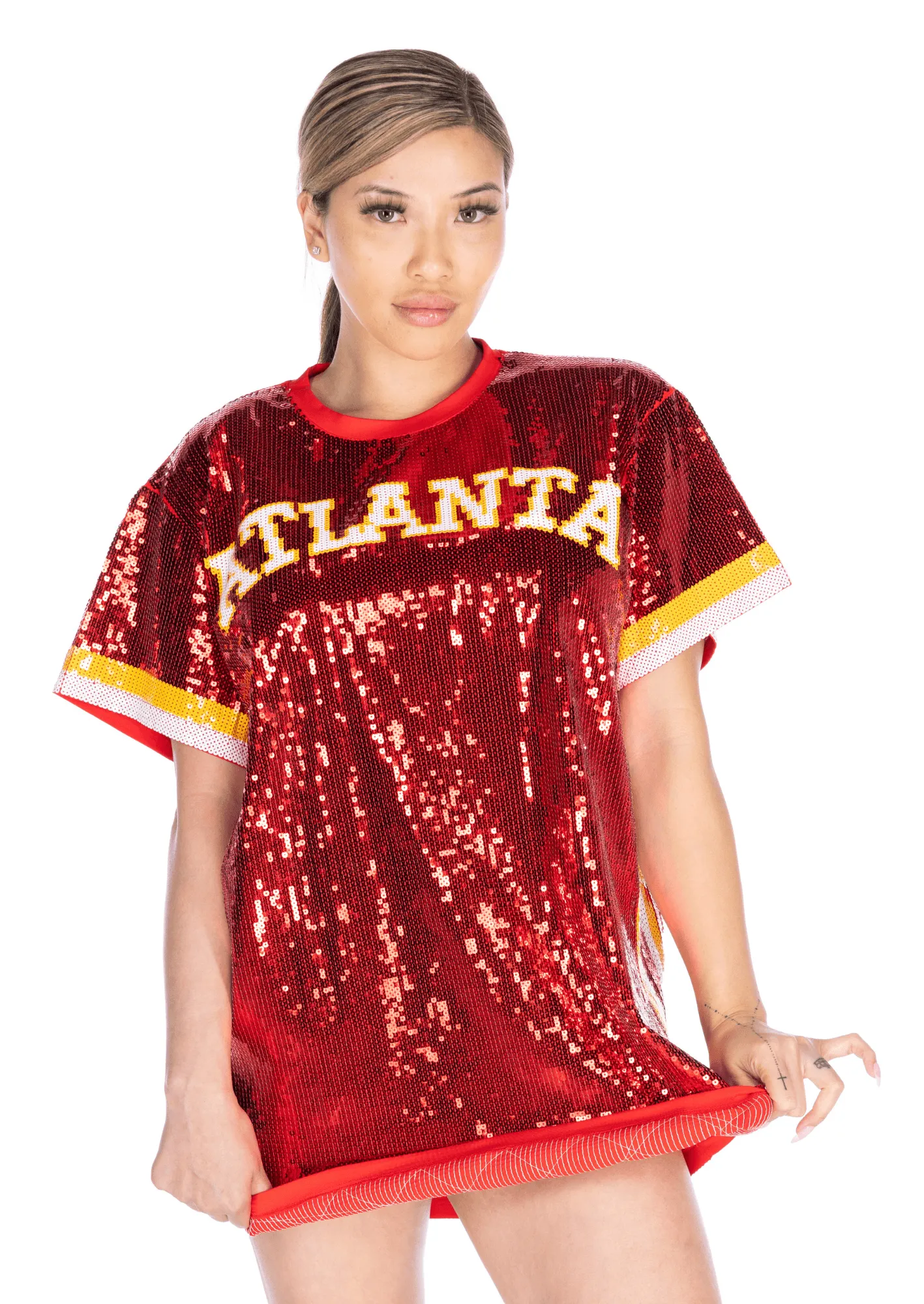Designed by the Sequin Fans brand, this stunning Atlanta Basketball Sequin Jersey Dress beautifully showcases your love for the Atlanta Basketball team. Step into the stadium or into any game day party with confidence and style with this sports glam basketball jersey dress, perfect for parties that go from day to night.