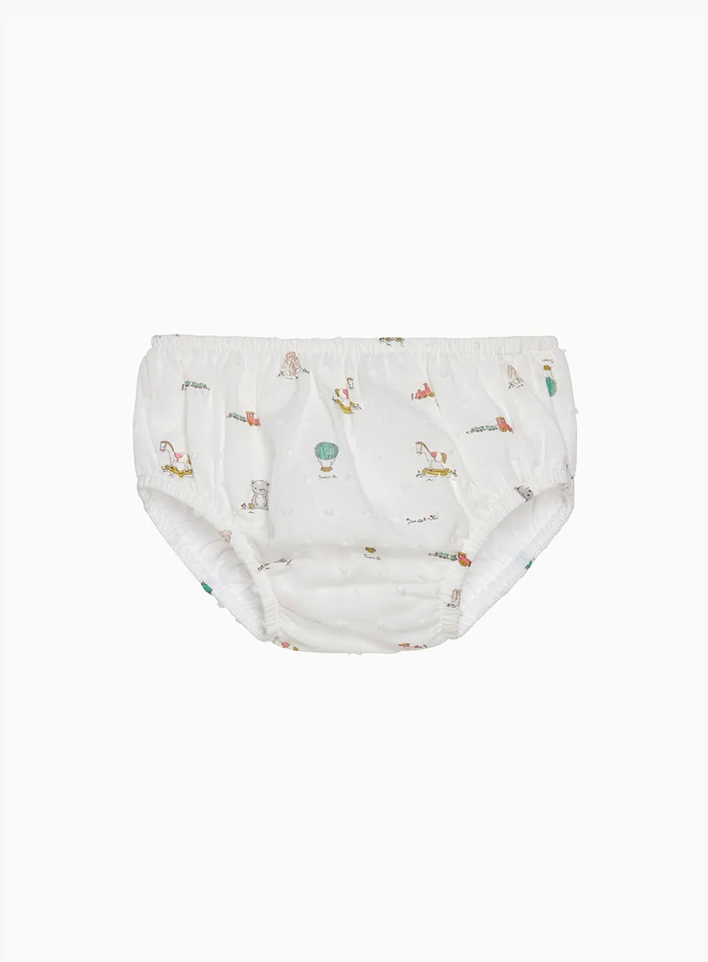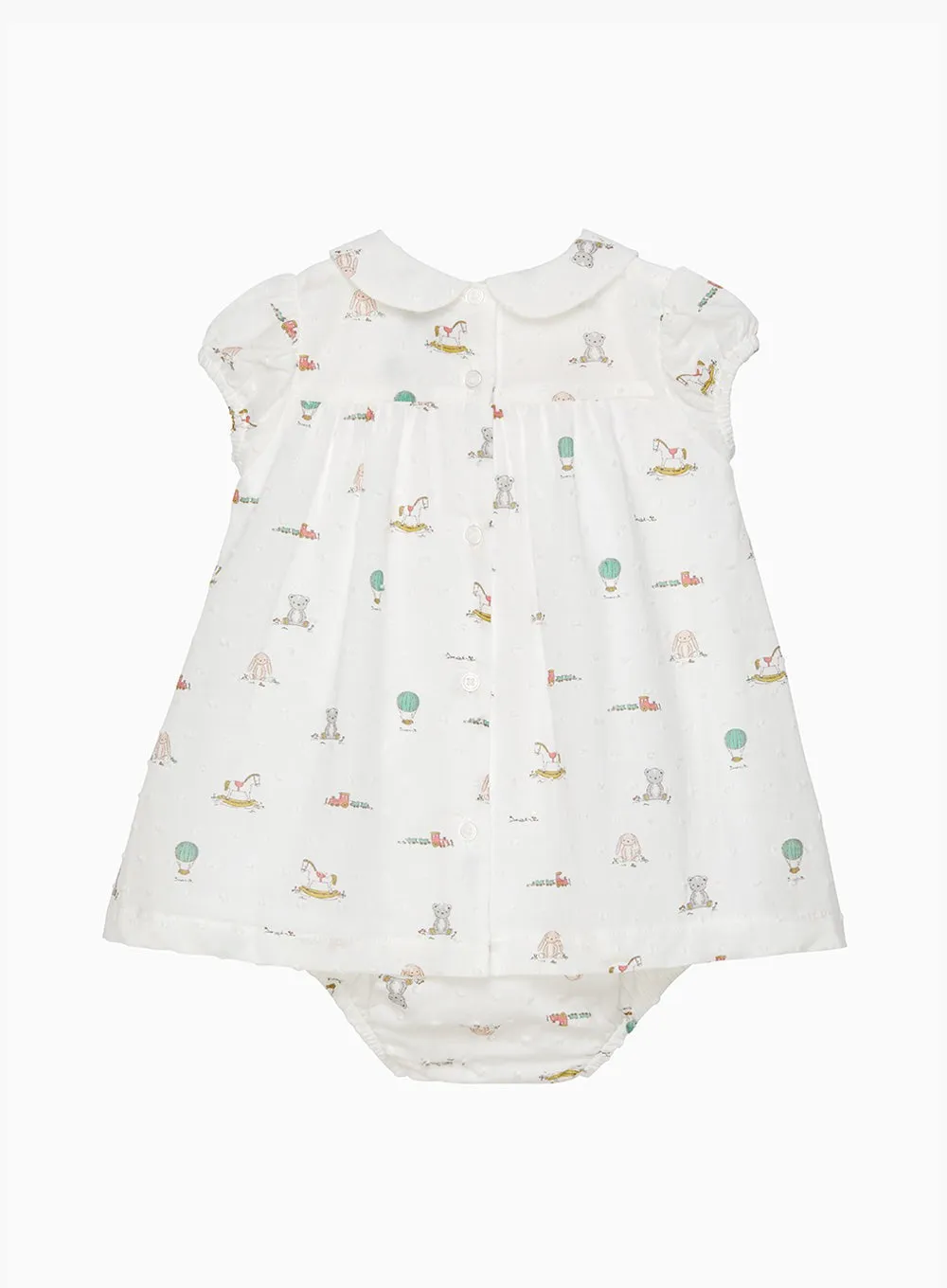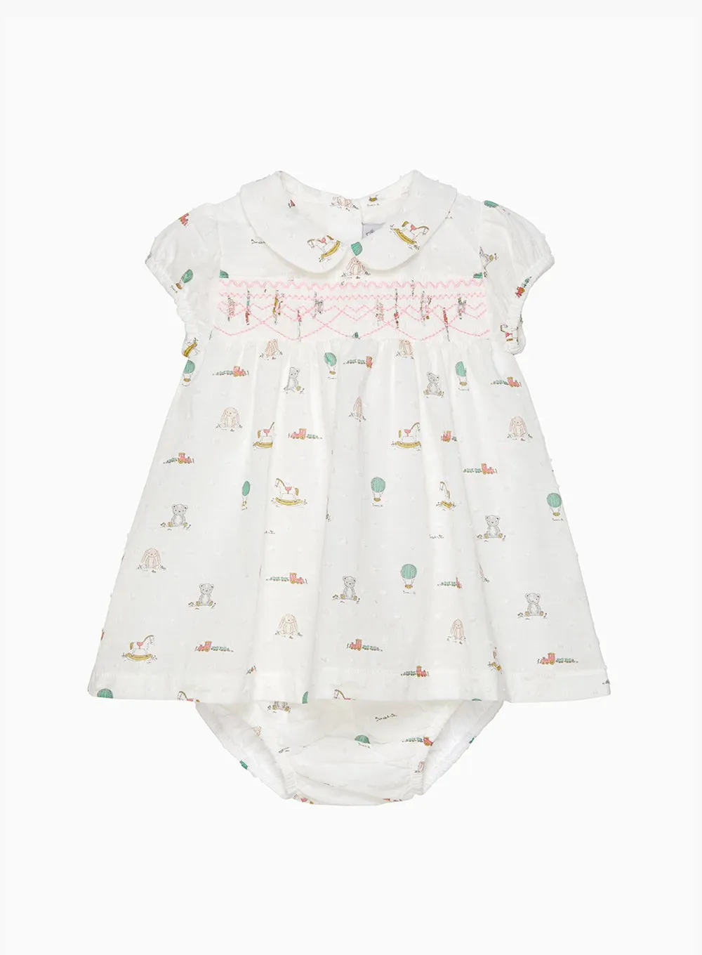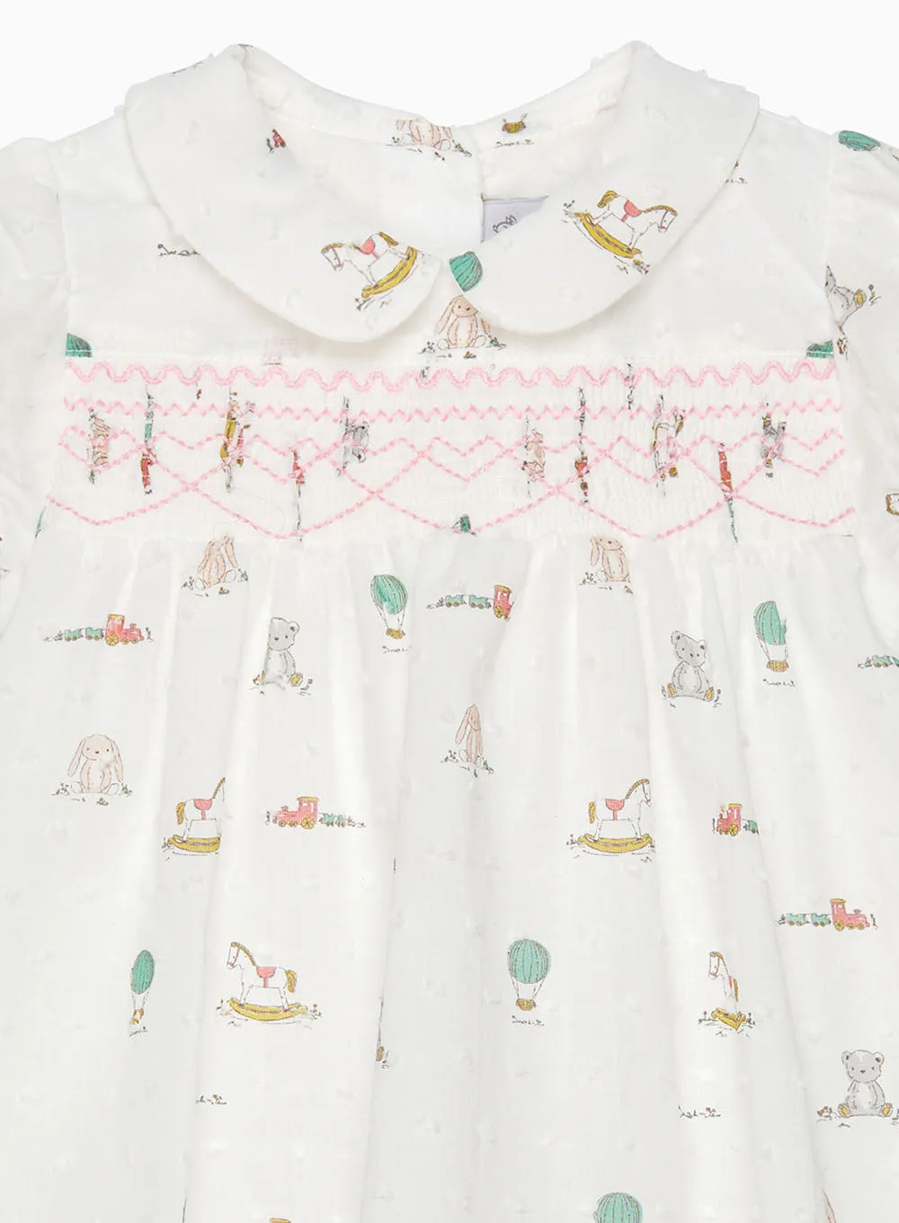 This adorable smocked dress for newborns, is made in a beautiful plumetis fabric with an all-over print featuring sweet bunnies, trains, hot air balloons, rocking horses and teddies. Complete with delicate smocked panel across the front, it features a matching self fabric Peter Pan collar. Fully cotton lined, it's sold with a pair of matching knickers for the ultimate baby girl outfit.