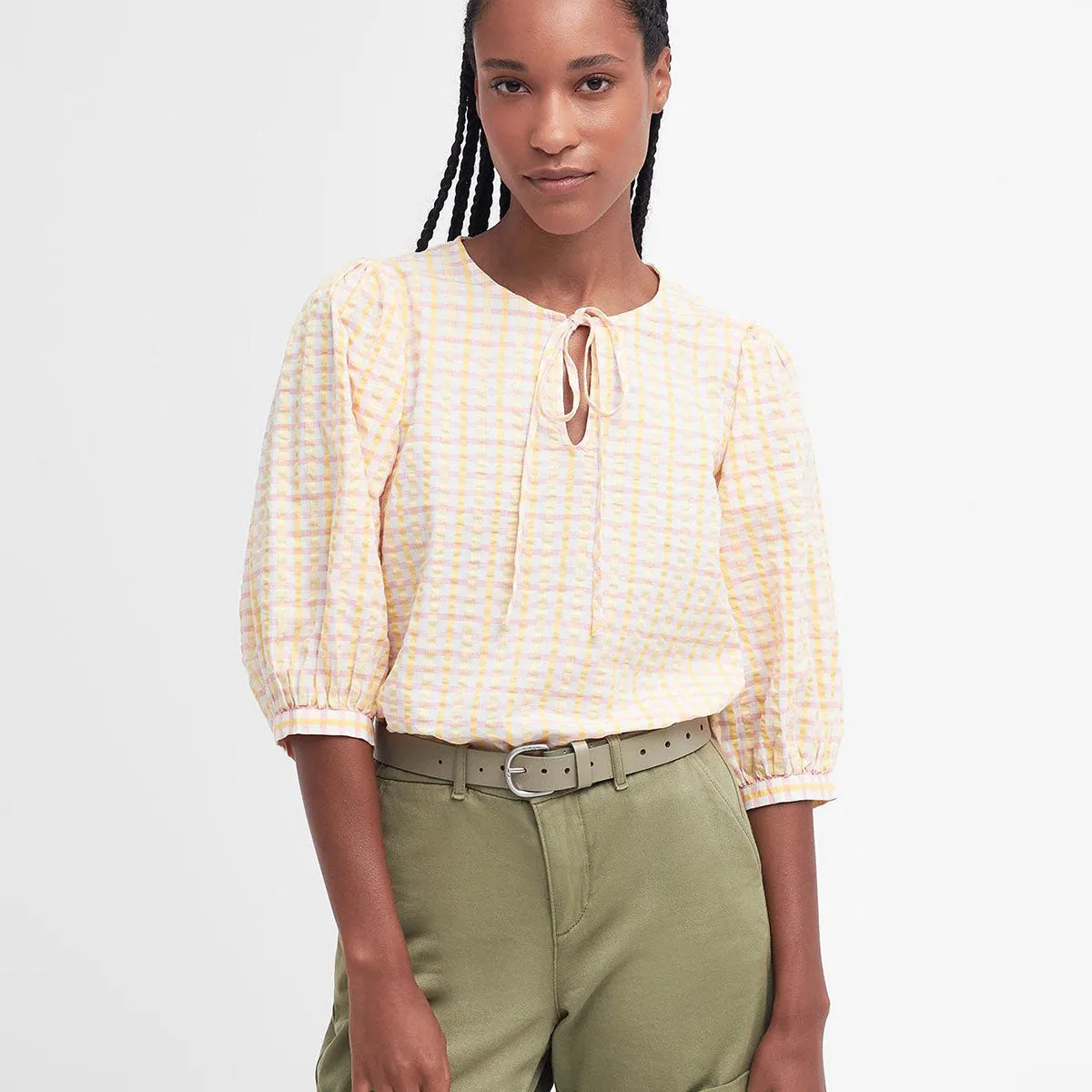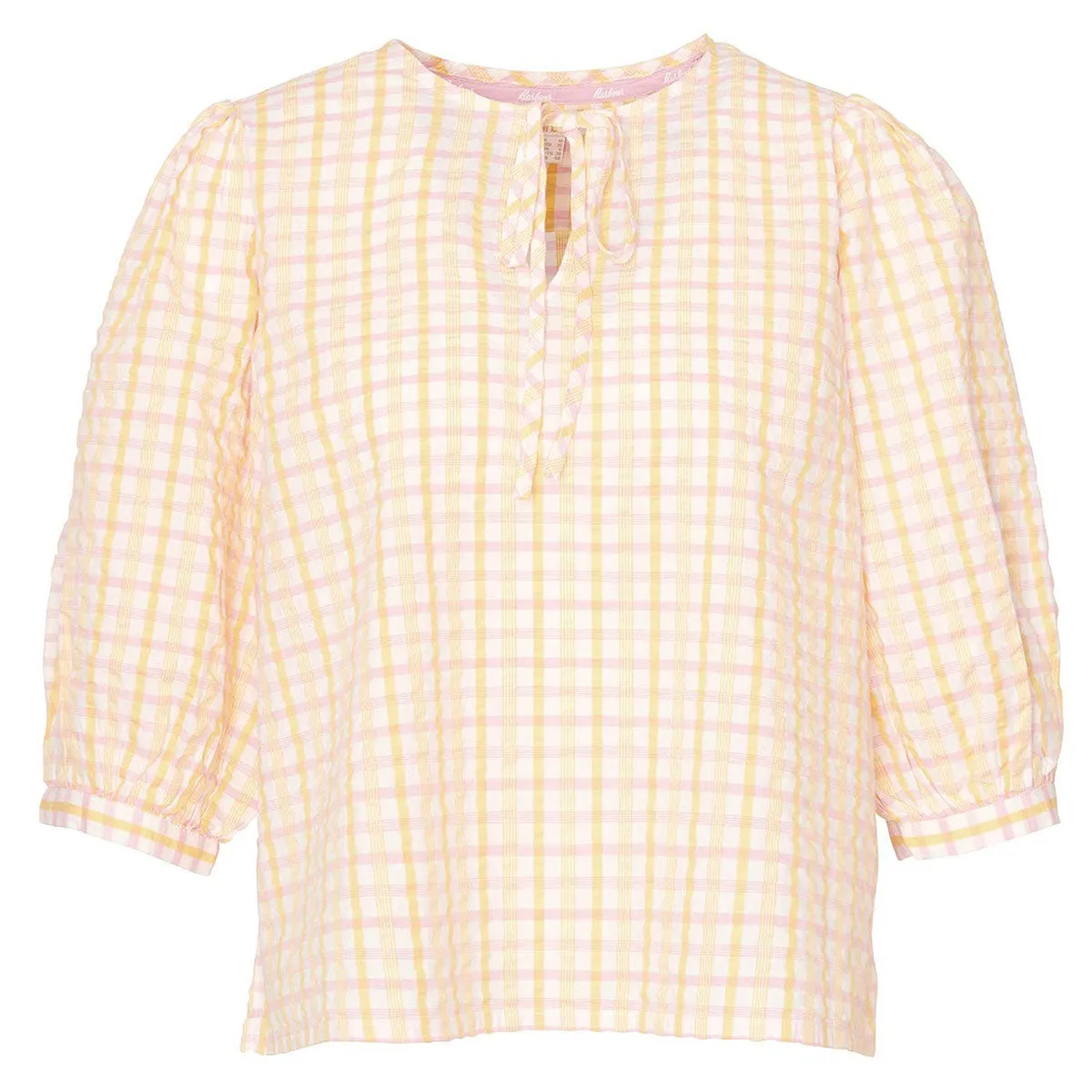 If you're looking for an alternative to your trusty T-shirts this summer, the Barbour Belmont Seersucker Blouse is the perfect choice. Featuring a pastel gingham print, it's complemented by a sweet neck-tie and puff sleeves with imitation mother-of-pearl for an elegant finishing touch.