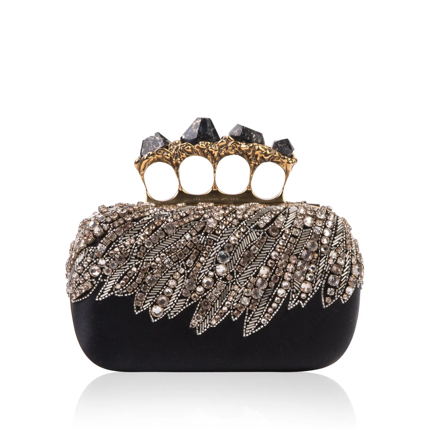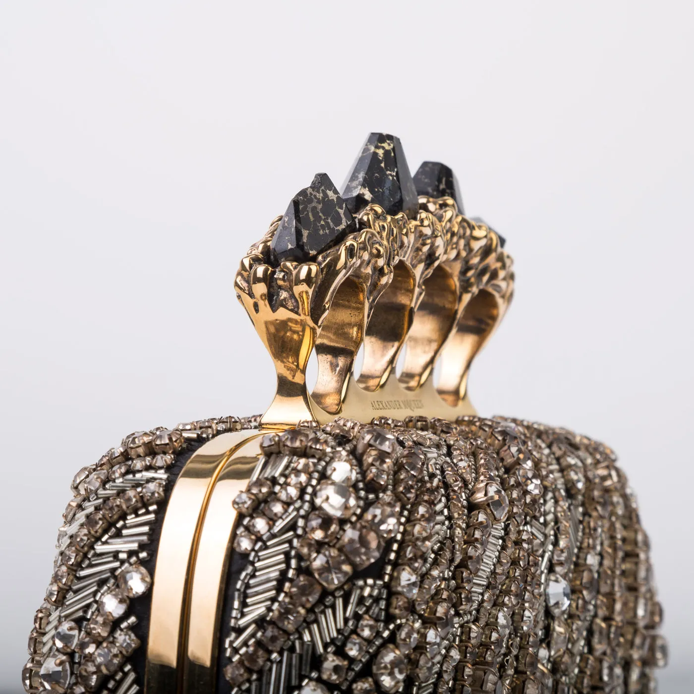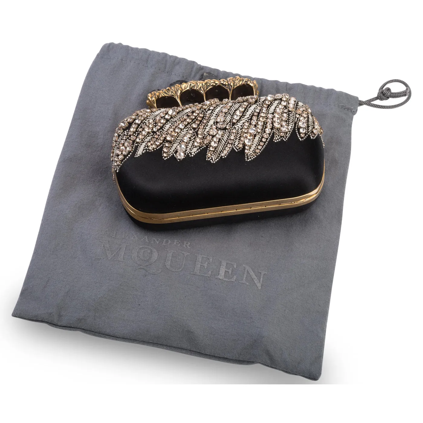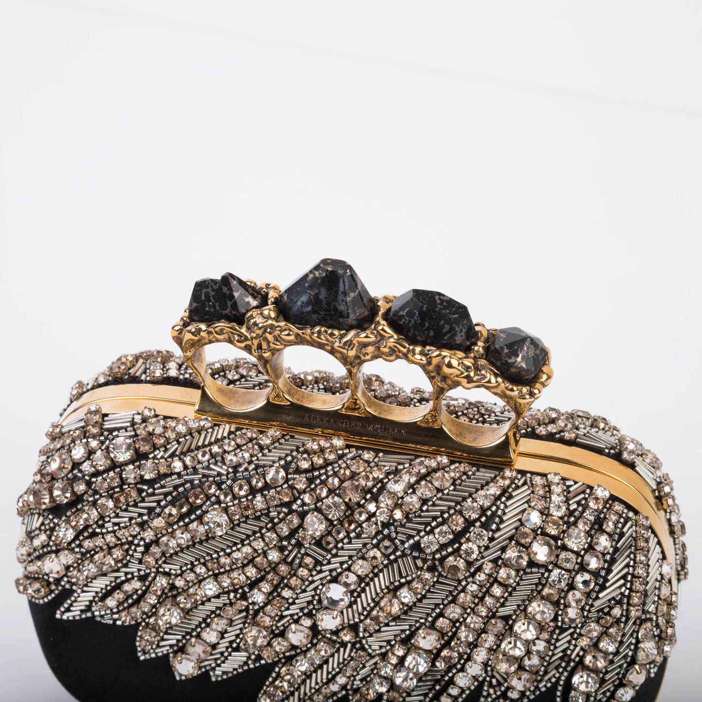 Alexander McQueen presents their classic Knuckle Box clutch with an exquisite and unique twist. With a black satin body, featuring crystal and sequin embellishment, this clutch is the perfect essential for a glamorous night out. Carry your small, evening necessities inside the single compartment while making an elegant statement. Chic, sophisticated, and definitely an eye catcher - this bag will make you stand out from any crowd.?ÿ