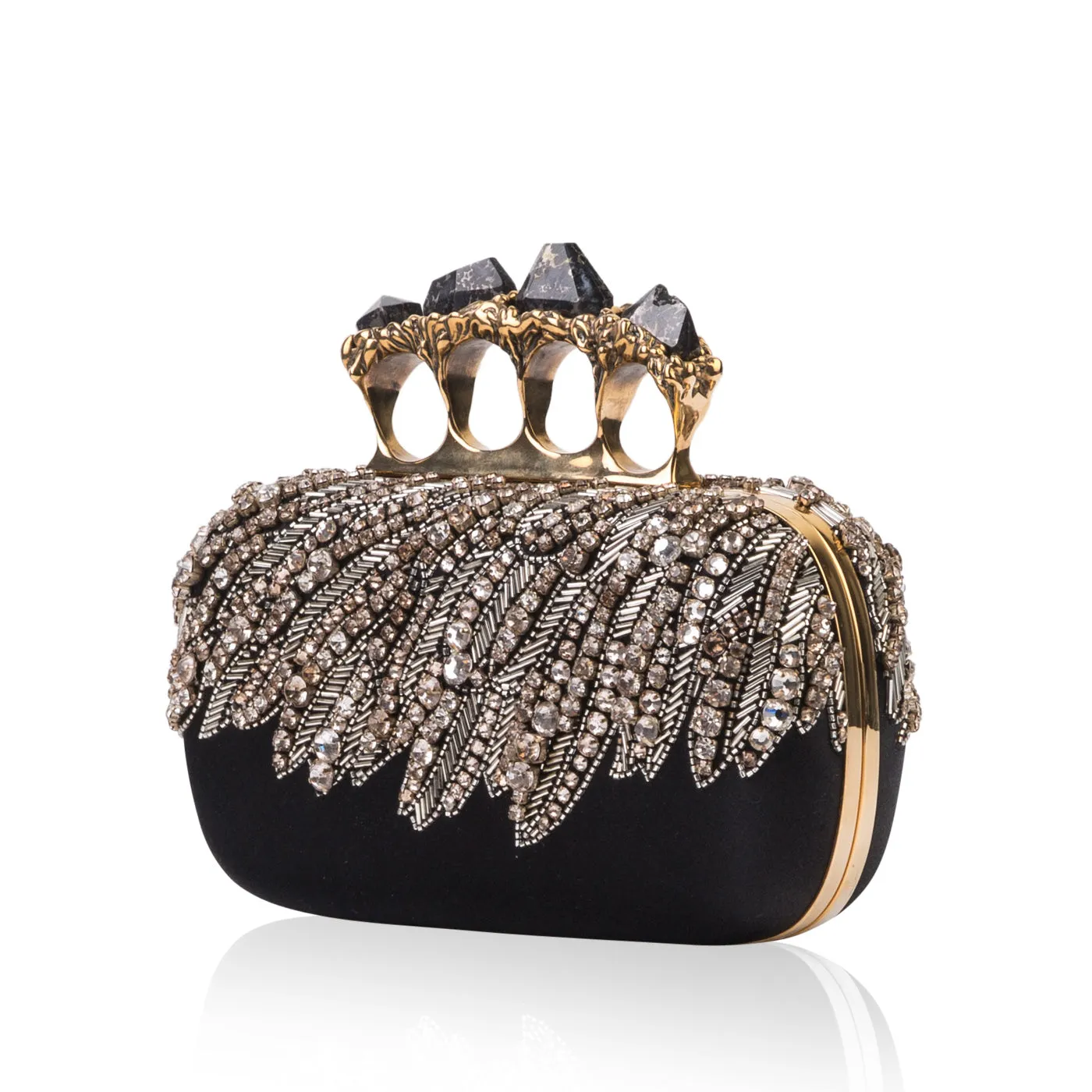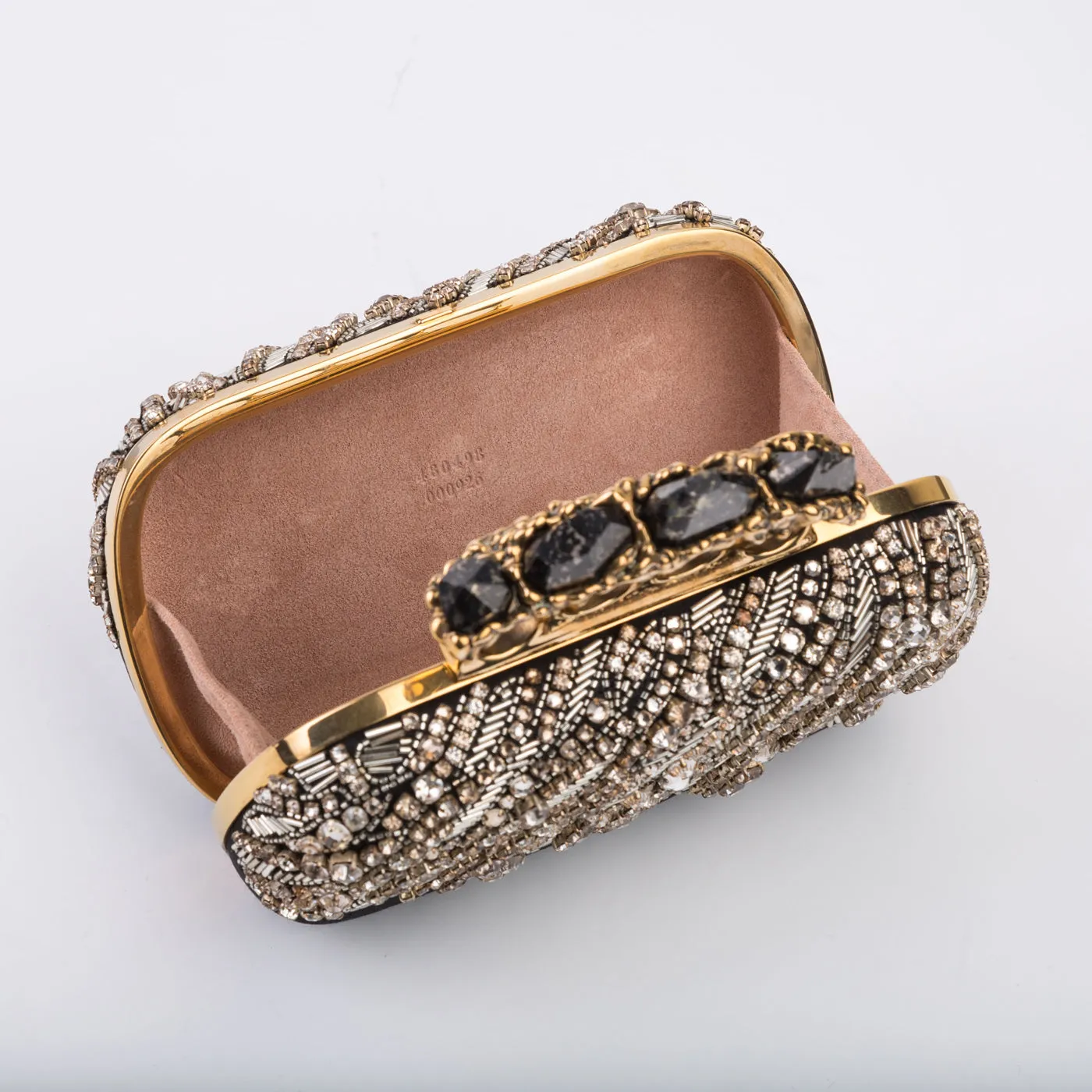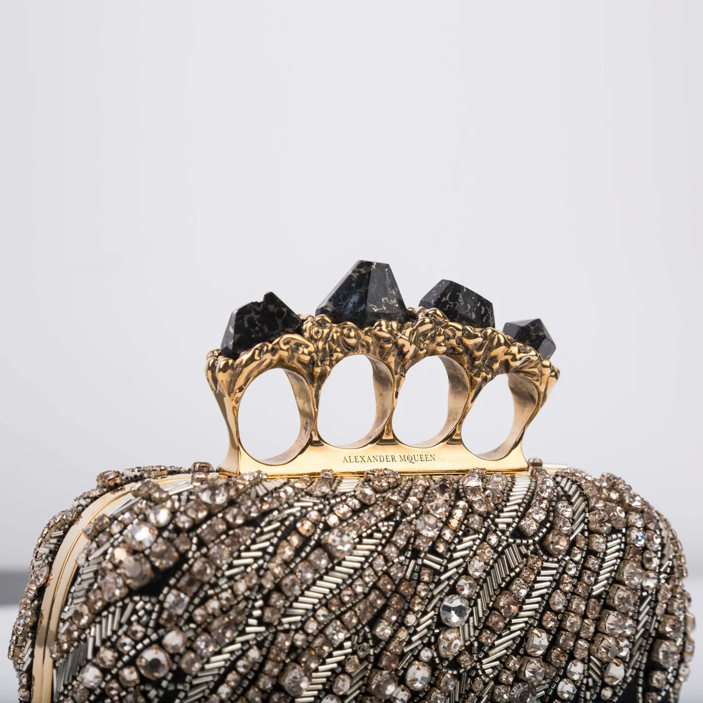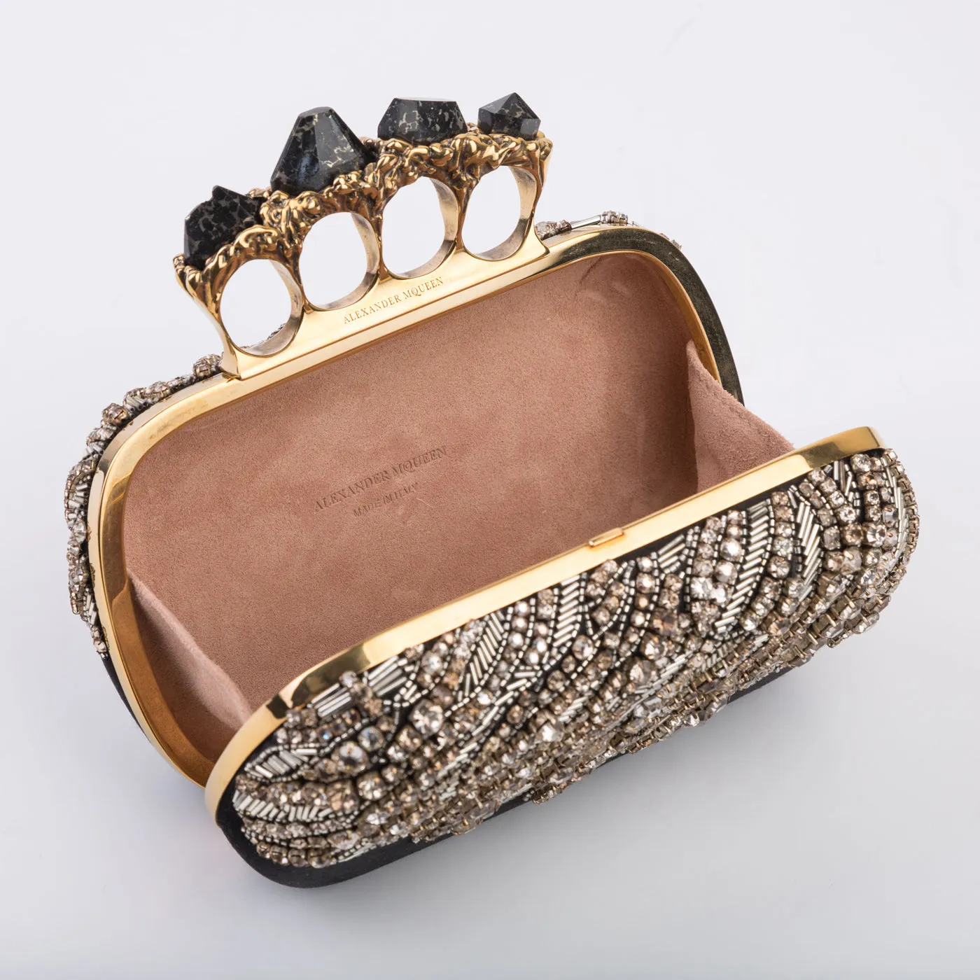 Alexander McQueen presents their classic Knuckle Box clutch with an exquisite and unique twist. With a black satin body, featuring crystal and sequin embellishment, this clutch is the perfect essential for a glamorous night out. Carry your small, evening necessities inside the single compartment while making an elegant statement. Chic, sophisticated, and definitely an eye catcher - this bag will make you stand out from any crowd.?ÿ