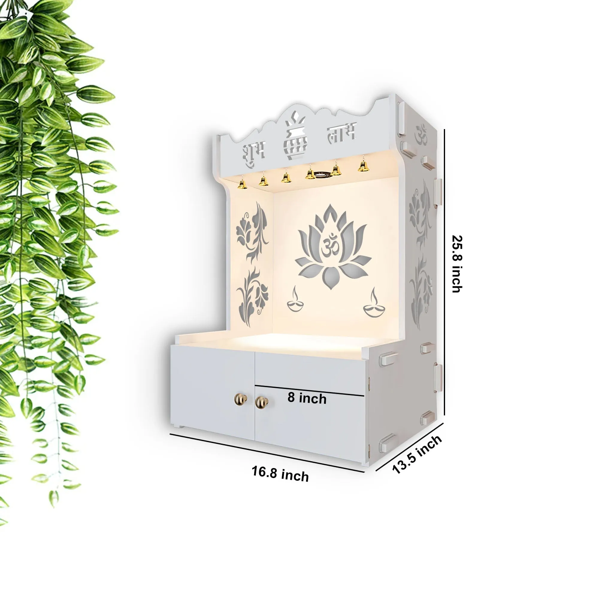 Beautiful Lotus Pattern White Wooden Wall Temple for Home With Inbuilt focus Lights & Spacious Shelf