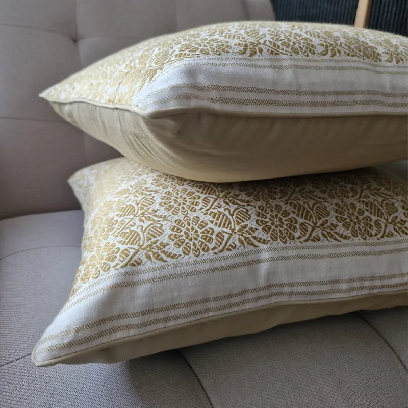 Elegant Beige & White Eri Silk Pillow Cover with a beautiful hand woven jacquard pattern from Assam, a state in the North East Part of India. Perfect to add subtle colour and texture to your living spaces.
