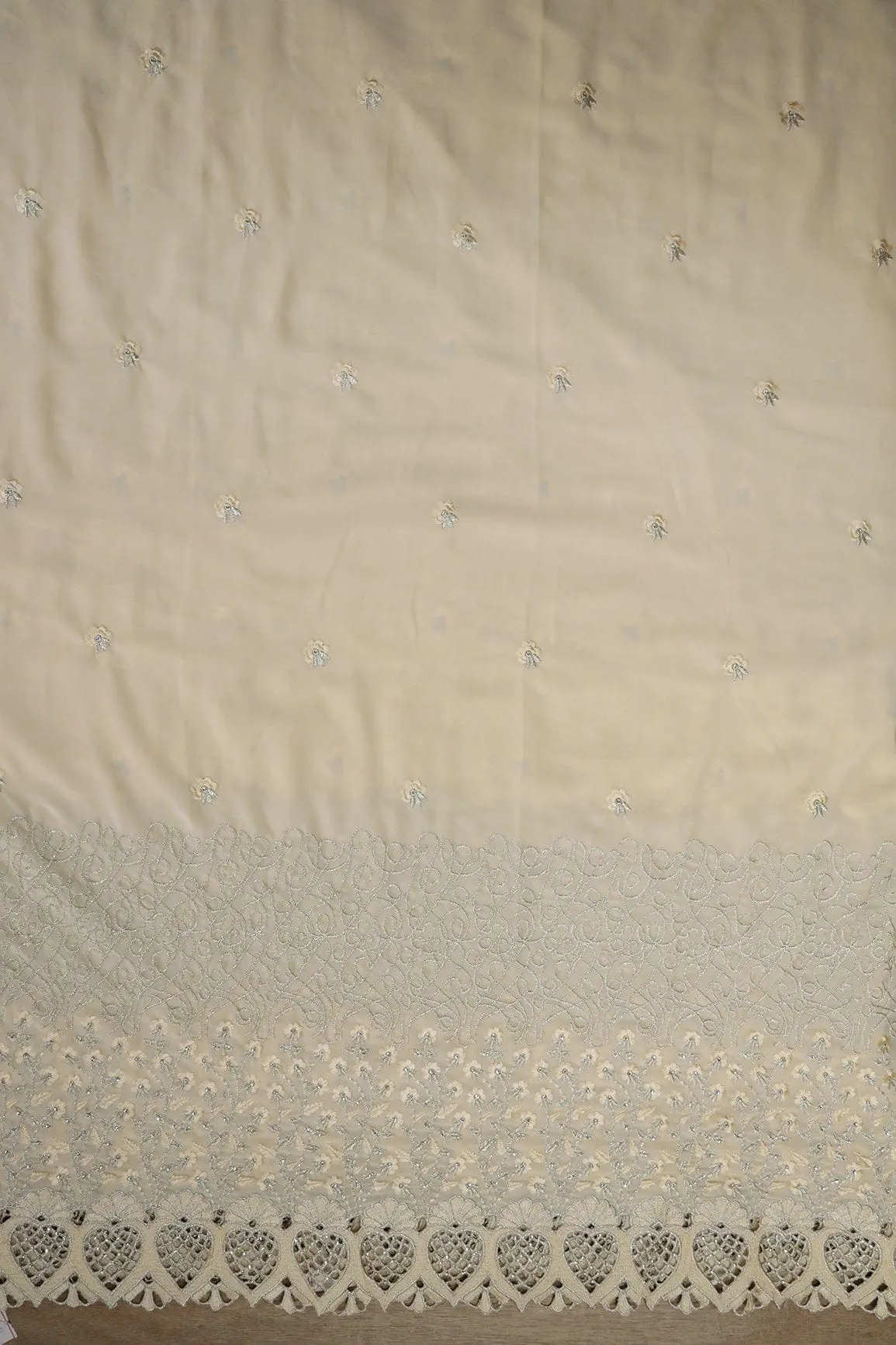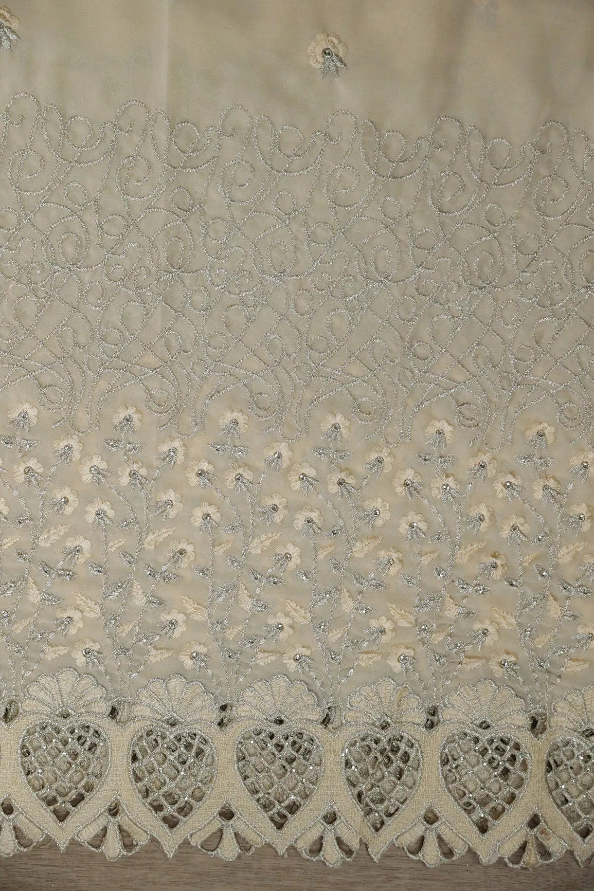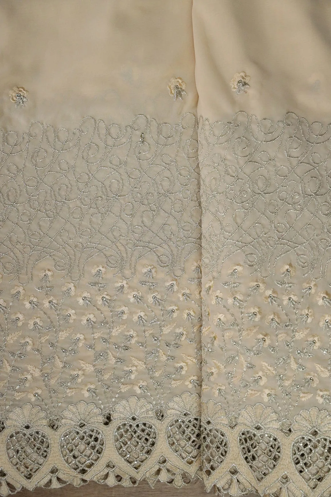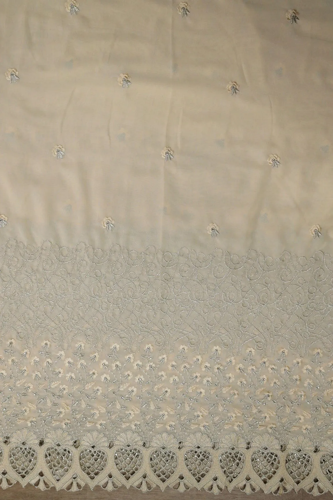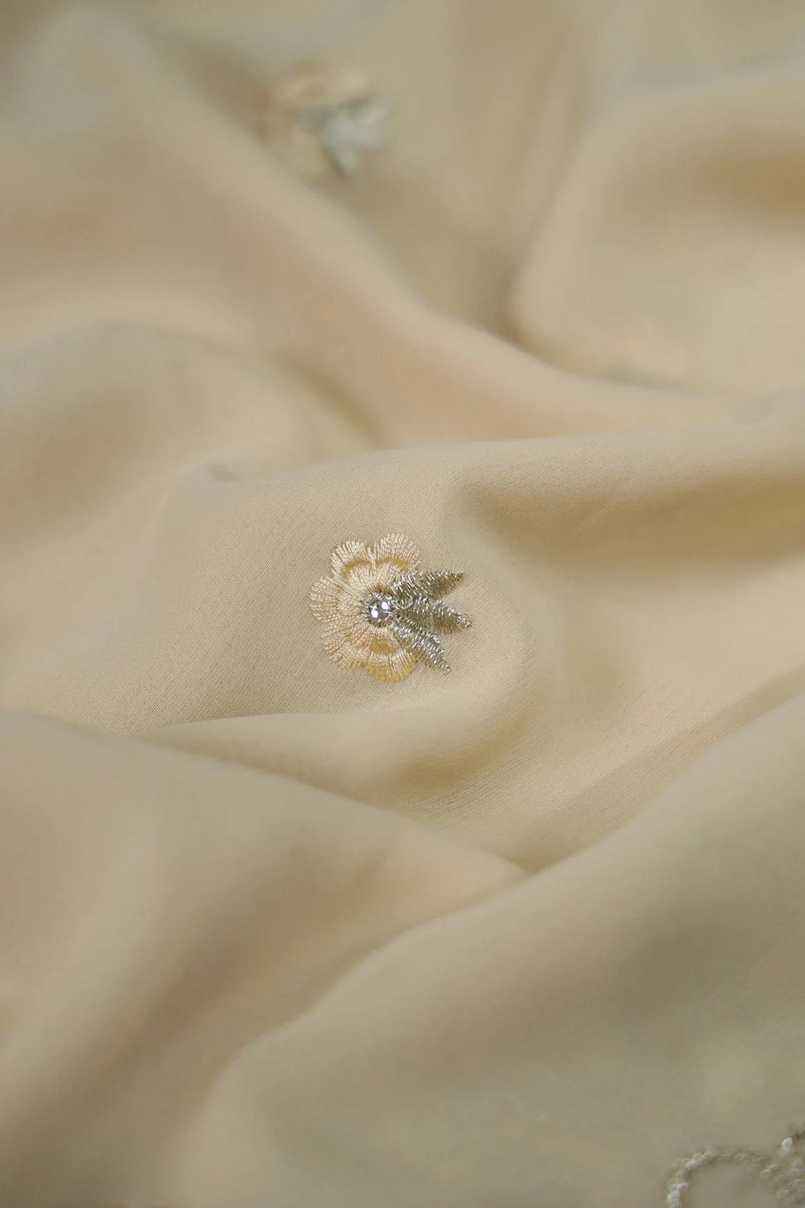 Big Width''56'' Cream Thread With Zari Floral Embroidery Work On Cream Georgette Fabric With Border