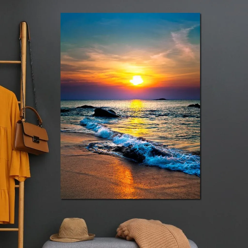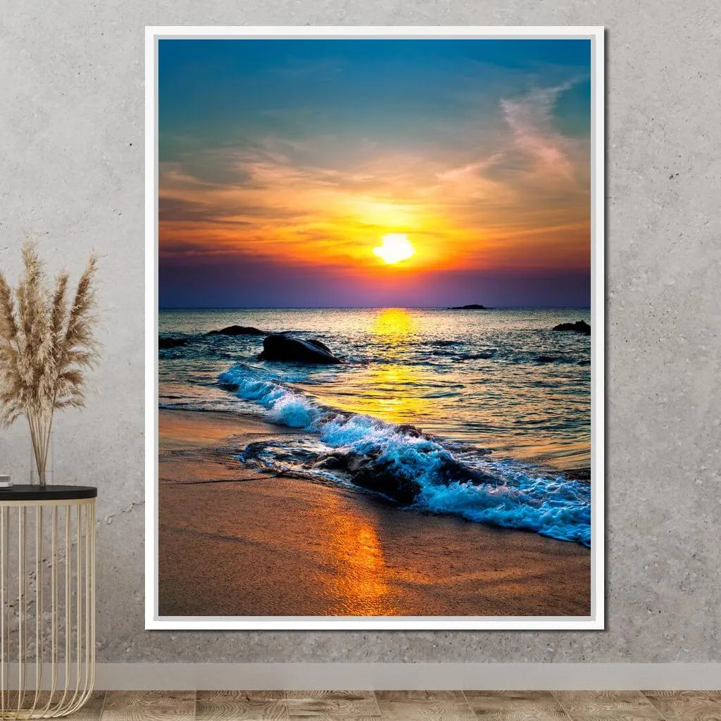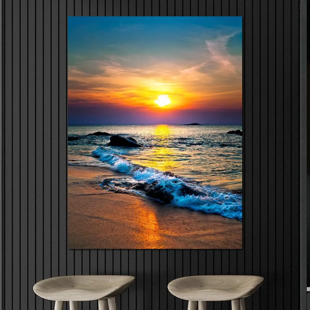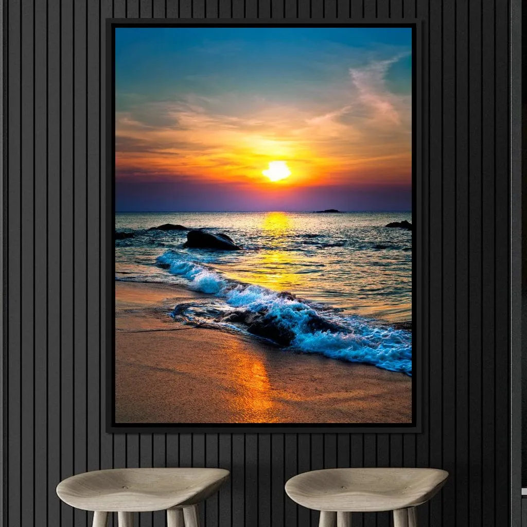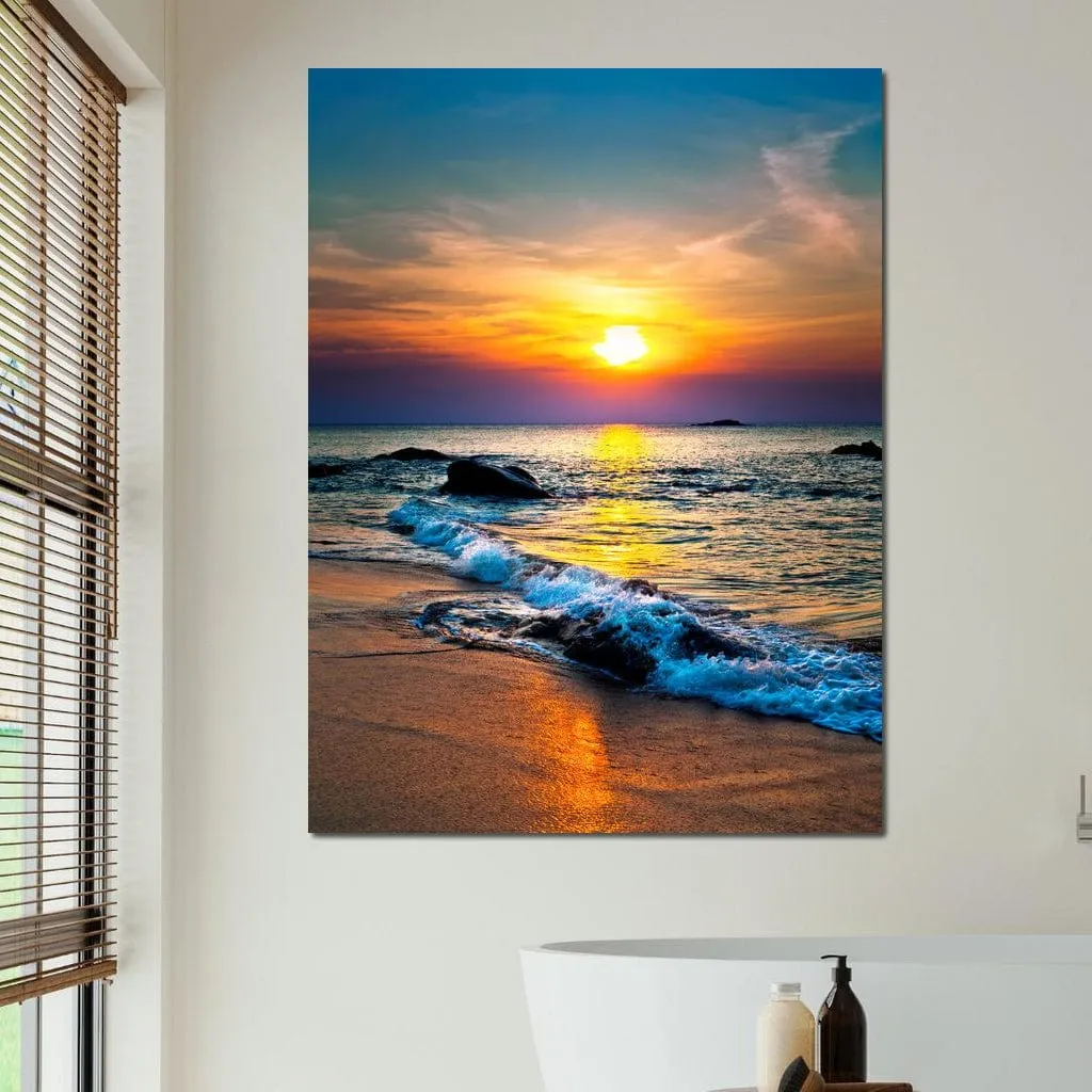 Bring the beauty and tranquility of a tropical sunset ocean view into your home with our Black Sand Beach Sunset Canvas Print. This bestseller features vivid black sand contrasting against the bright orange and pink sky, providing an eye-catching addition to your bathroom or any room in the house. Let the stunning imagery and colorful beach landscape take you away from the hustle and bustle of daily life, providing you with a much-needed escape. Elevate your space with this stunning wall art, sure to become a conversation starter and perfect for adding a touch of summer to your interior décor.
