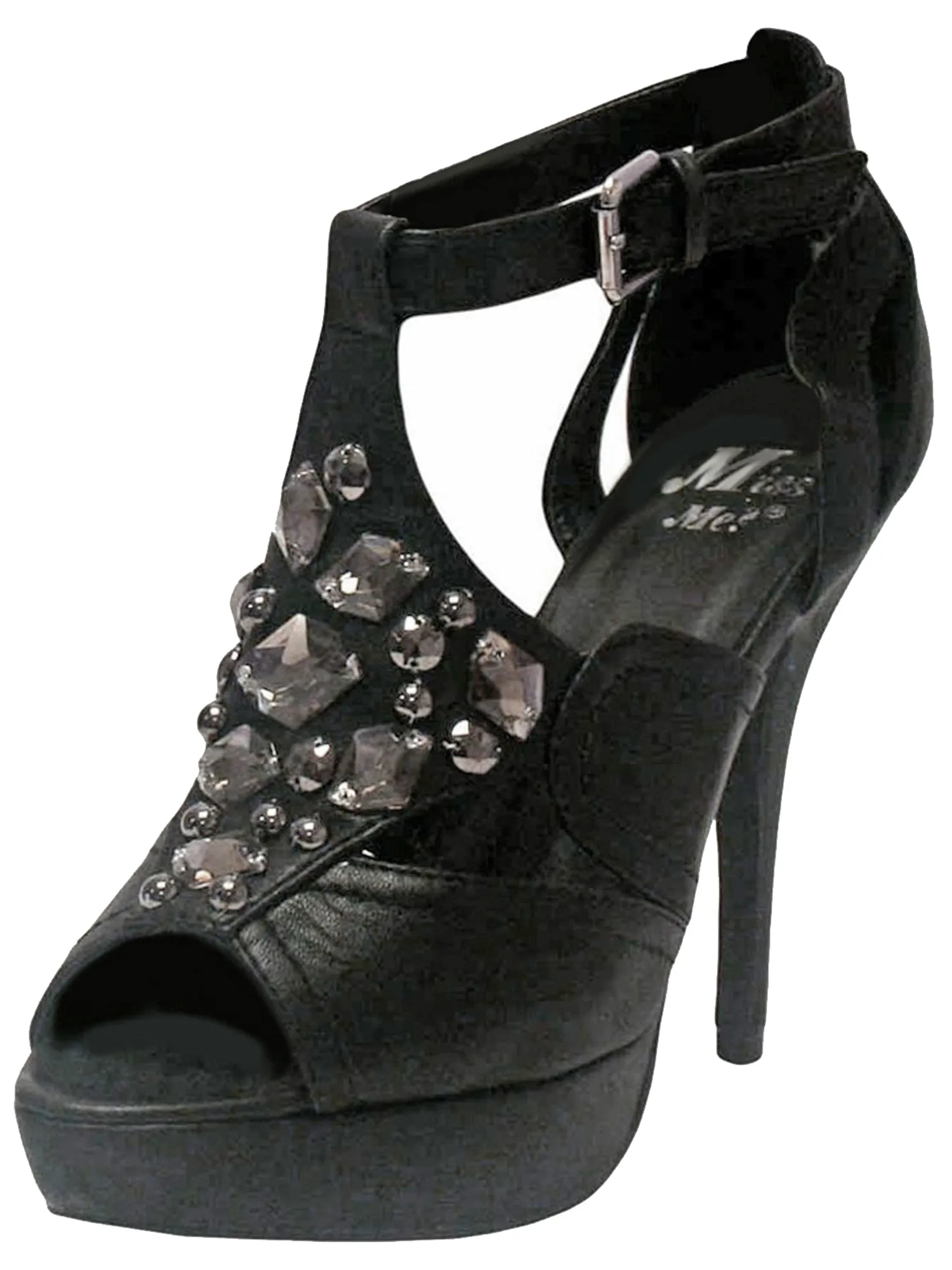 Pamper your feet with these stylish strappy high heel pumps. These have a faux gemstone and studded design on the front t-strap of the pumps. The ankle strap on these high heels is adjustable for a comfortable. Shoe measures 2.75 inches wide, at widest point, and the sole i .25 inches thick. Shoe heel measures 5 inches high from back top of heel to sole. Product measurements were taken using ladies size 7. Please note that measurements may vary by size accordingly.