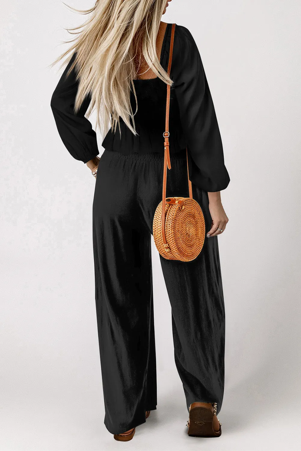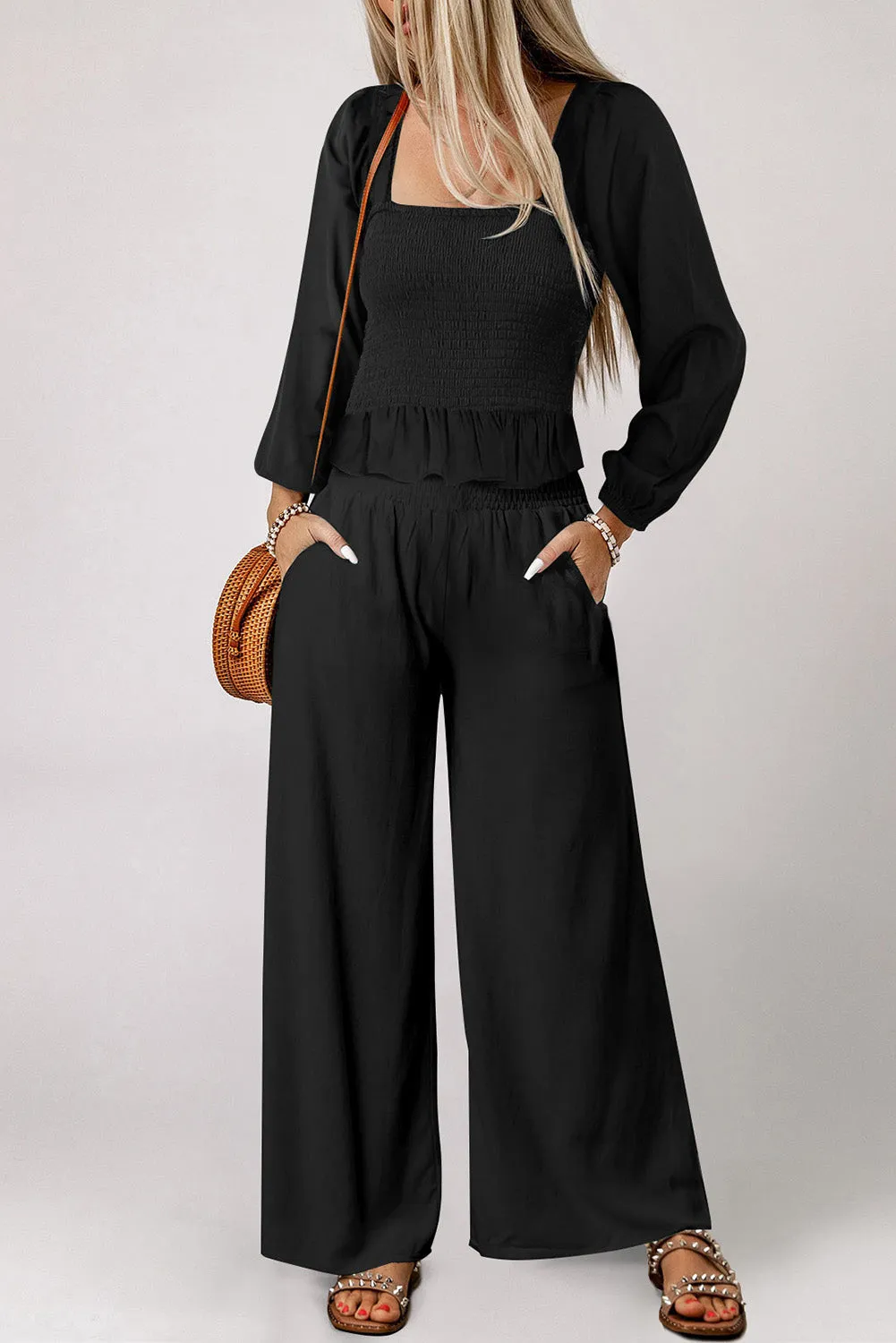 The peplum top exudes sophistication with its flattering square neck smocked bodice and playful ruffled hemline, adding a touch of femininity to your look. Meanwhile, the high-waist pants offer a relaxed fit, ensuring maximum comfort with practical side pockets.