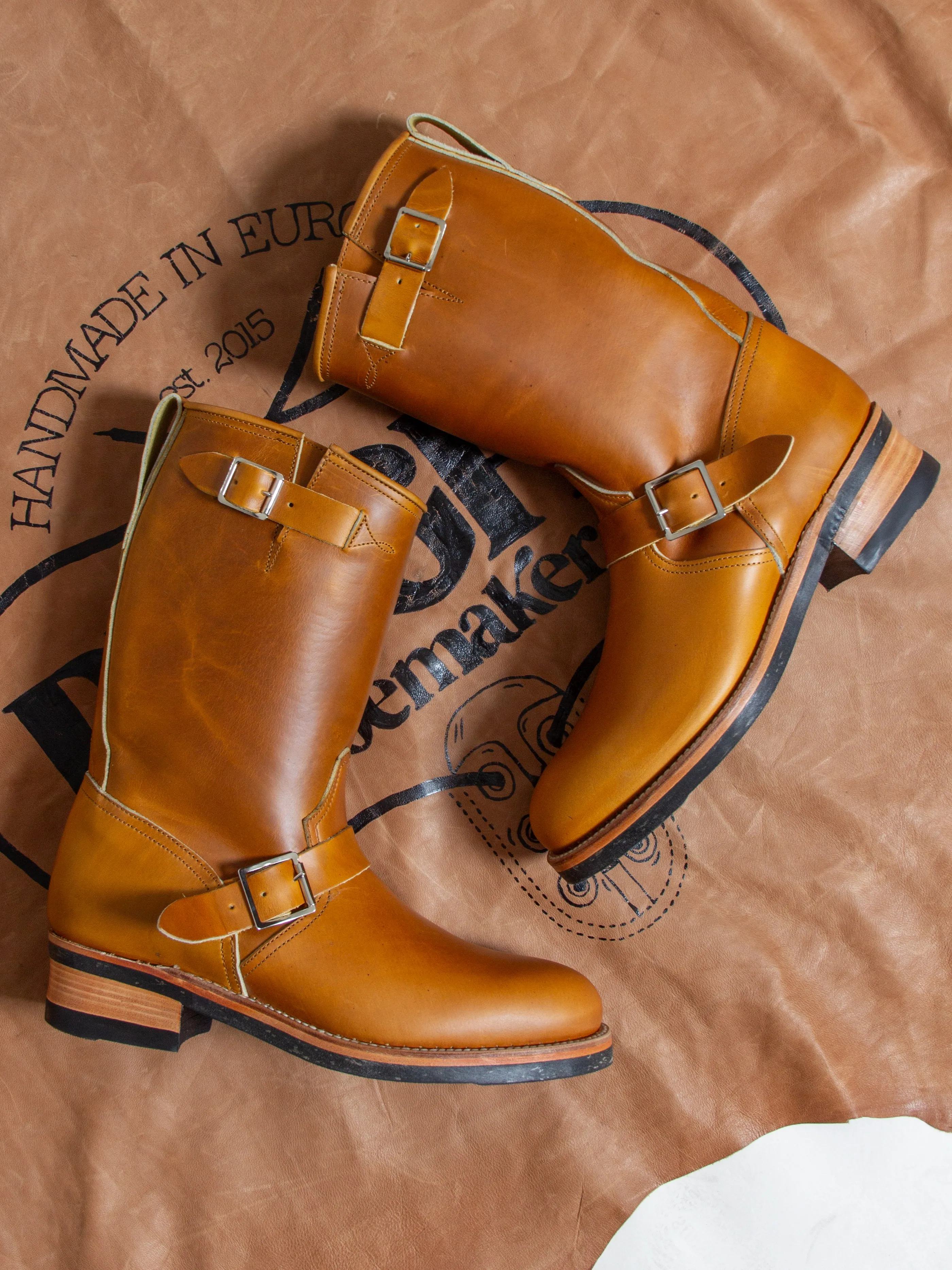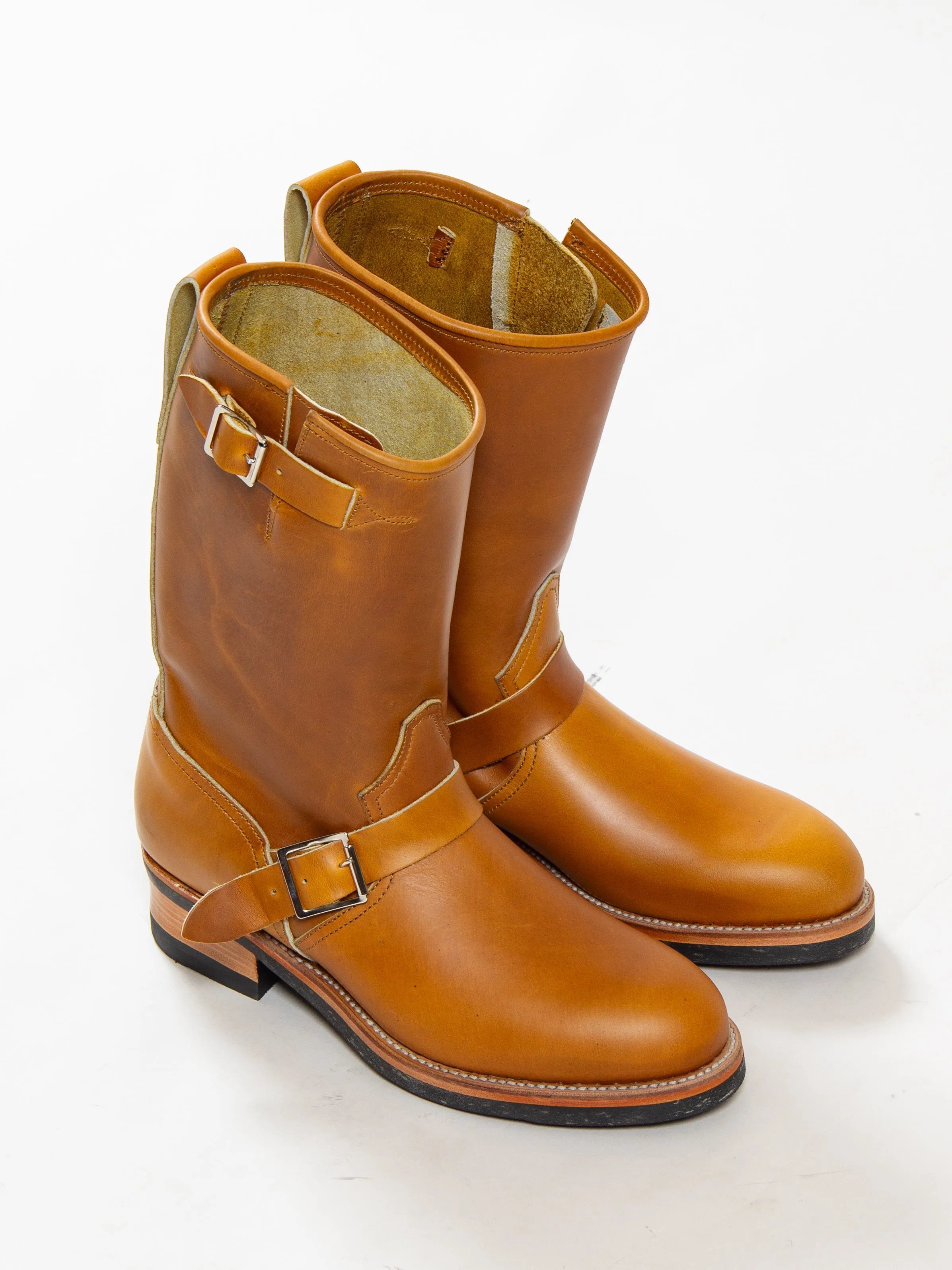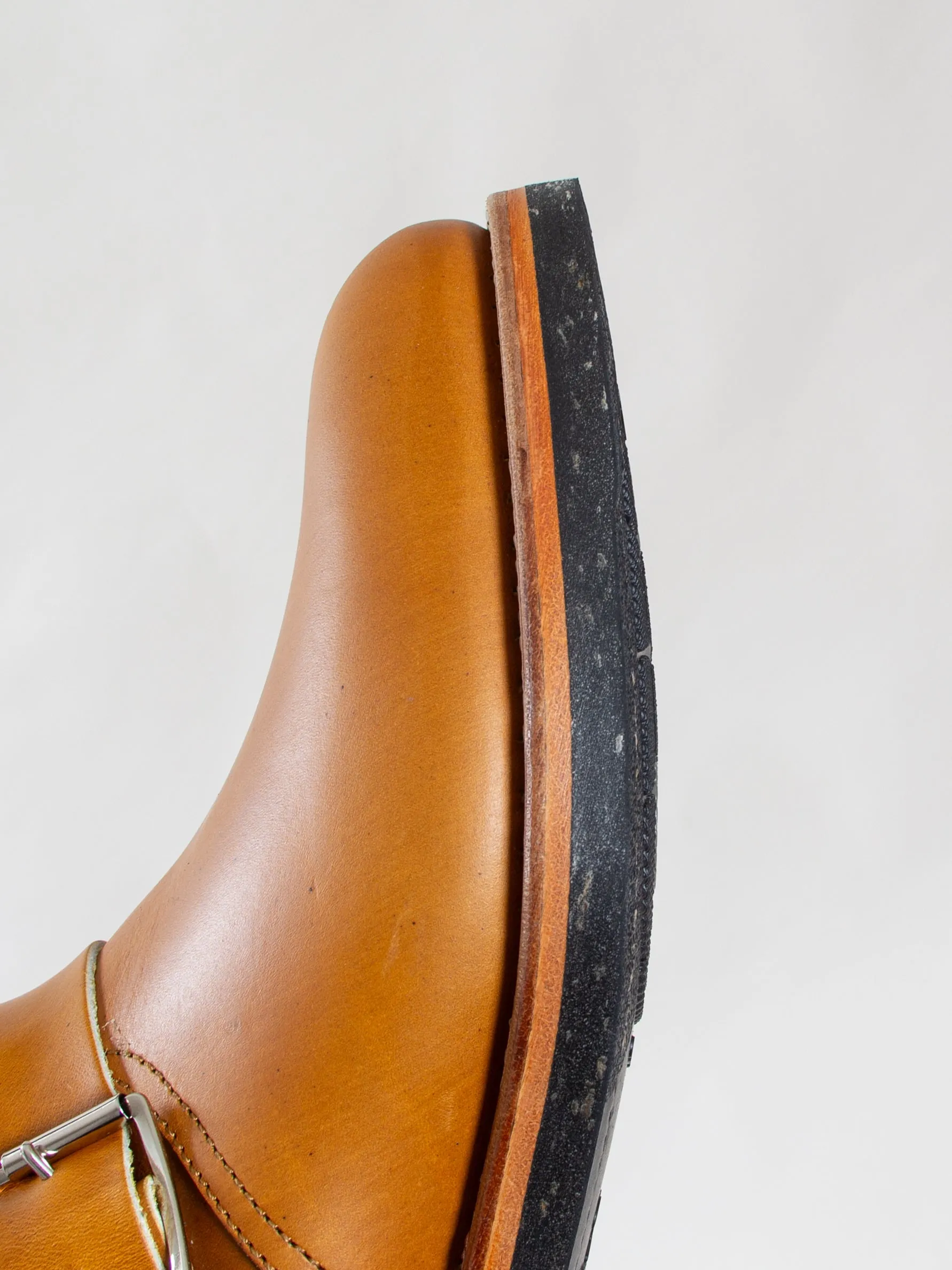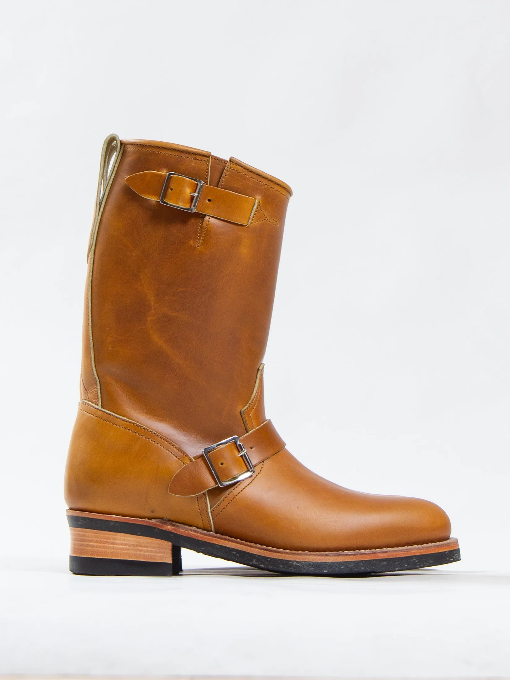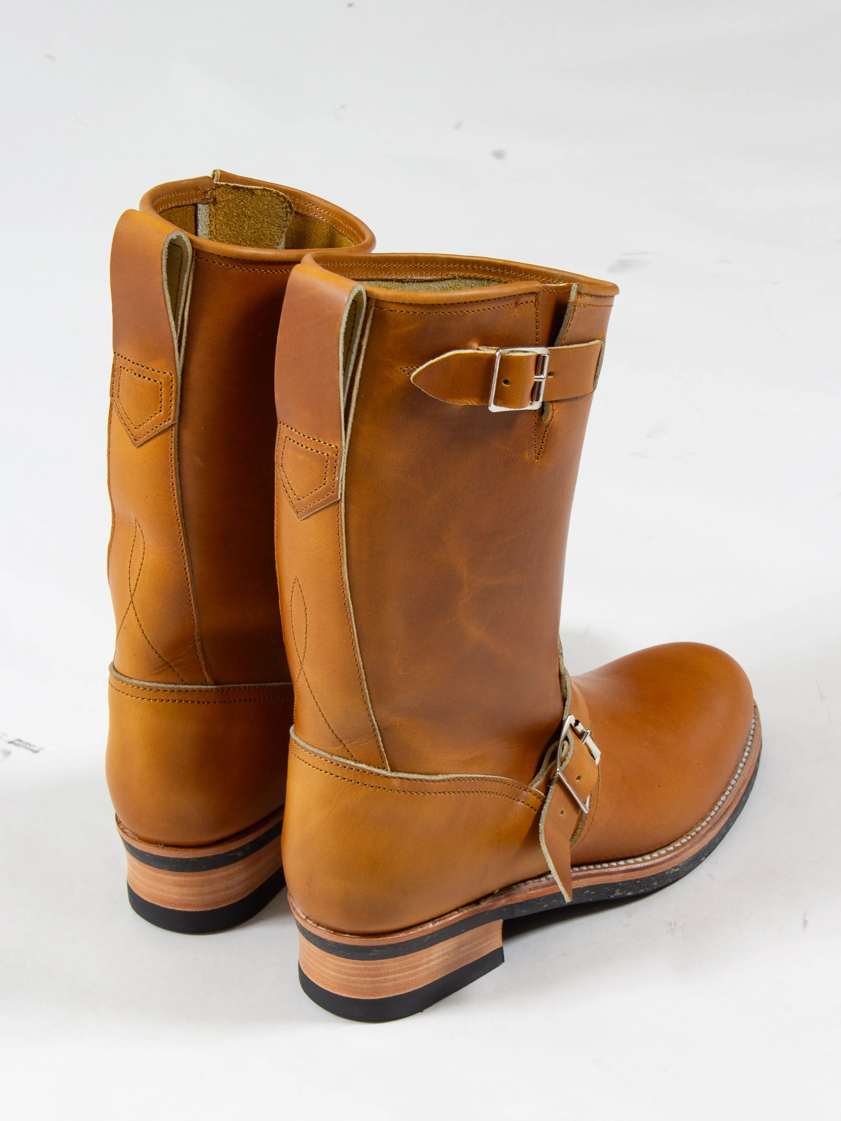 The Engineers are made with soft "ping pong" toe stiffners for the purpose of collapsing with wear, leaving room for an incredible patina of the leather.