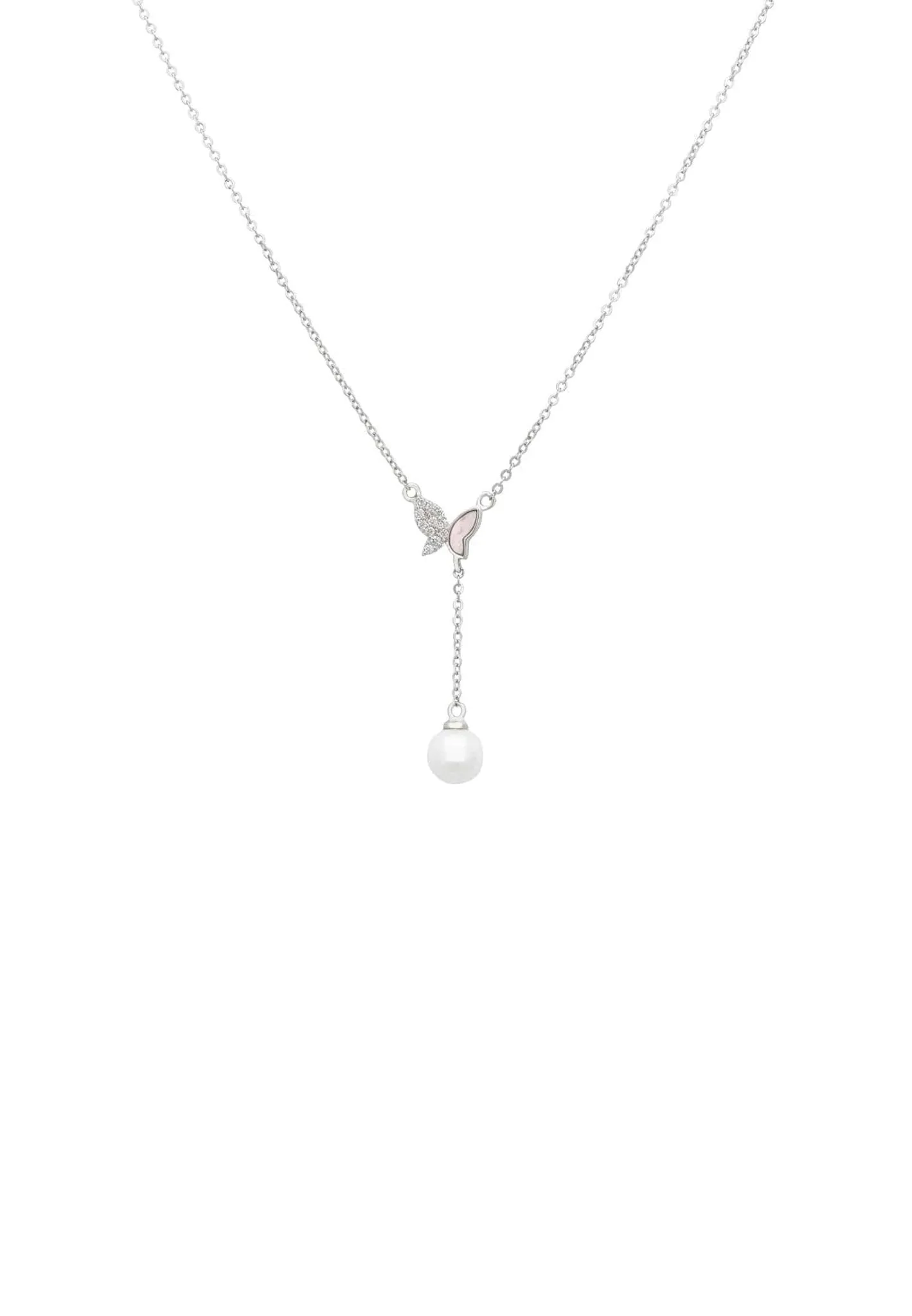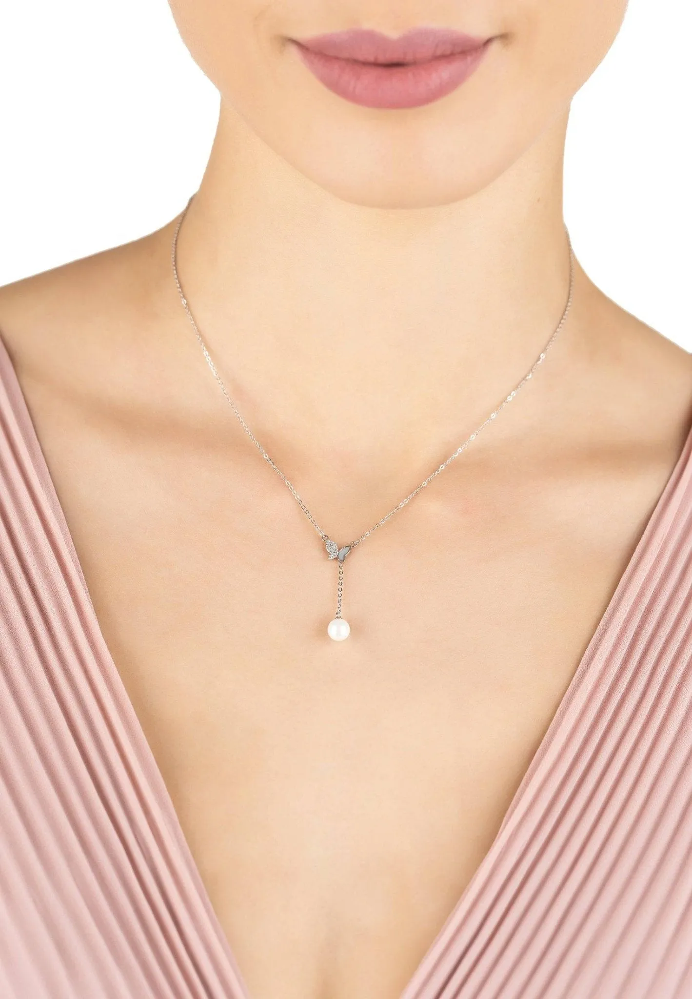 Let this butterfly pearl choker necklace be your new wardrobe staple. Ideal for those who love delicate jewellery, this gemstone necklace features a single chain with a suspended butterfly and pearl, which are separated by 1.5cm of chain. The dainty butterfly is decorated on one wing with white mother of pearl and white zirconia on the other.
