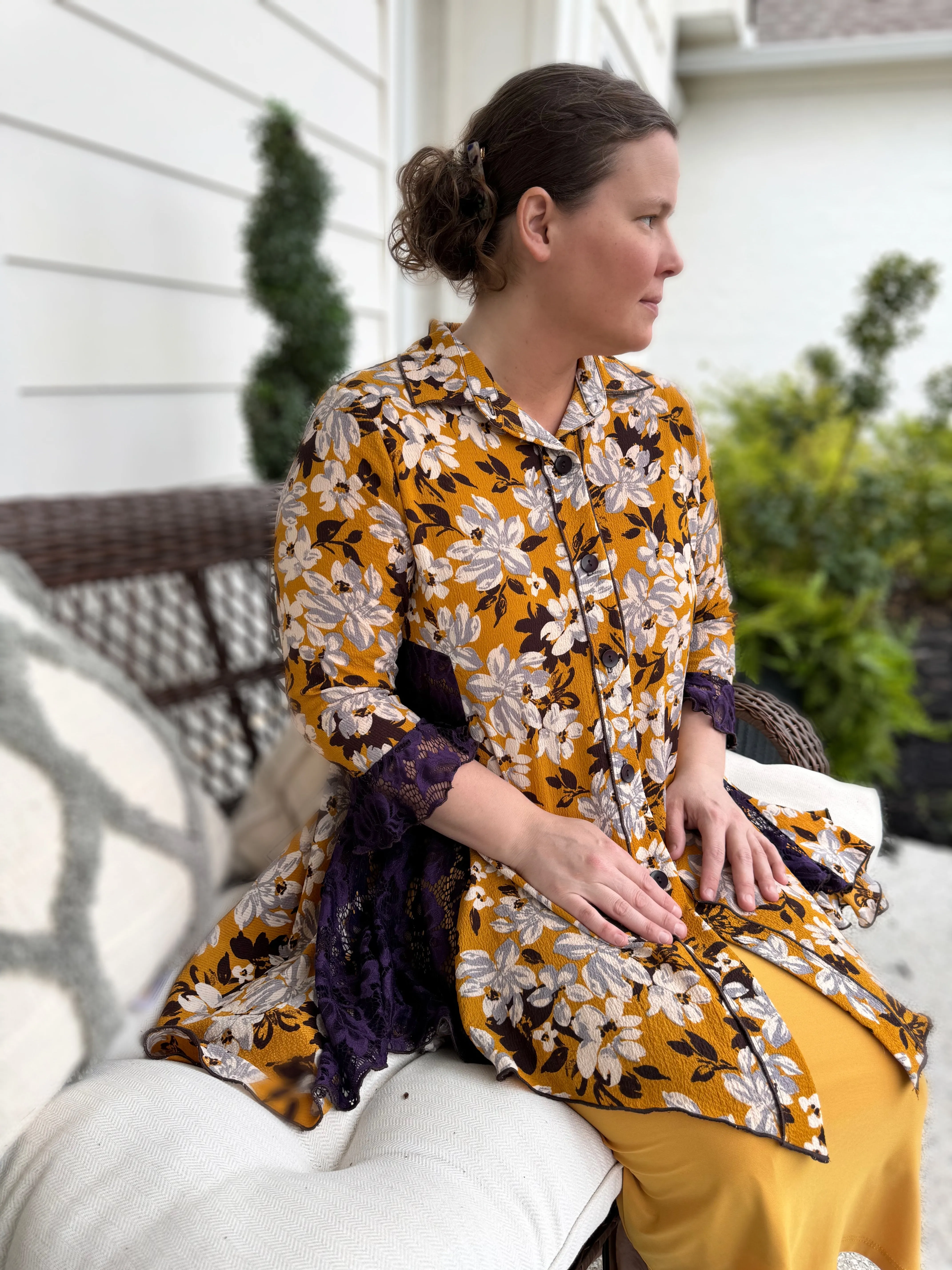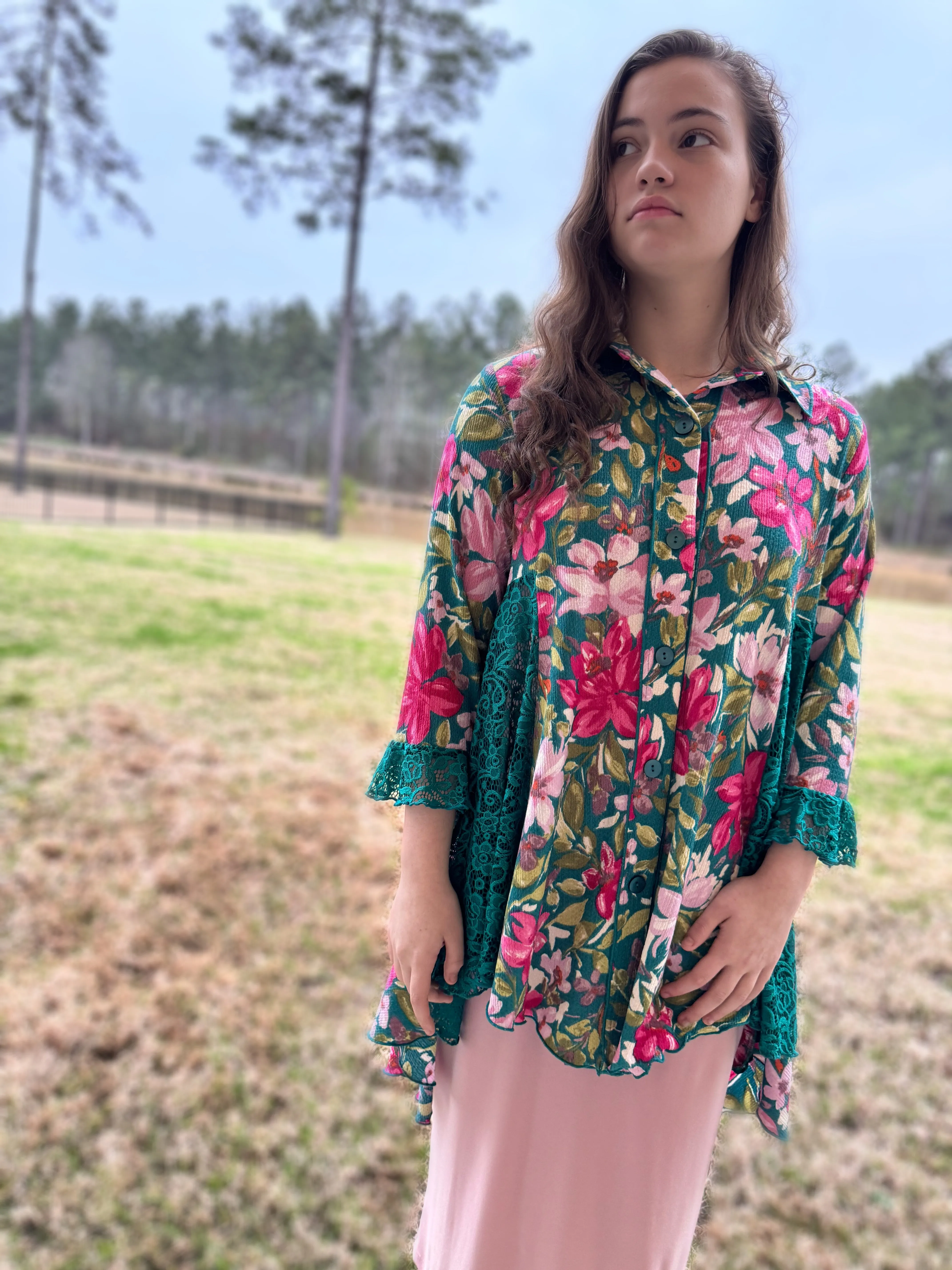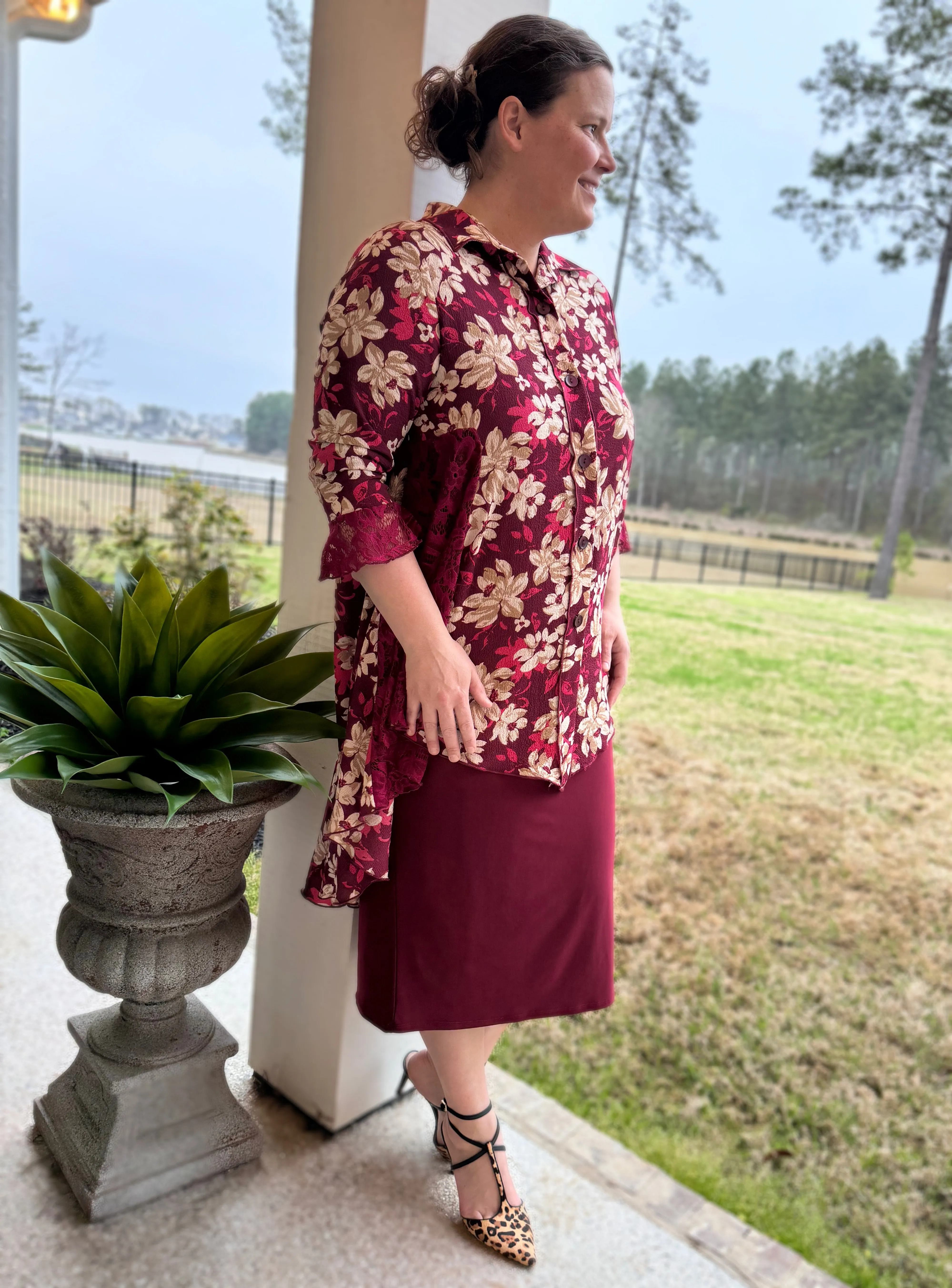 The Camila tops have become one of our most popular pieces! The design is extremely classy and elegant. The Camila is a high/low top with a button front, trimmed with a yoke on the back along with two insets in the front of a delightful coordinating fabric. The inserted lace contrasting against the fabric of the body creates a flattering look. It has 3-quarter sleeves that are trimmed out with the same beautiful pieces of lace. This piece pairs well so many of our layering garments.