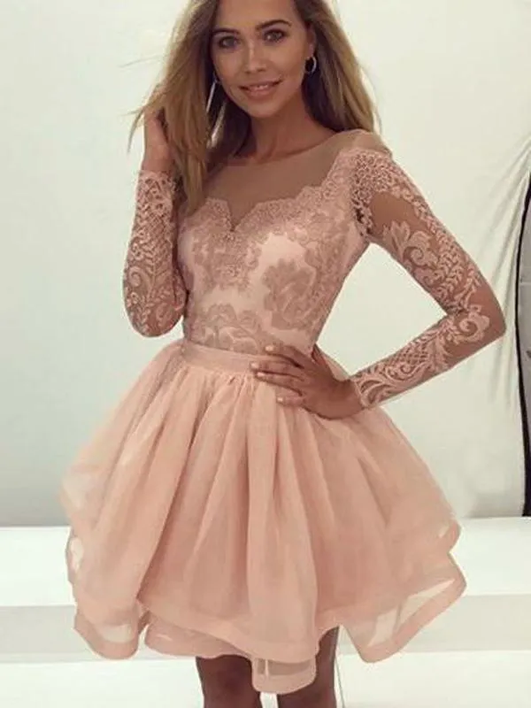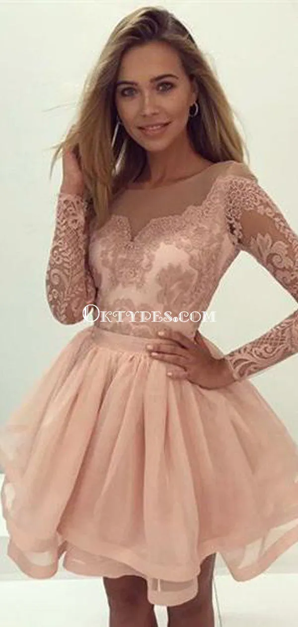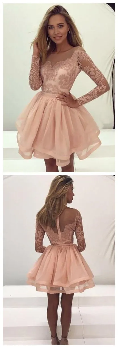 Champagne Lace Long Sleeves Illusion Short Cheap Homecoming Dresses, CM545