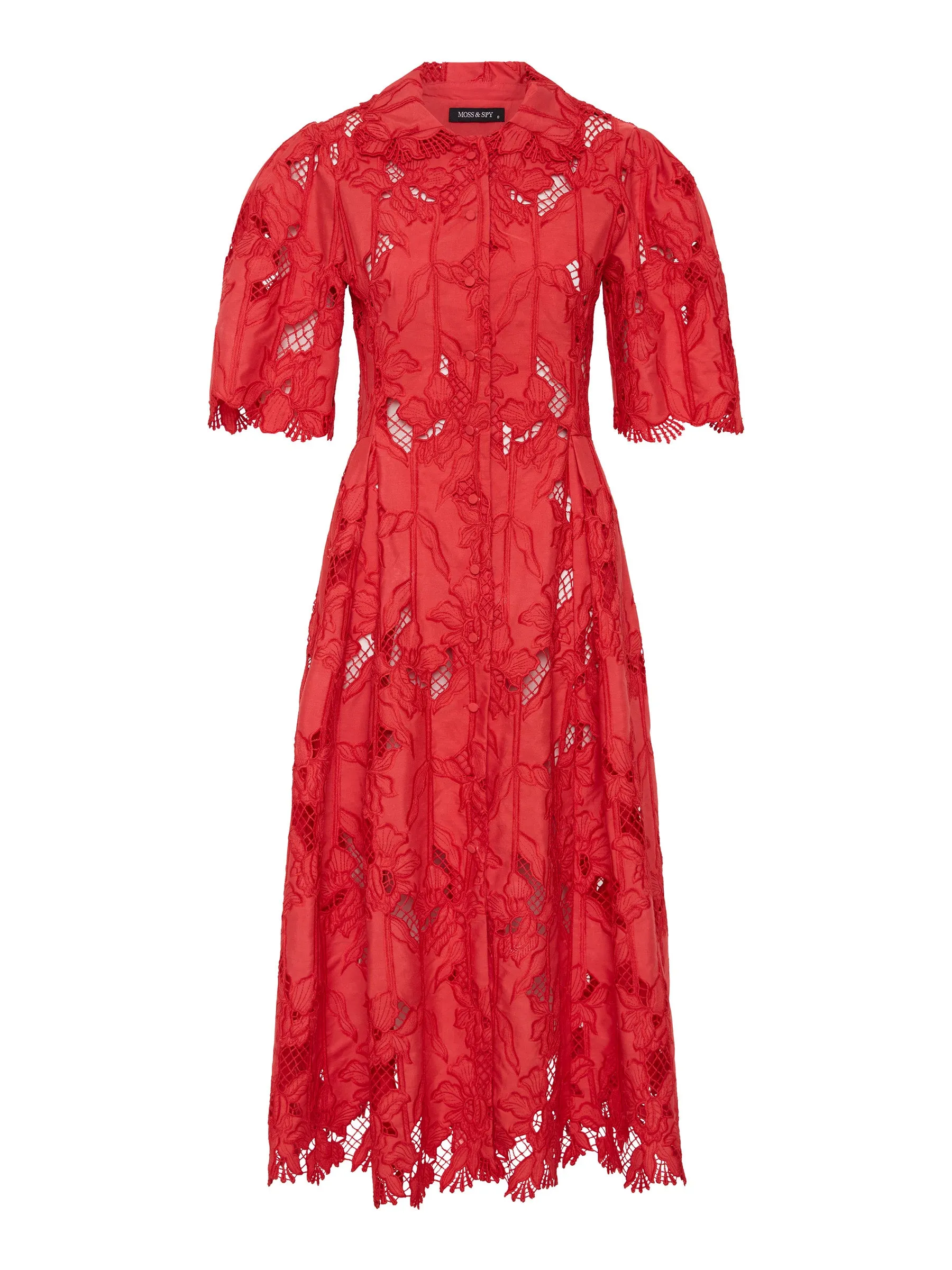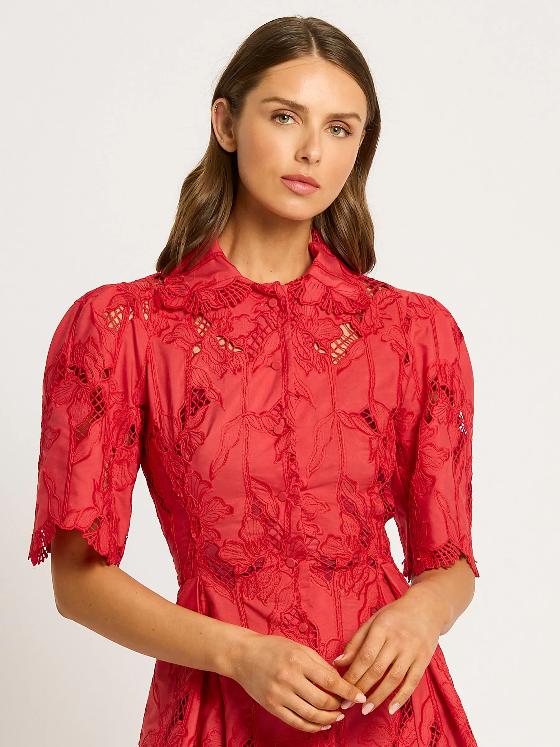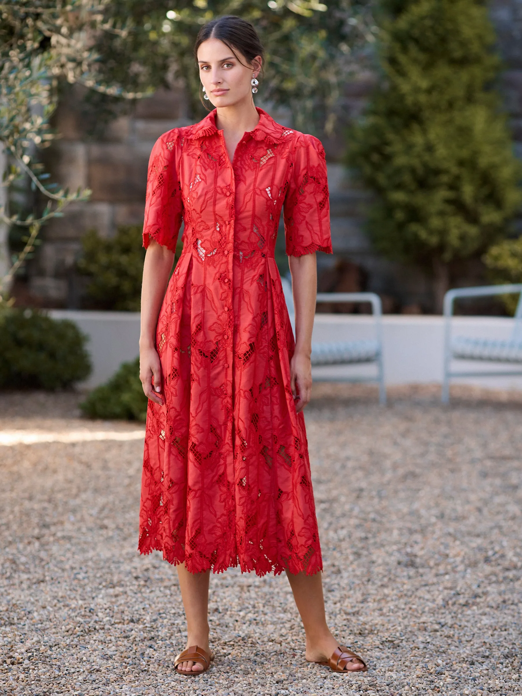 The Chloe Shirt Dress is crafted from an intricately embroidered fabrication with cut out embroidered floral detailing. This feminine shirt style silhouette in vibrant red is fitted through the bodice with a back waist seam and front panelling with tucks. Beautifully detailed with scallop finishes on the collar, sleeves and hemline it falls to a fuller hem finishing midi length. An effortless, chic, staple piece that can be worn day to night. Comes with a nude cotton slip.