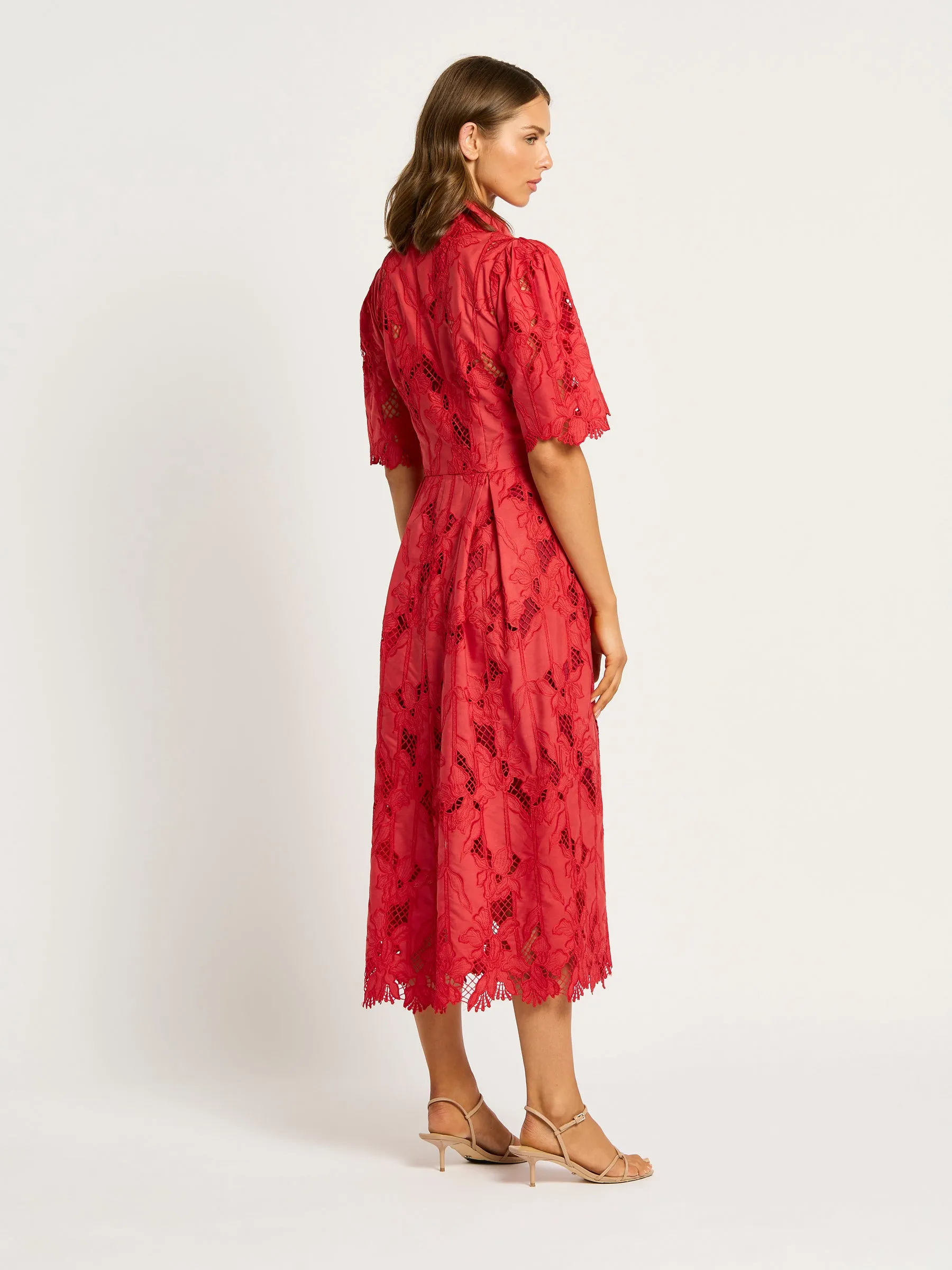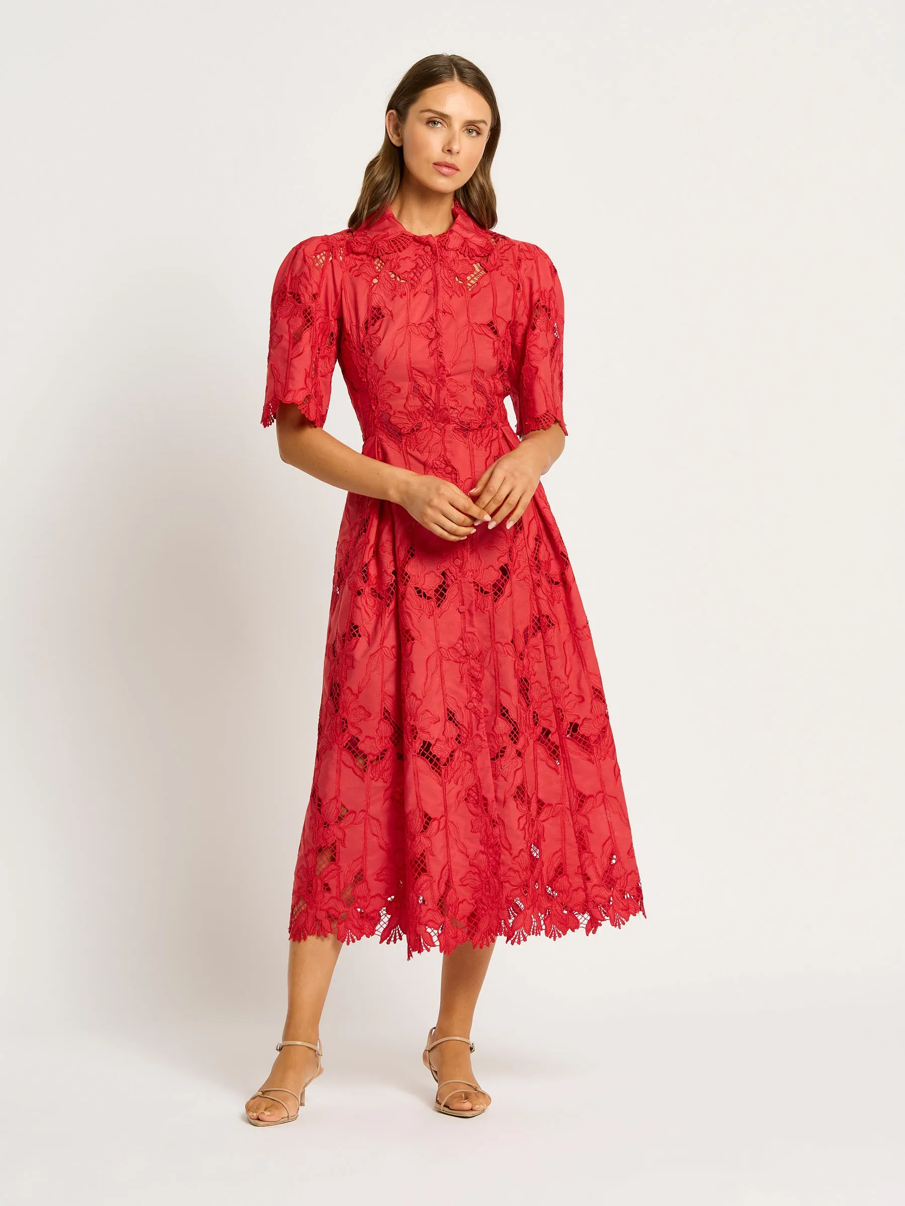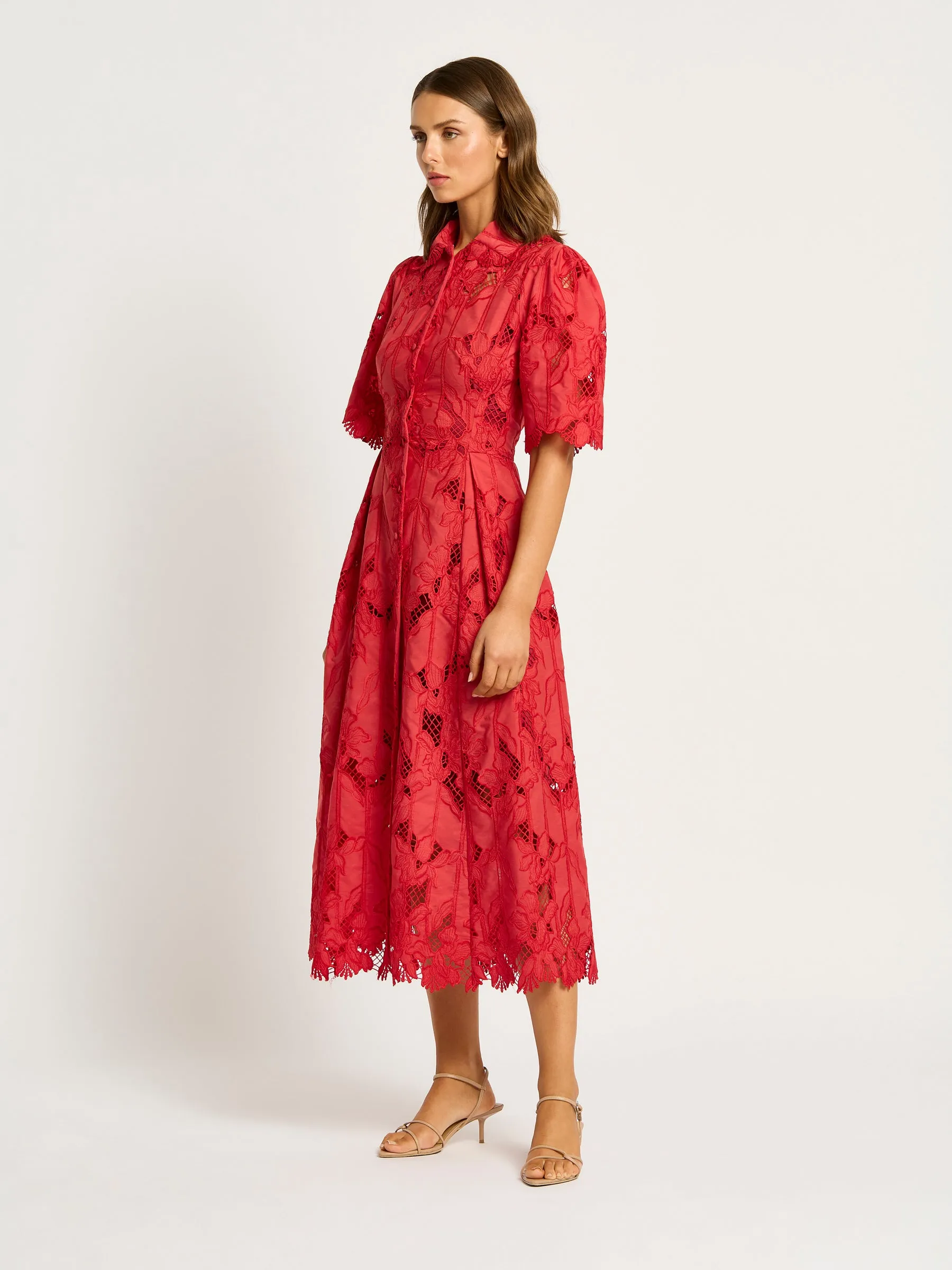 The Chloe Shirt Dress is crafted from an intricately embroidered fabrication with cut out embroidered floral detailing. This feminine shirt style silhouette in vibrant red is fitted through the bodice with a back waist seam and front panelling with tucks. Beautifully detailed with scallop finishes on the collar, sleeves and hemline it falls to a fuller hem finishing midi length. An effortless, chic, staple piece that can be worn day to night. Comes with a nude cotton slip.