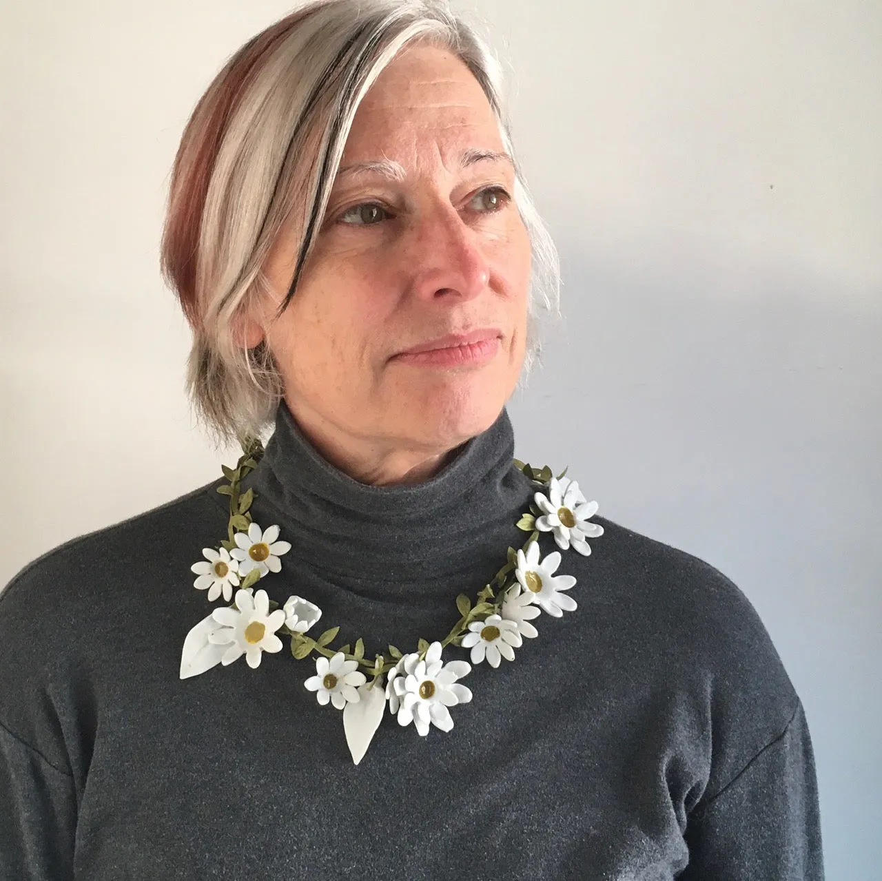 Artist Statement: This daisy necklace was inspired when I saw three daisies reaching for the sun. Gardens inspire my work—the colors, shapes, buds, blossoms, leaves and pods beg for transformation into clay. For that I am grateful. Life-long friends and long-lived passions have filled me with gratefulness. Some friends have been part of my life for generations. Others are newer to my life but will be here for decades to come. Long-lived passion of art is central to many relationships and to my being. How could we be who we are without those ties? For that I am grateful. During Covid I found solace in friends, family, gardening and clay resulting in a concentration of my world. The feel of forming a vessel or a small bead of clay, the smell of a sun warm tomato vine, the sound of a child’s laughter, the warmth of a hand touch, a loved one grocery shopping to keep me safer. It has brought new pleasures from the not-so-ordinary everyday. For that I will continue to be grateful.