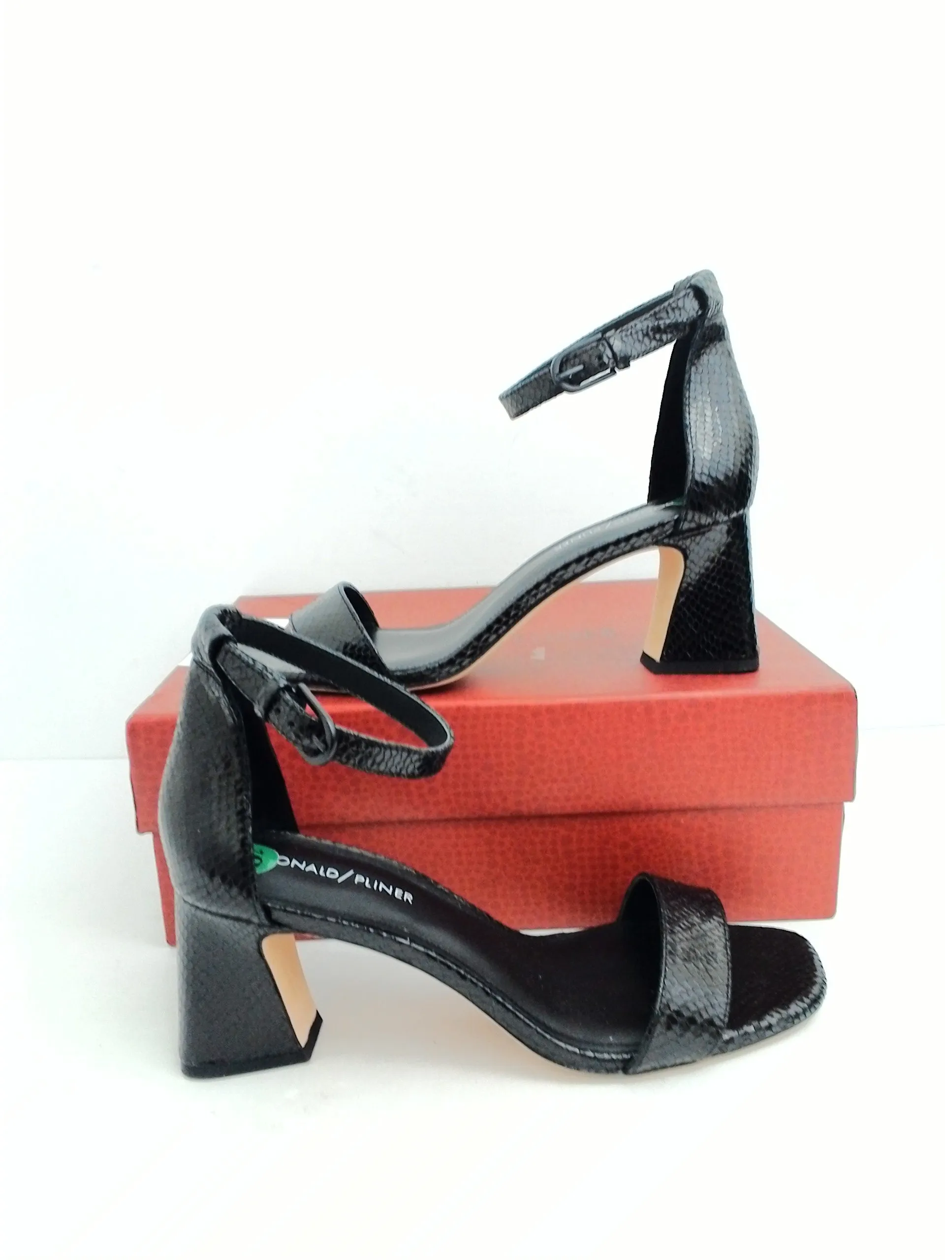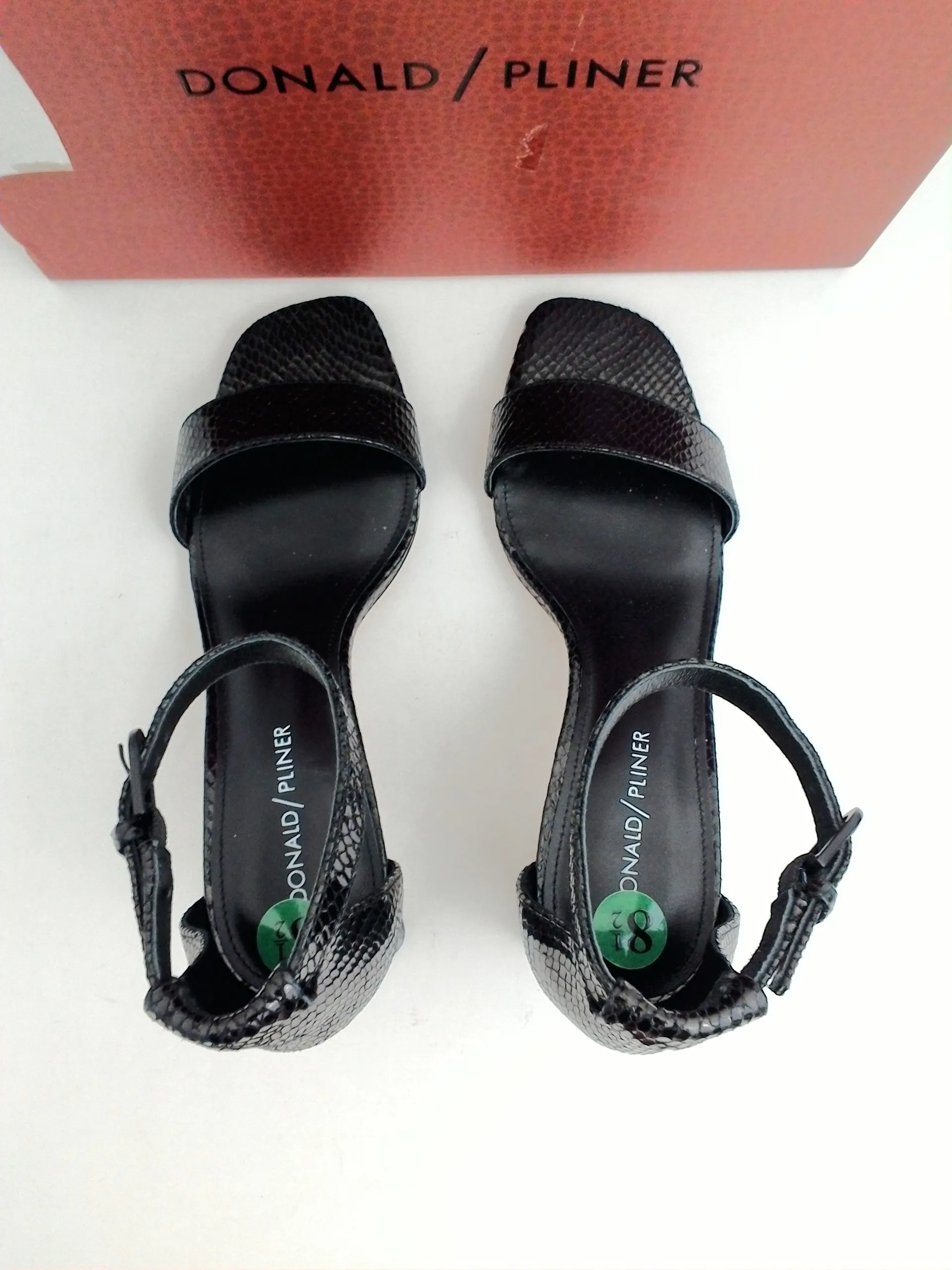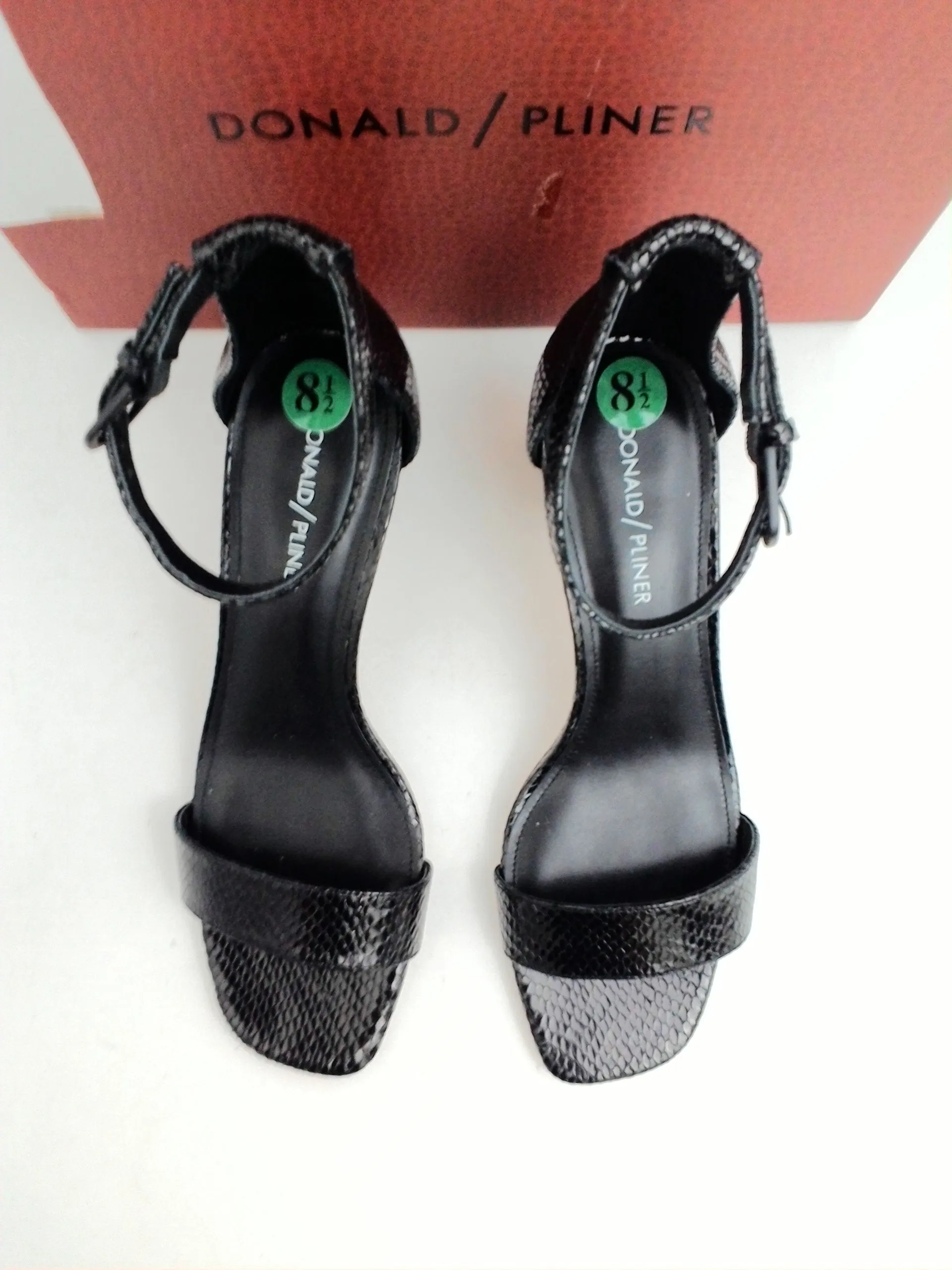 Donald/Pliner Women's Vanesa Black Metallic Mini Viper Heeled Sandal Size 8.5 M, squared open toe, adjustable ankle strap with buckle closure, 2.75" chunky heel, new in original box