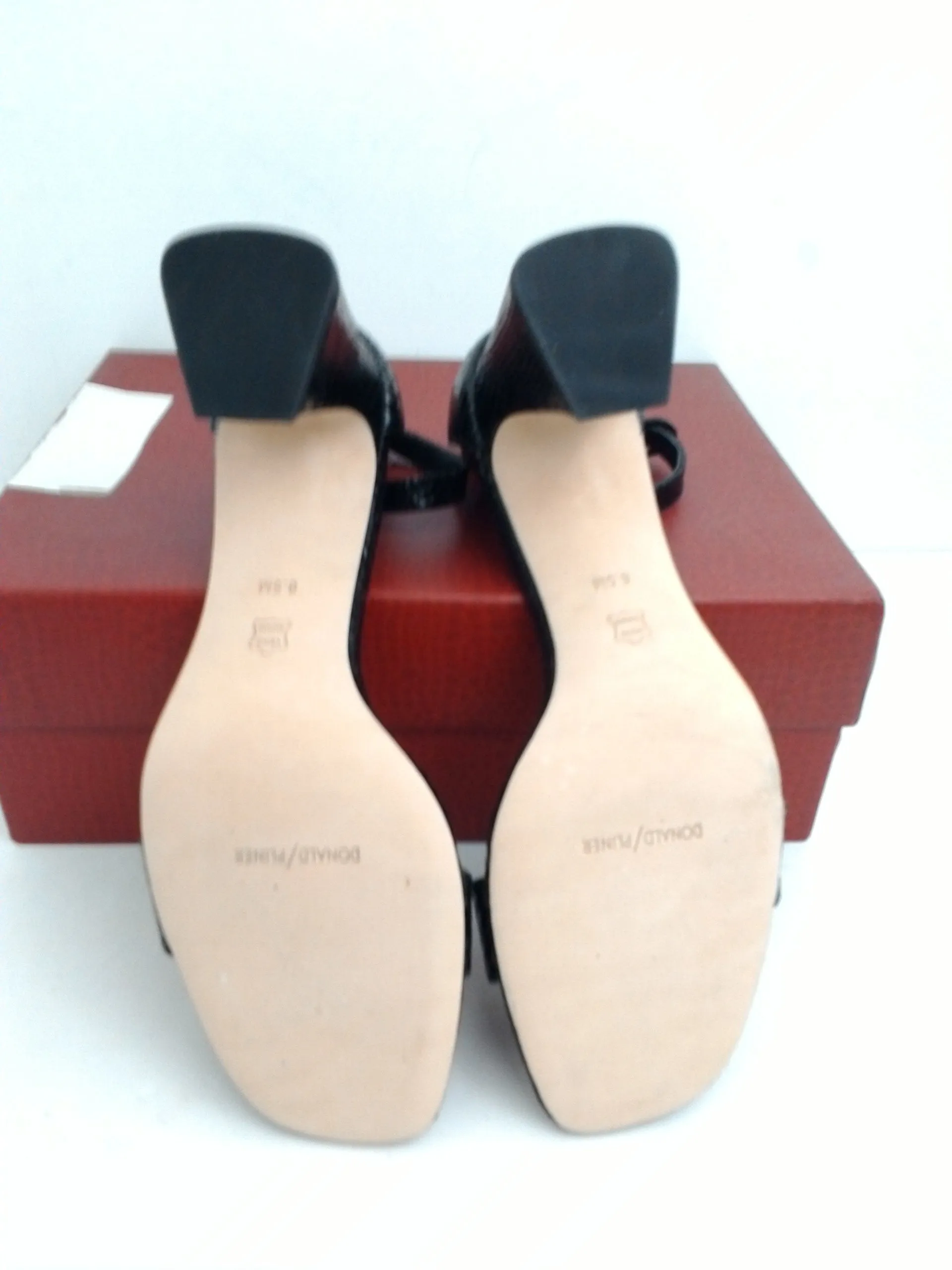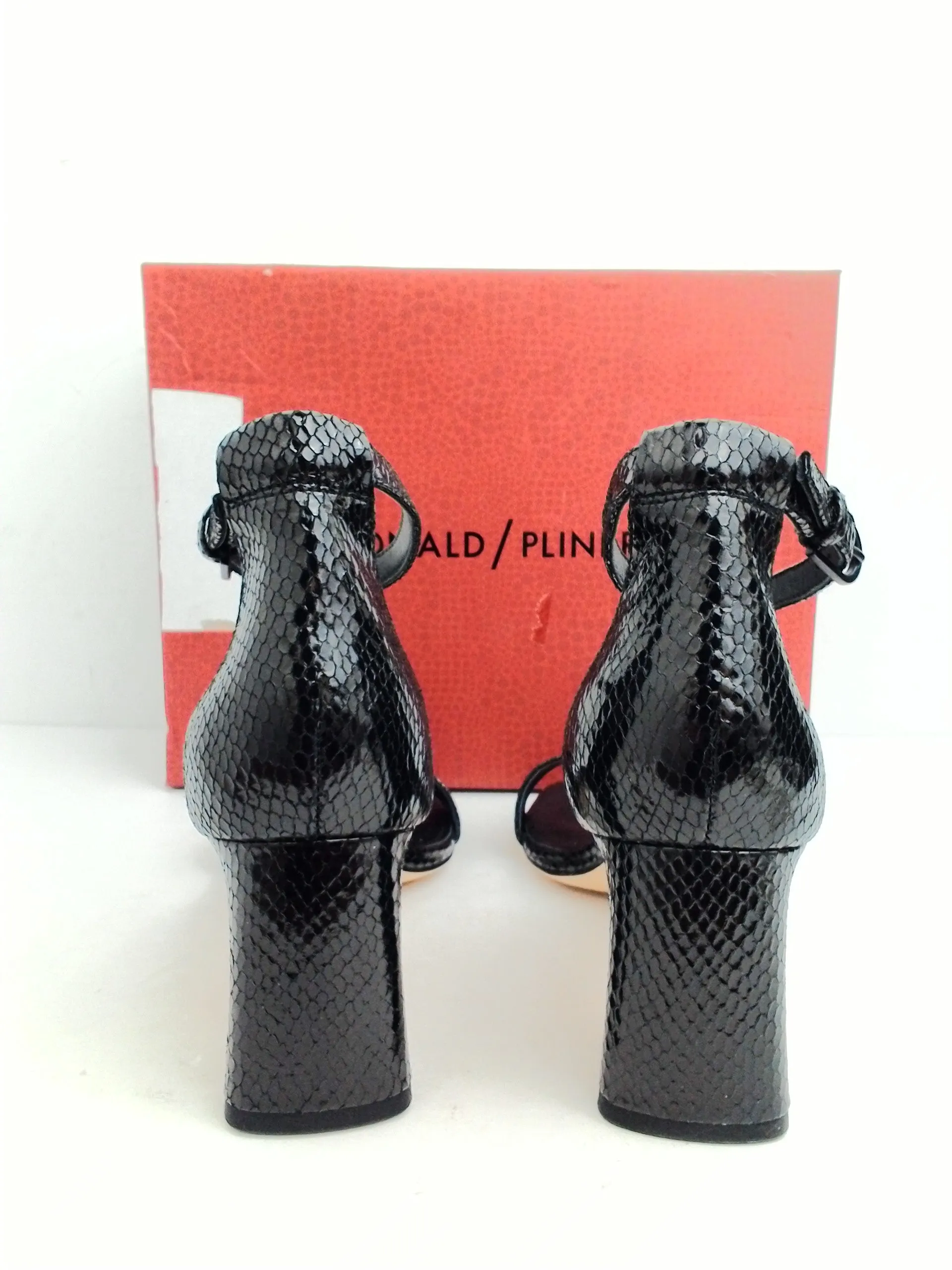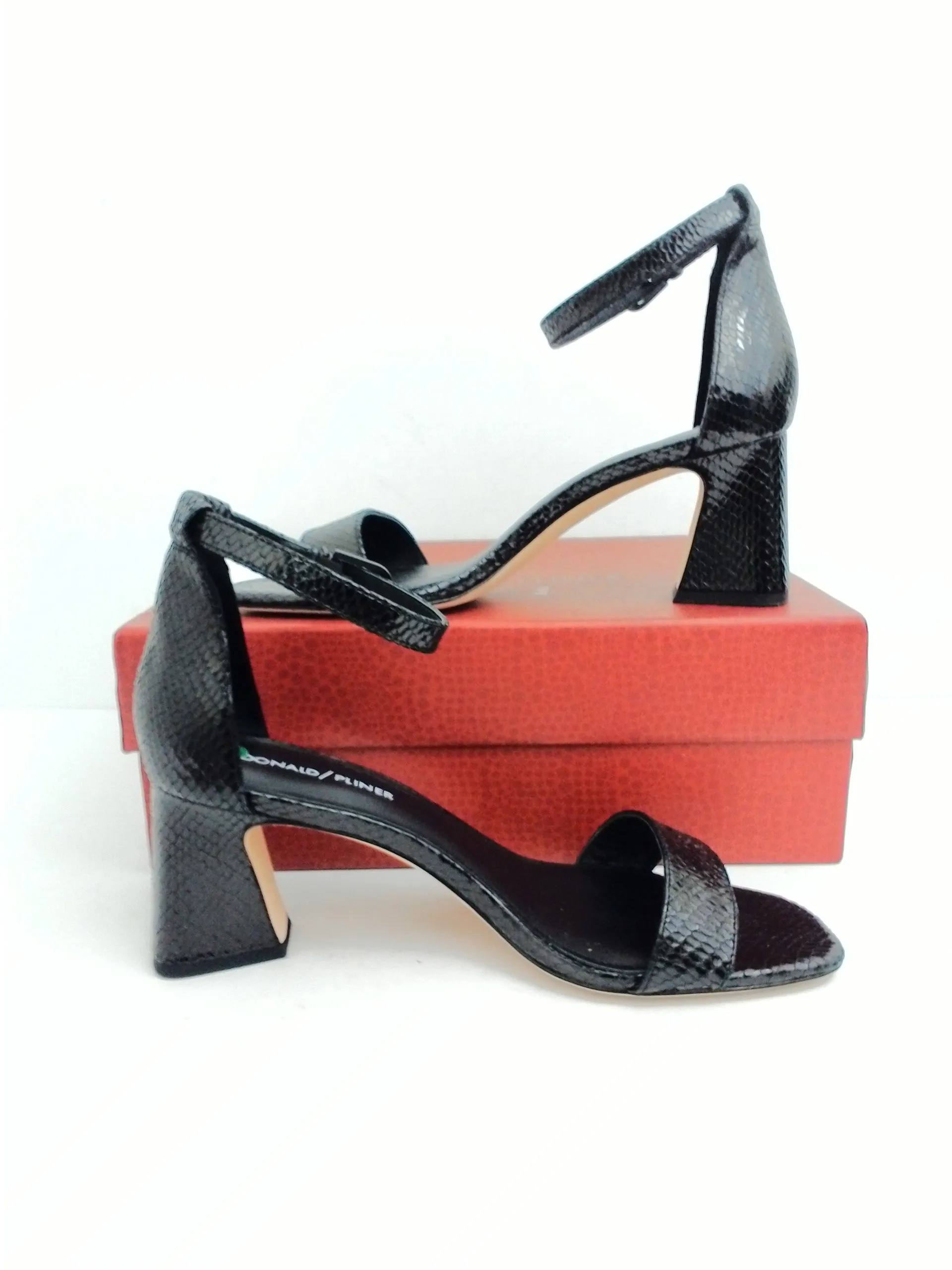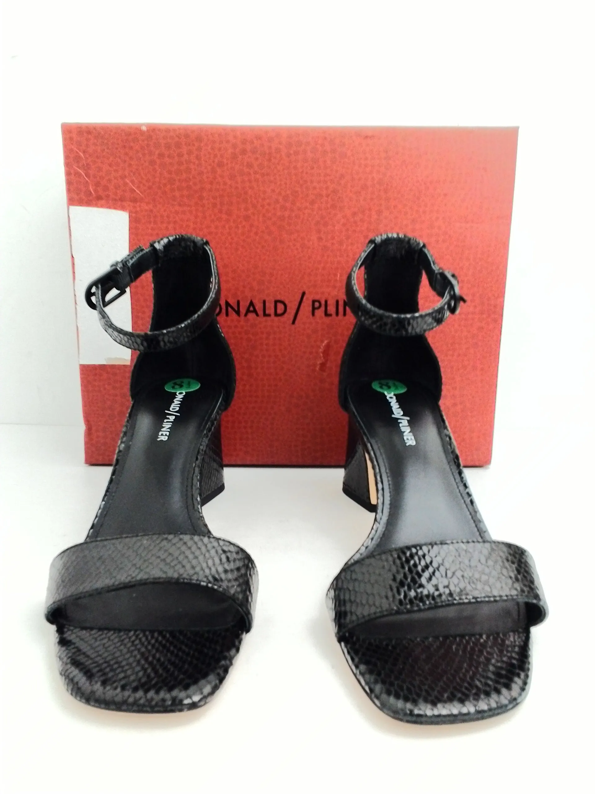 Donald/Pliner Women's Vanesa Black Metallic Mini Viper Heeled Sandal Size 8.5 M, squared open toe, adjustable ankle strap with buckle closure, 2.75" chunky heel, new in original box