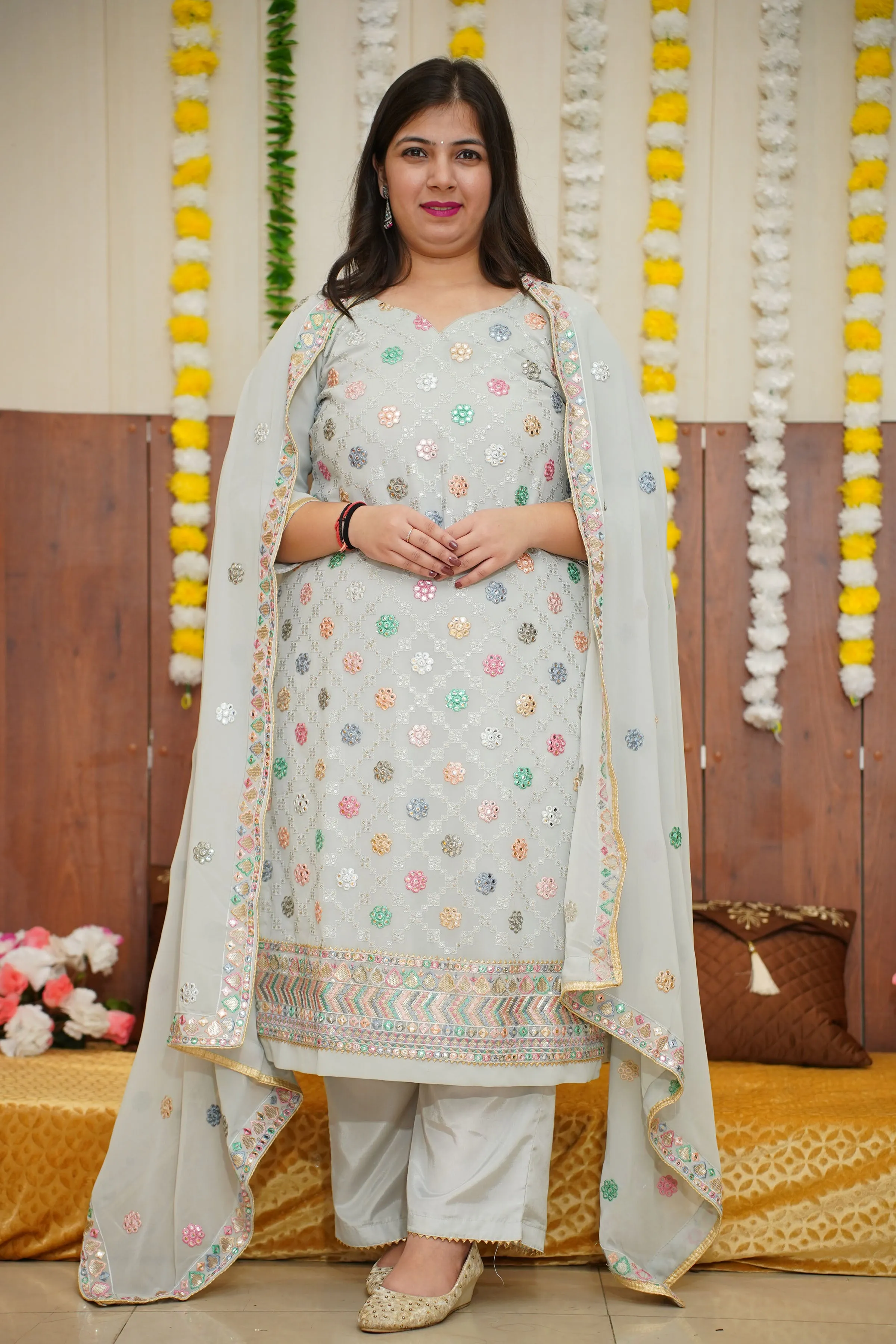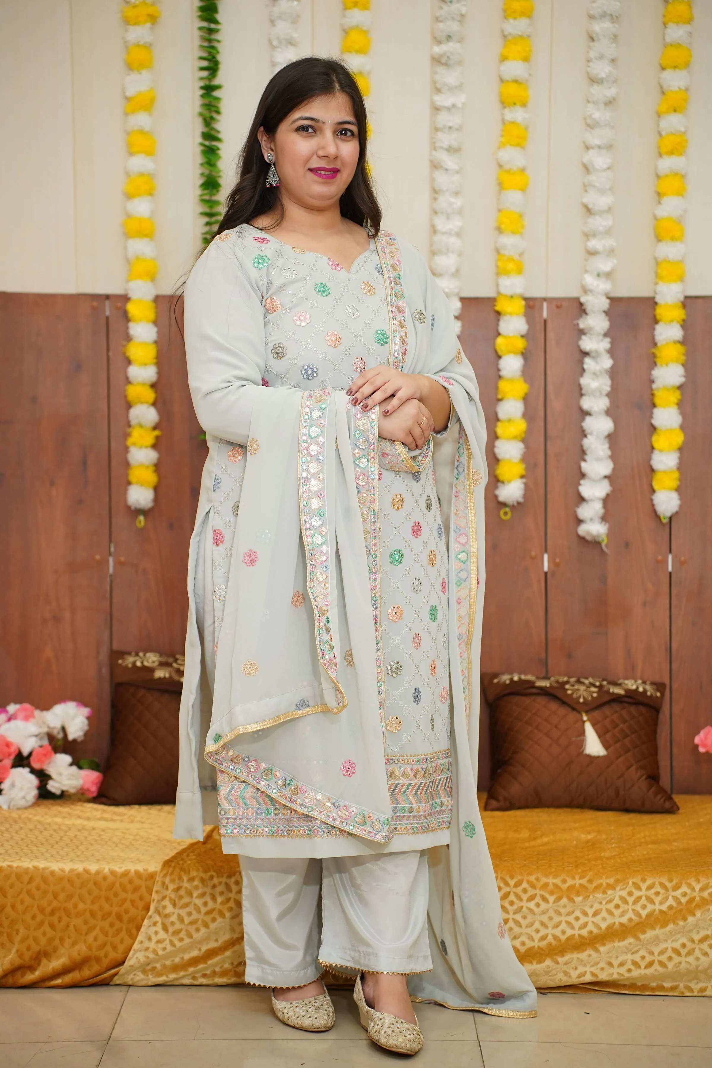 Step into the spotlight with our Dusty Pista Mirrored Fancy Suit, a captivating blend of elegance and glamour! Crafted from lightweight georgette, this stunning ensemble features exquisite sequin and mirror work throughout, a flattering sweetheart neckline, and stylish quarter sleeves. It is paired with a solid bottom and a flowing georgette dupatta, it’s the perfect choice for your next festive celebration.