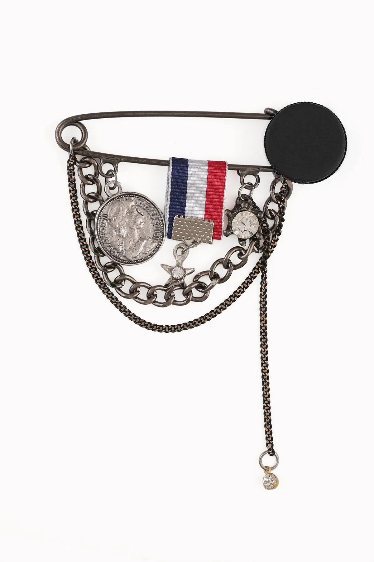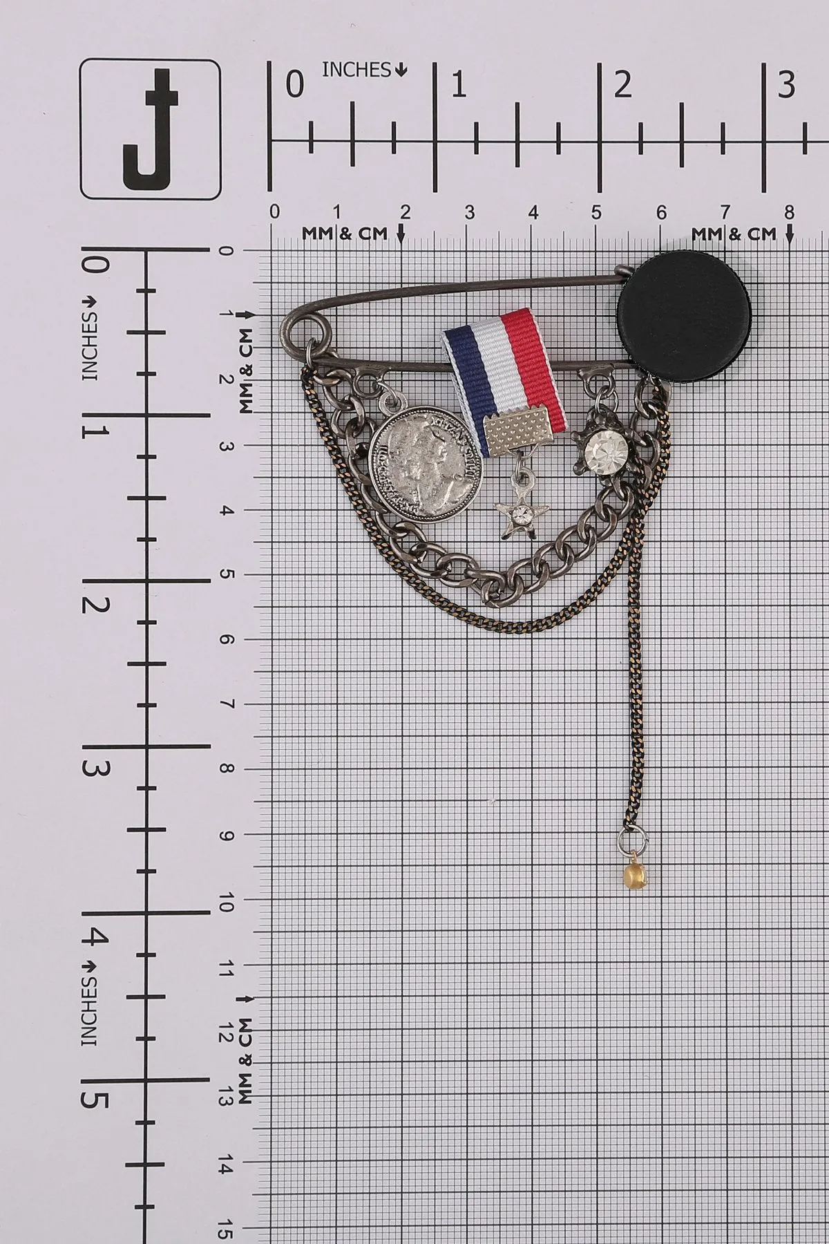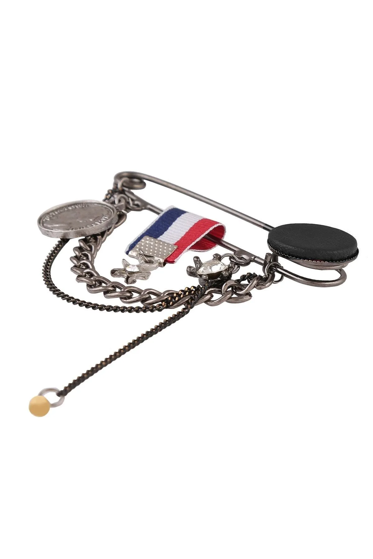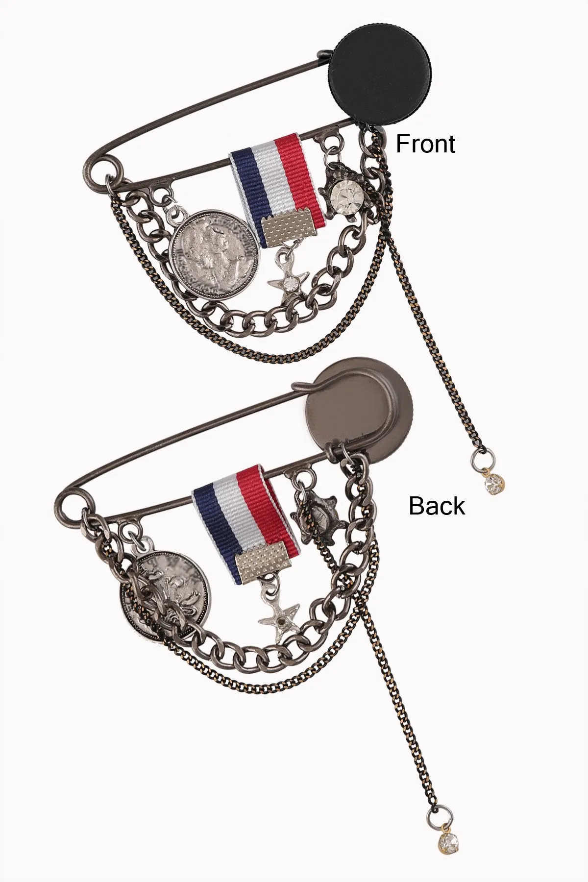 Elegant Flag and Coin Chain Hanging Black Nickel Safety Pin Brooch