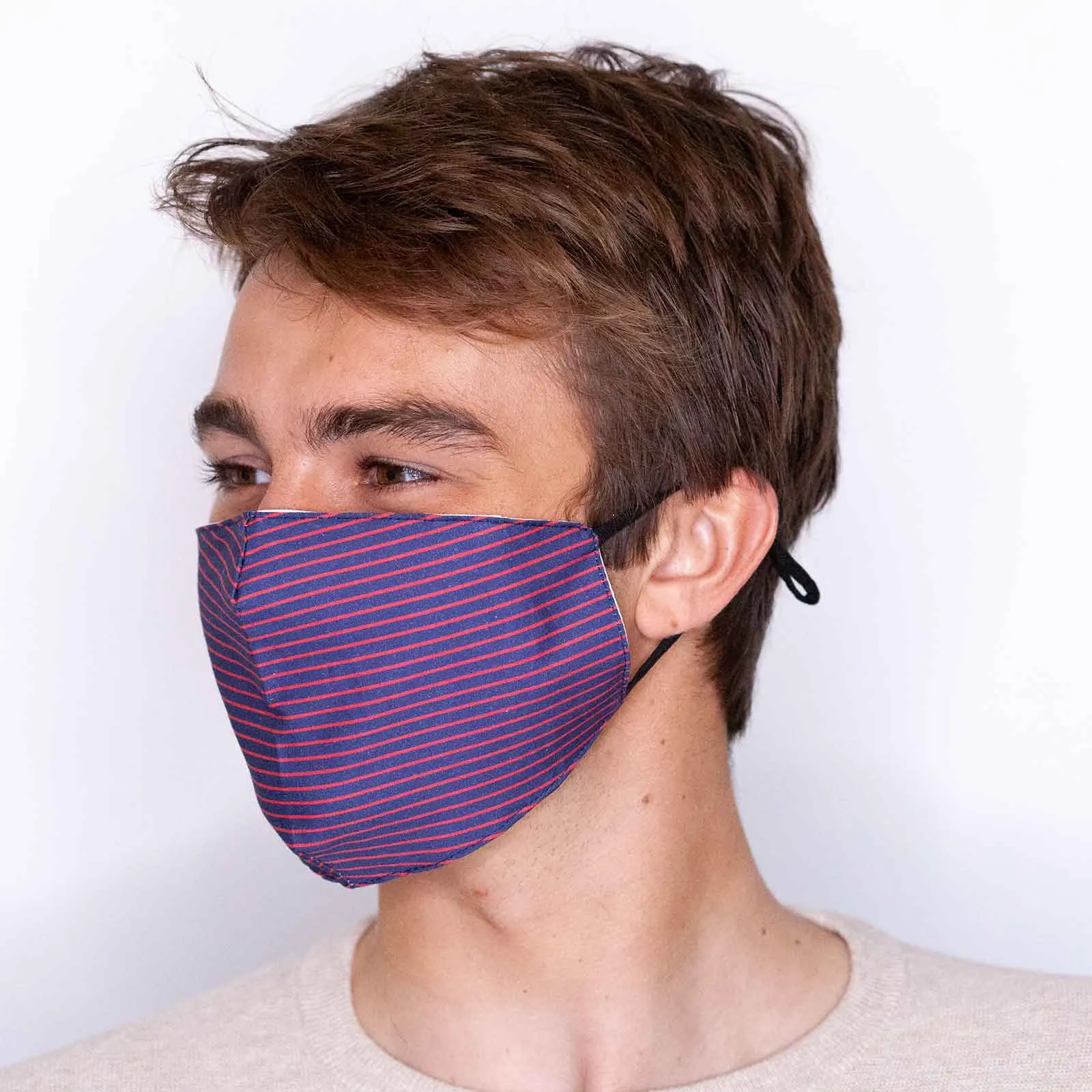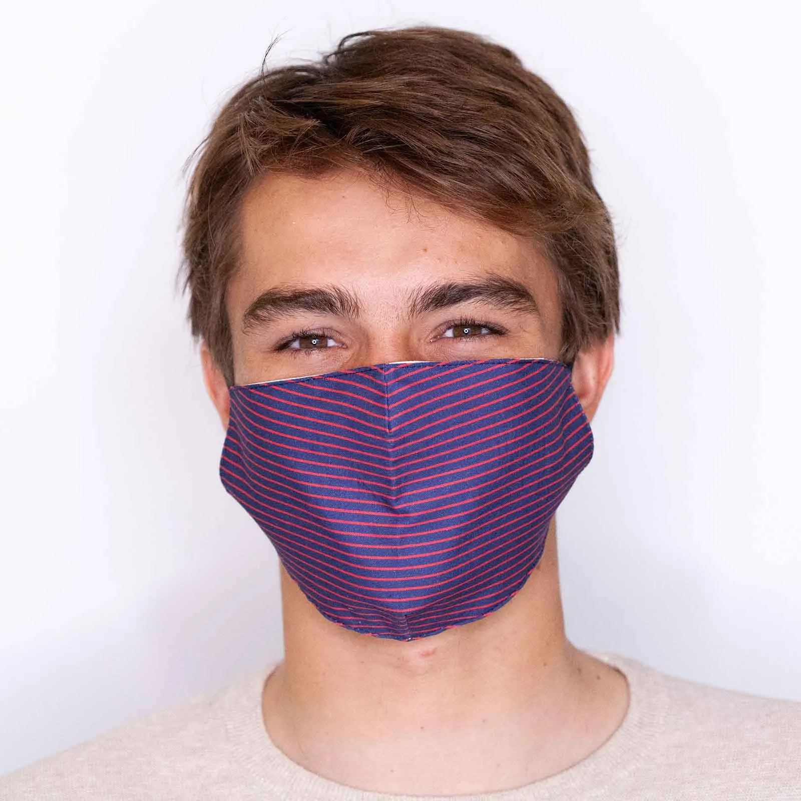 Our lightweight cotton masks keep you safe while still looking your best! Our Pin Stripe reusable mask features a classic thin stripe reminiscent of neckwear in a blue and red color palette perfect for everyday use! These soft and breathable, face masks are adjustable with comfortable elastic ear straps and nose wires for customized protection and have a casual look perfect for running errands around town but are also can be dressed up for a socially distanced event. Plus they are carbon filter compatible for even better filtration!