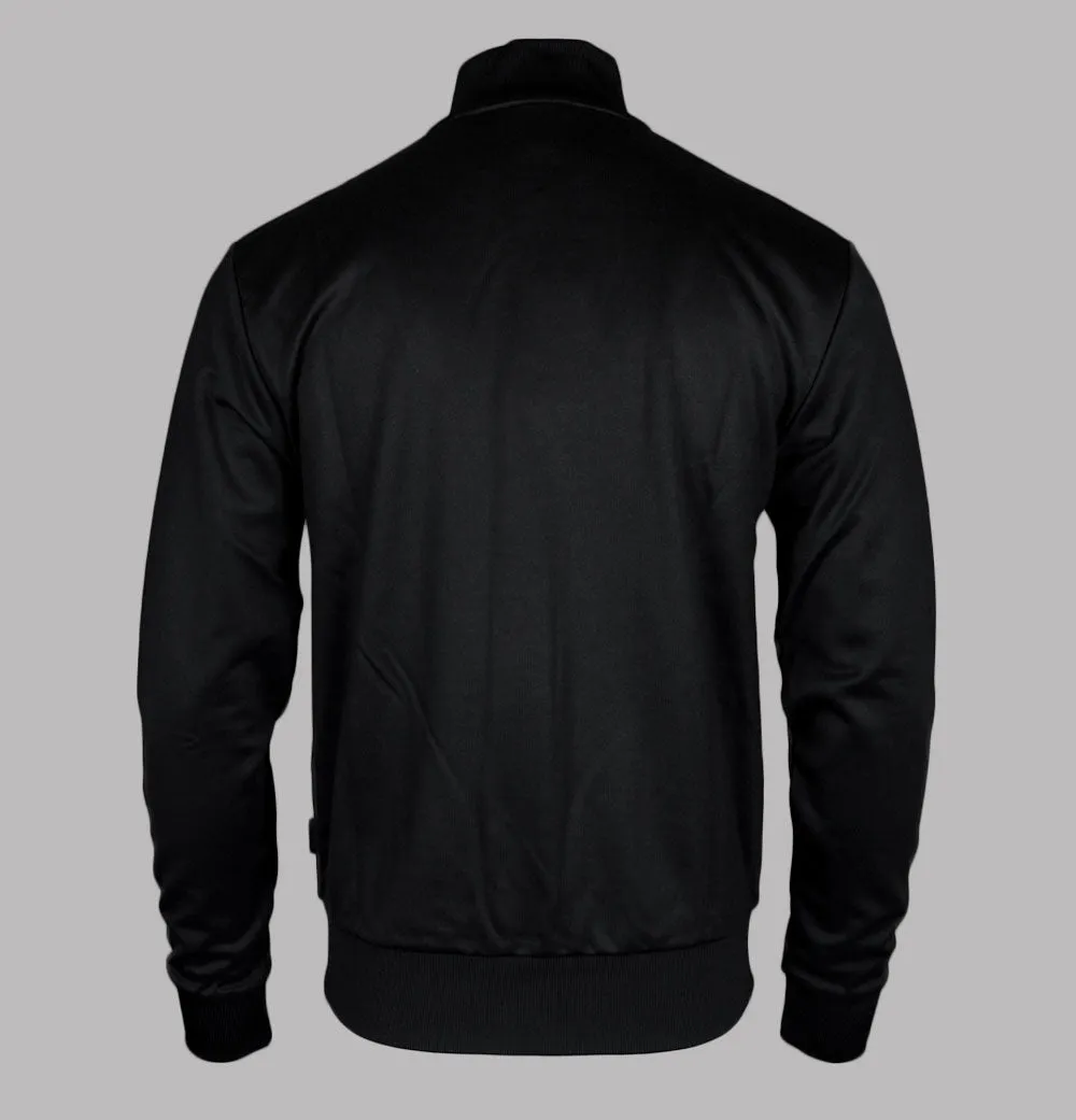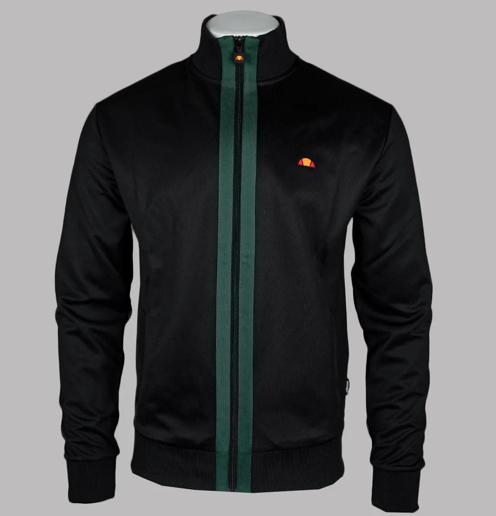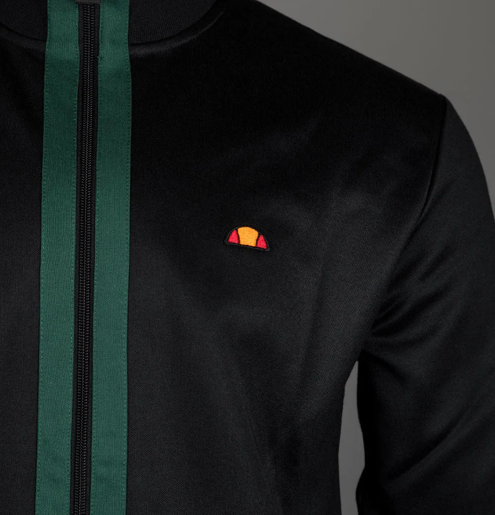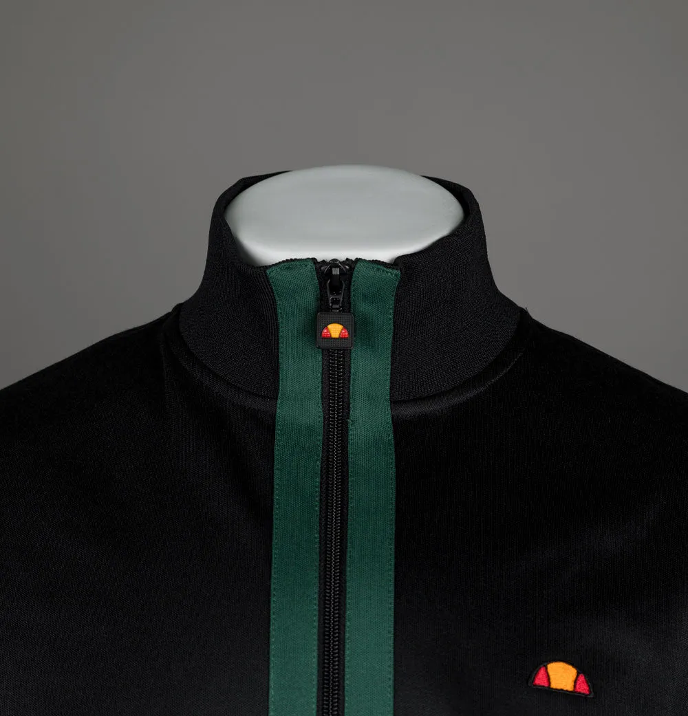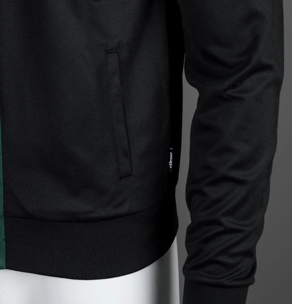 Ellesse Berlusoni tracksuit top. Black cotton/polyester blend fabric. Front zip up fastening with an Ellesse branded zipper. Woven Green panel detail on the placket. Front pockets. Embroidered Ellesse badge on the chest. Ribbed collar, sleeve cuffs and hem. Regular fit. 50% cotton, 50% polyester.