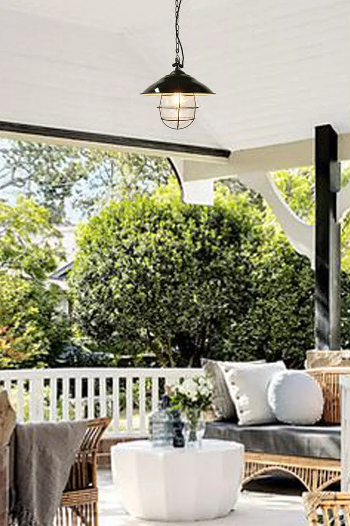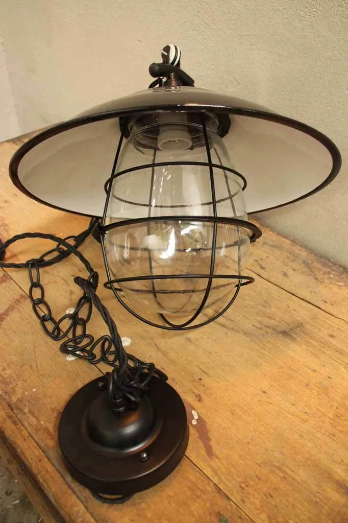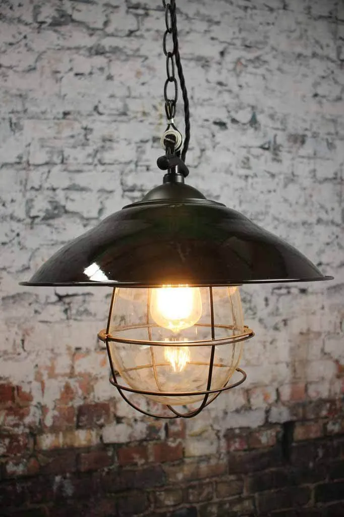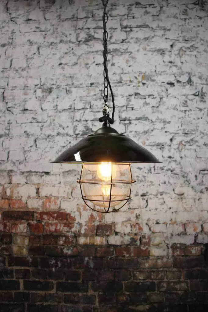 This engine room light features a tear drop industrial style well glass with black cage housing and a porcelain enamel shade. Porcelain enamel has been applied to the steel shade, resulting in a smooth, glossy black outer finish and contrasting white inner. An attractive industrial look for modern home or Australian beach style commercial interiors. Available only at Fat Shack Vintage!