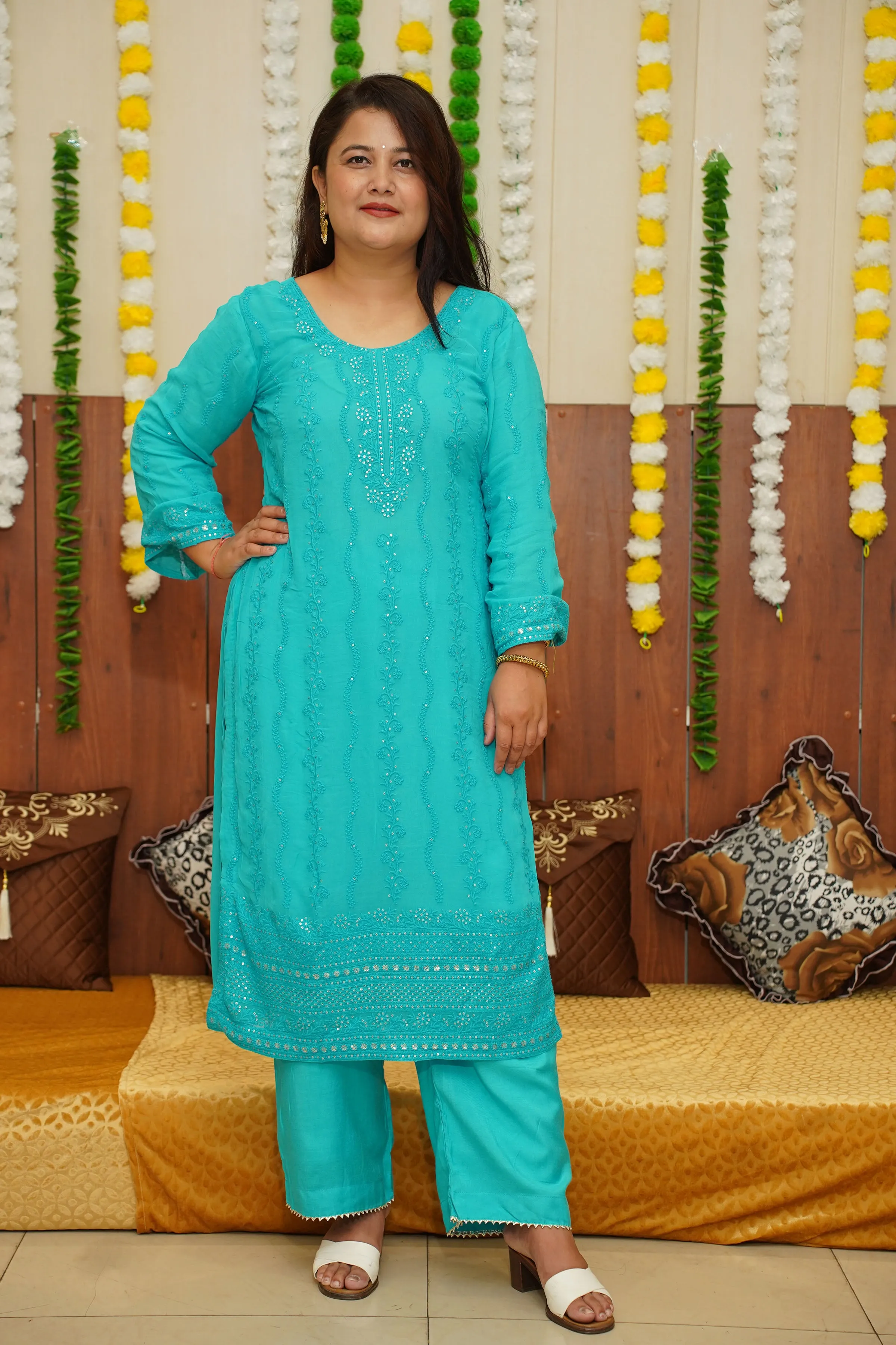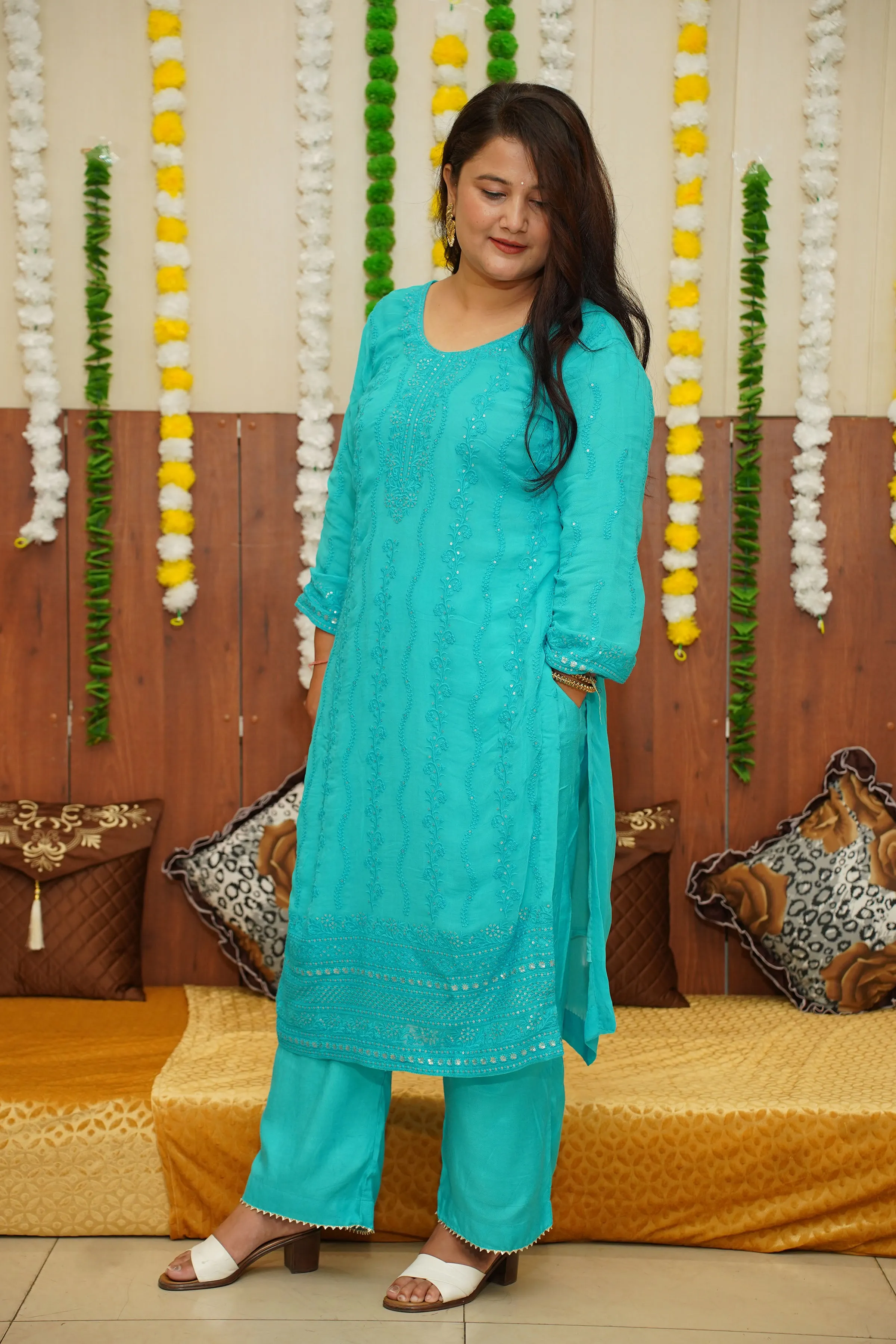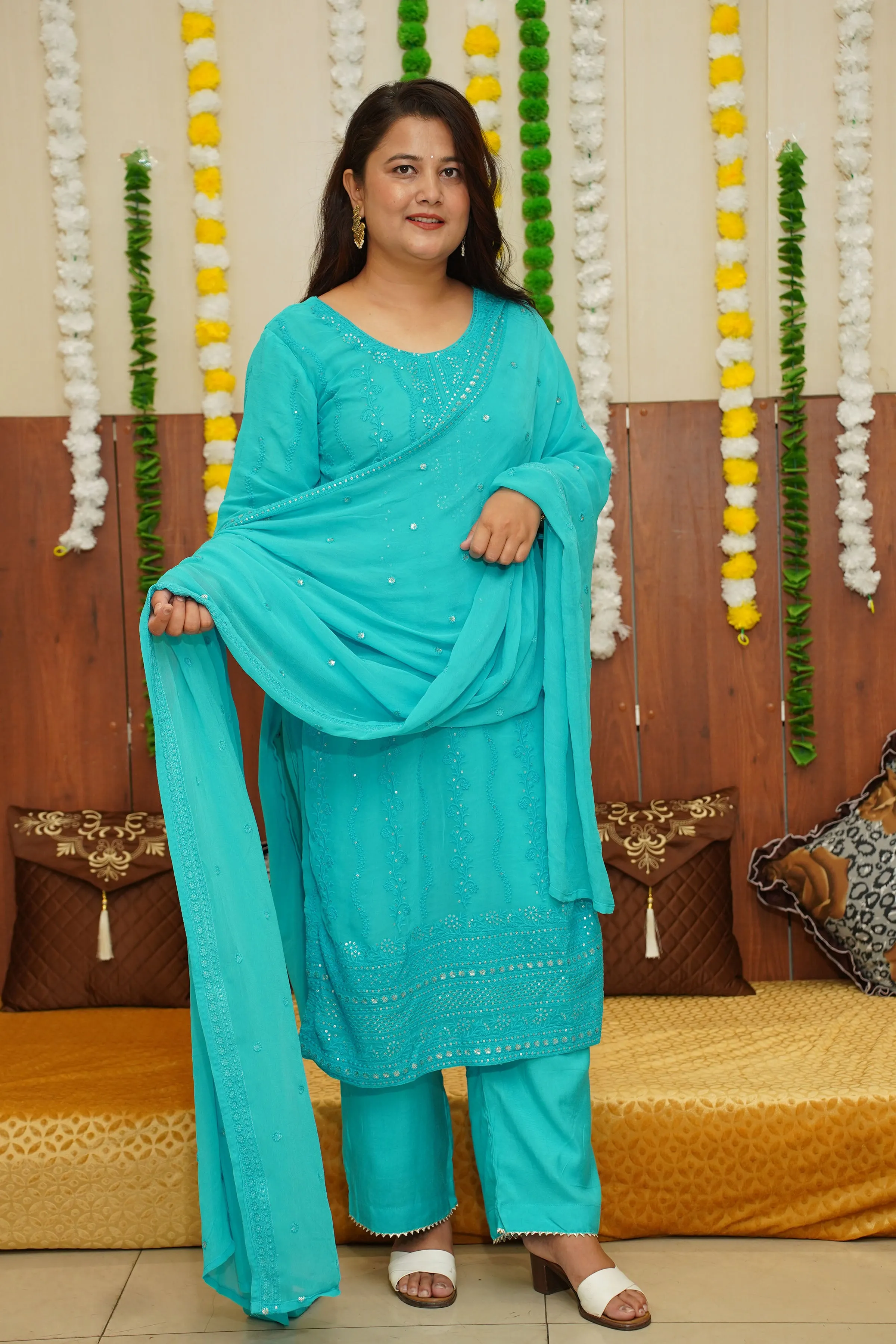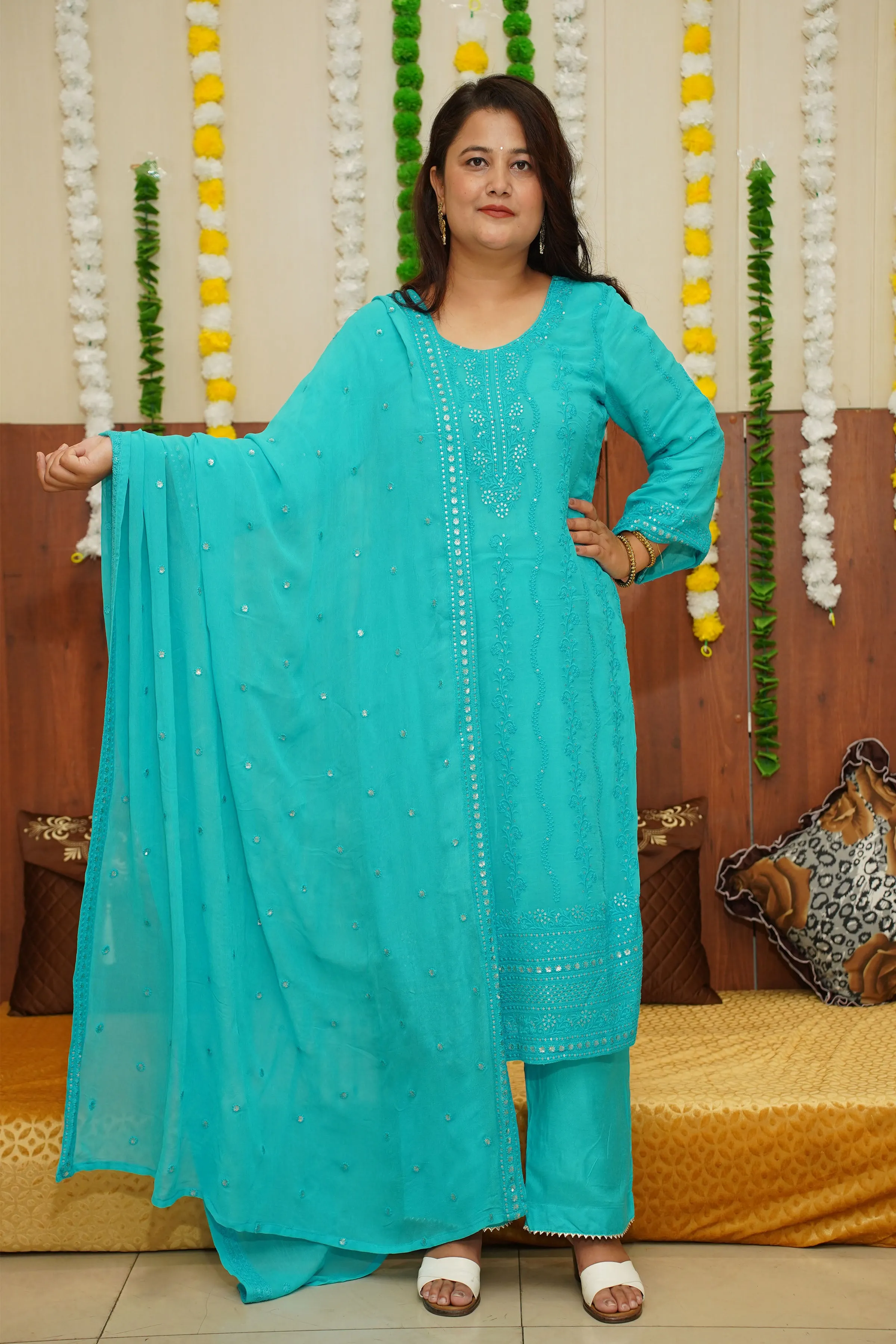 Introducing the Firozi Accent Sequin Fancy Suit Set, a captivating ensemble designed to make you stand out at any party or special occasion. This exquisite suit set features a stunning firozi hue adorned with eye-catching sequins, adding a touch of glamour to the ensemble. Paired with stylish palazzo pants, the outfit ensures a perfect blend of comfort and trendsetting style. The allure is elevated with a georgette dupatta adorned with sequin and thread work, creating a sophisticated and dazzling finish.