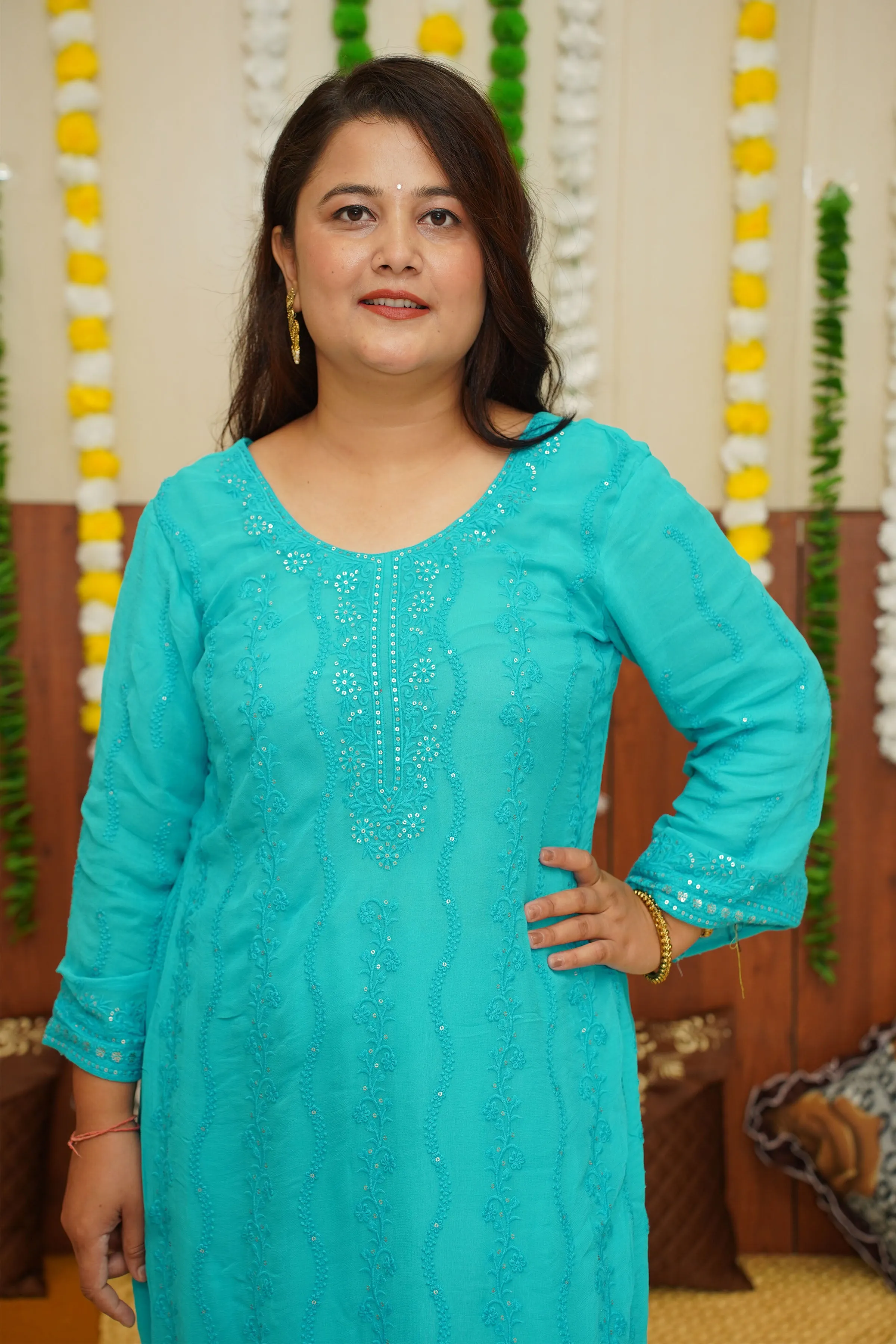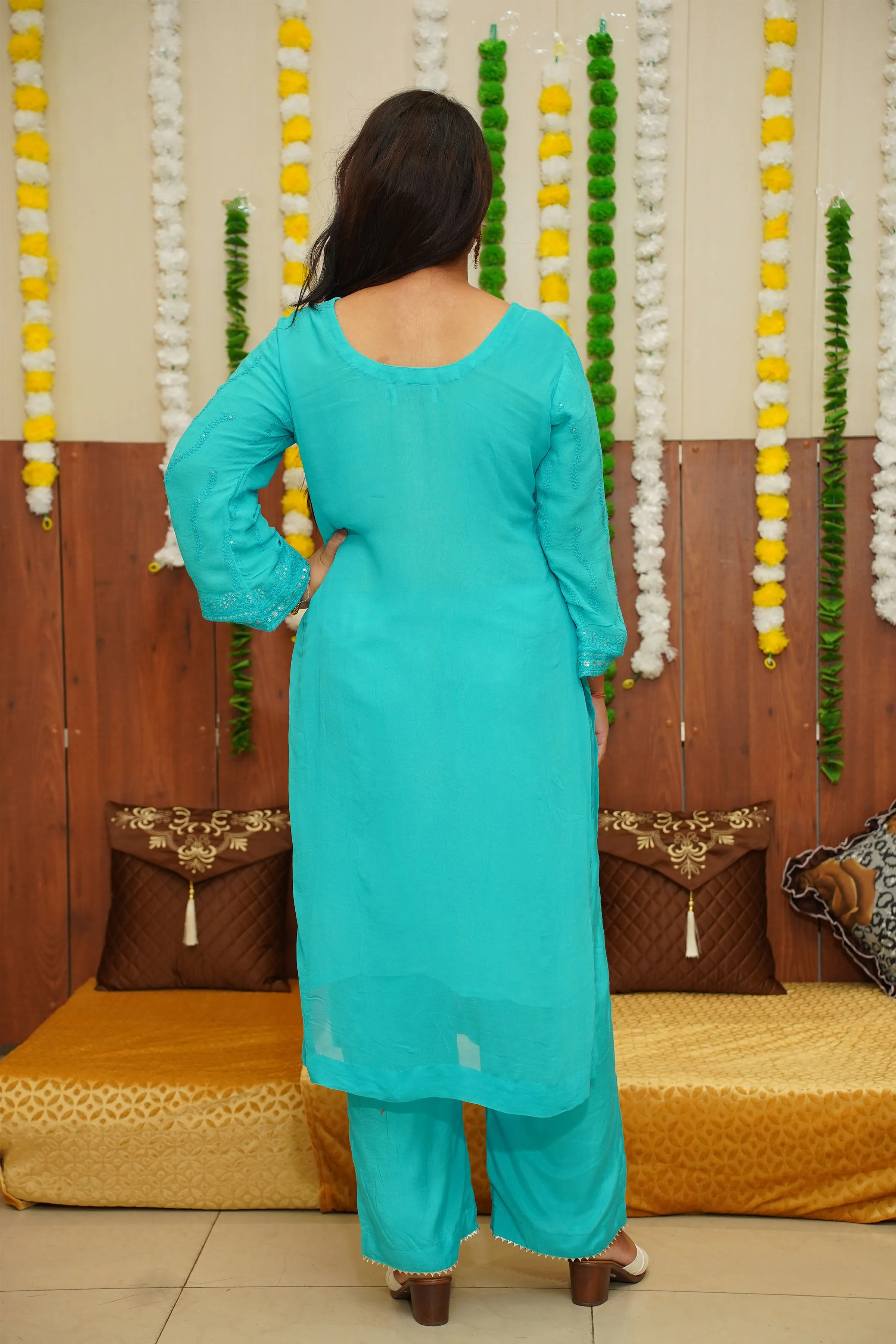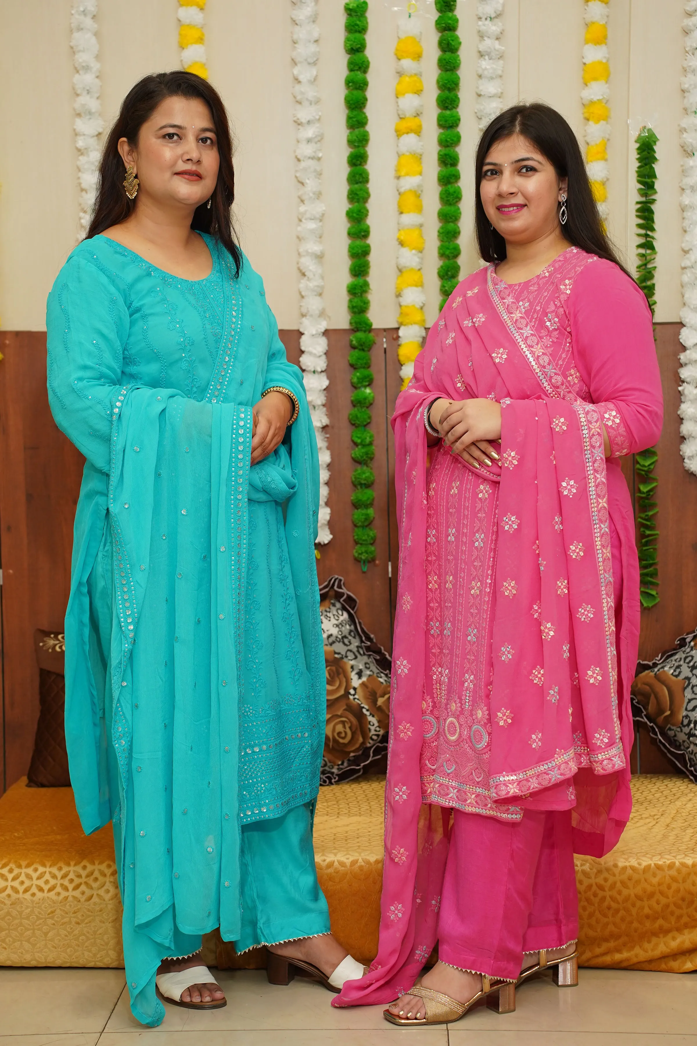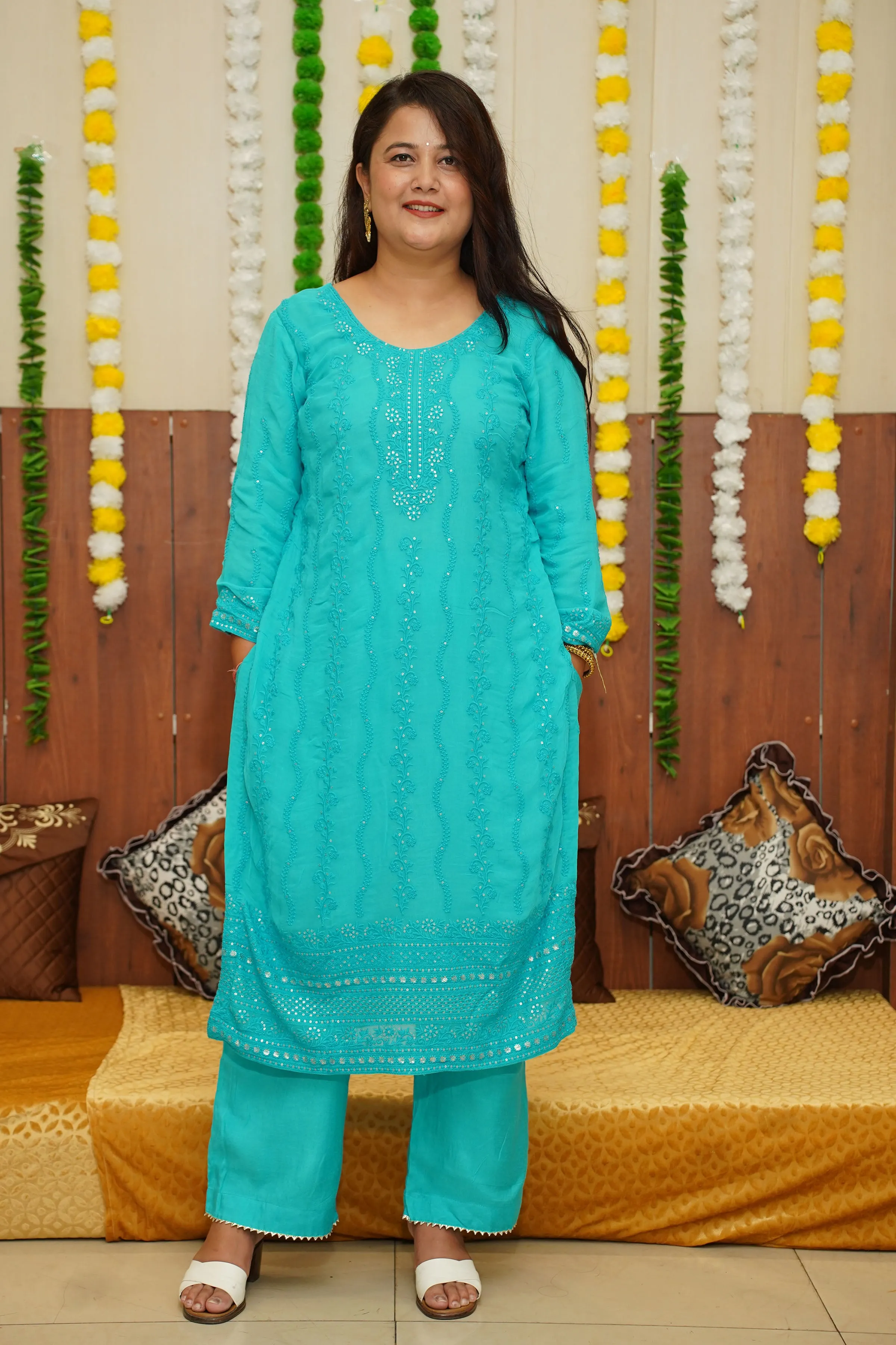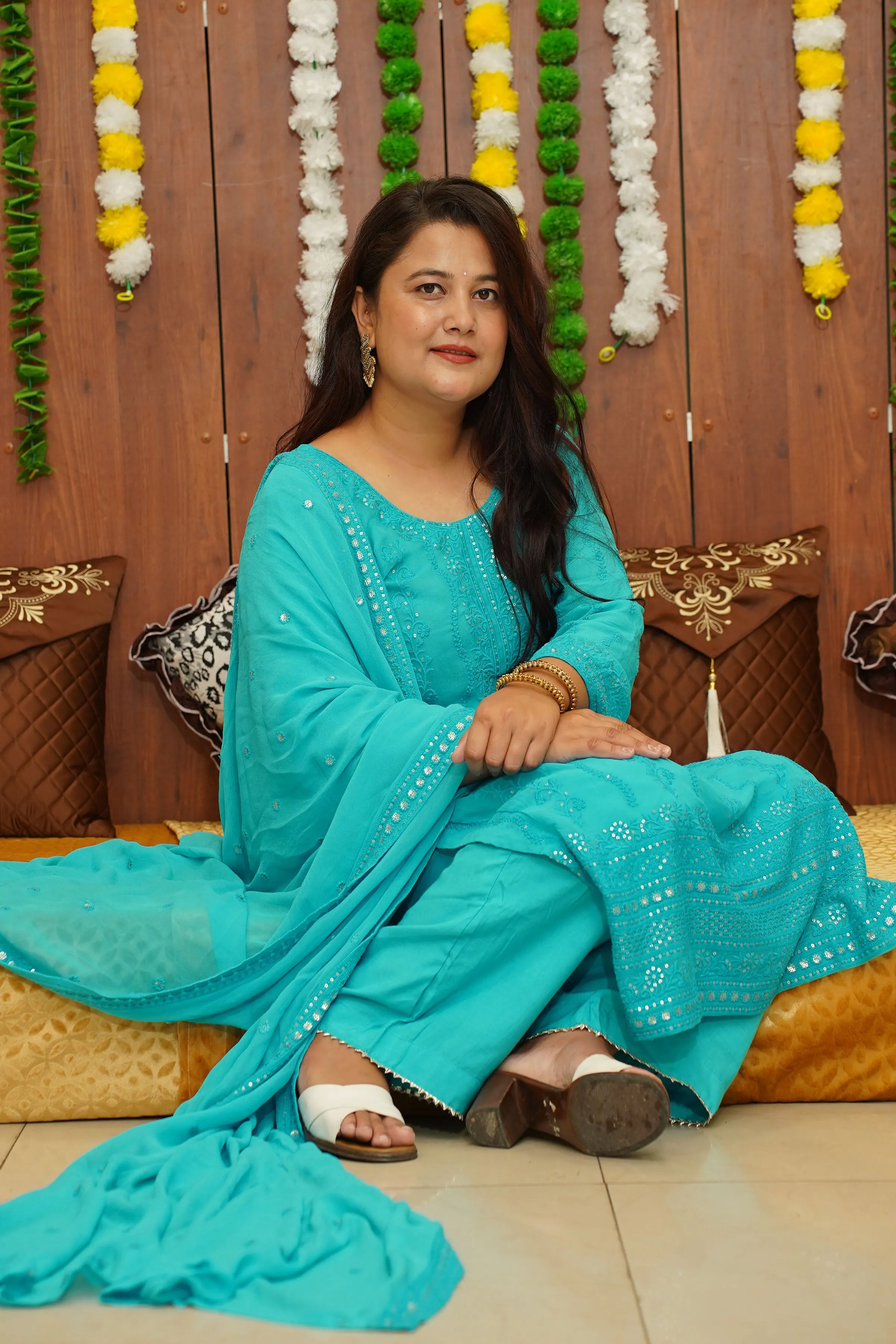 Introducing the Firozi Accent Sequin Fancy Suit Set, a captivating ensemble designed to make you stand out at any party or special occasion. This exquisite suit set features a stunning firozi hue adorned with eye-catching sequins, adding a touch of glamour to the ensemble. Paired with stylish palazzo pants, the outfit ensures a perfect blend of comfort and trendsetting style. The allure is elevated with a georgette dupatta adorned with sequin and thread work, creating a sophisticated and dazzling finish.