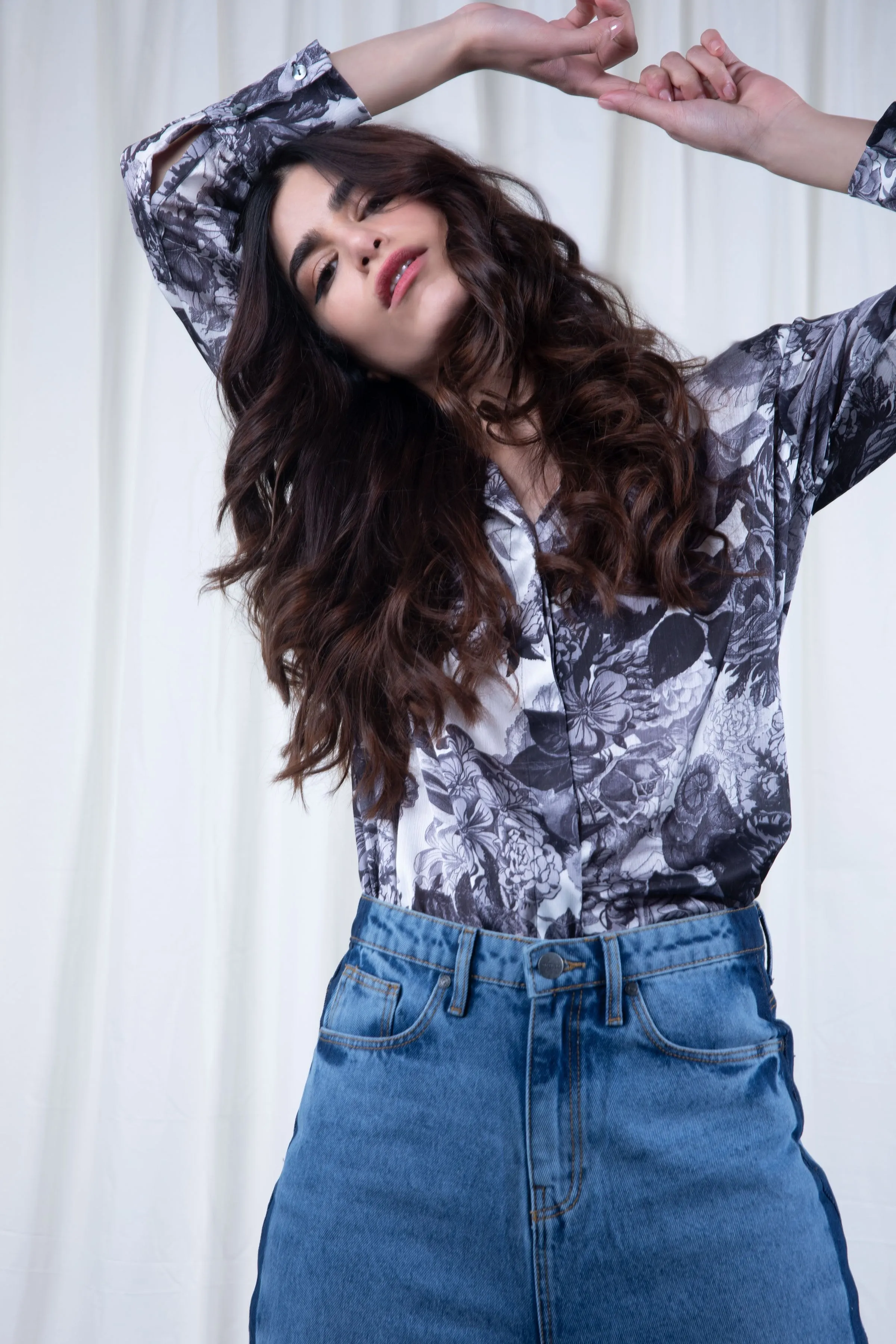 This sweetly feminine must have button down shirt provides a pop of floral color to the work week wardrobe.