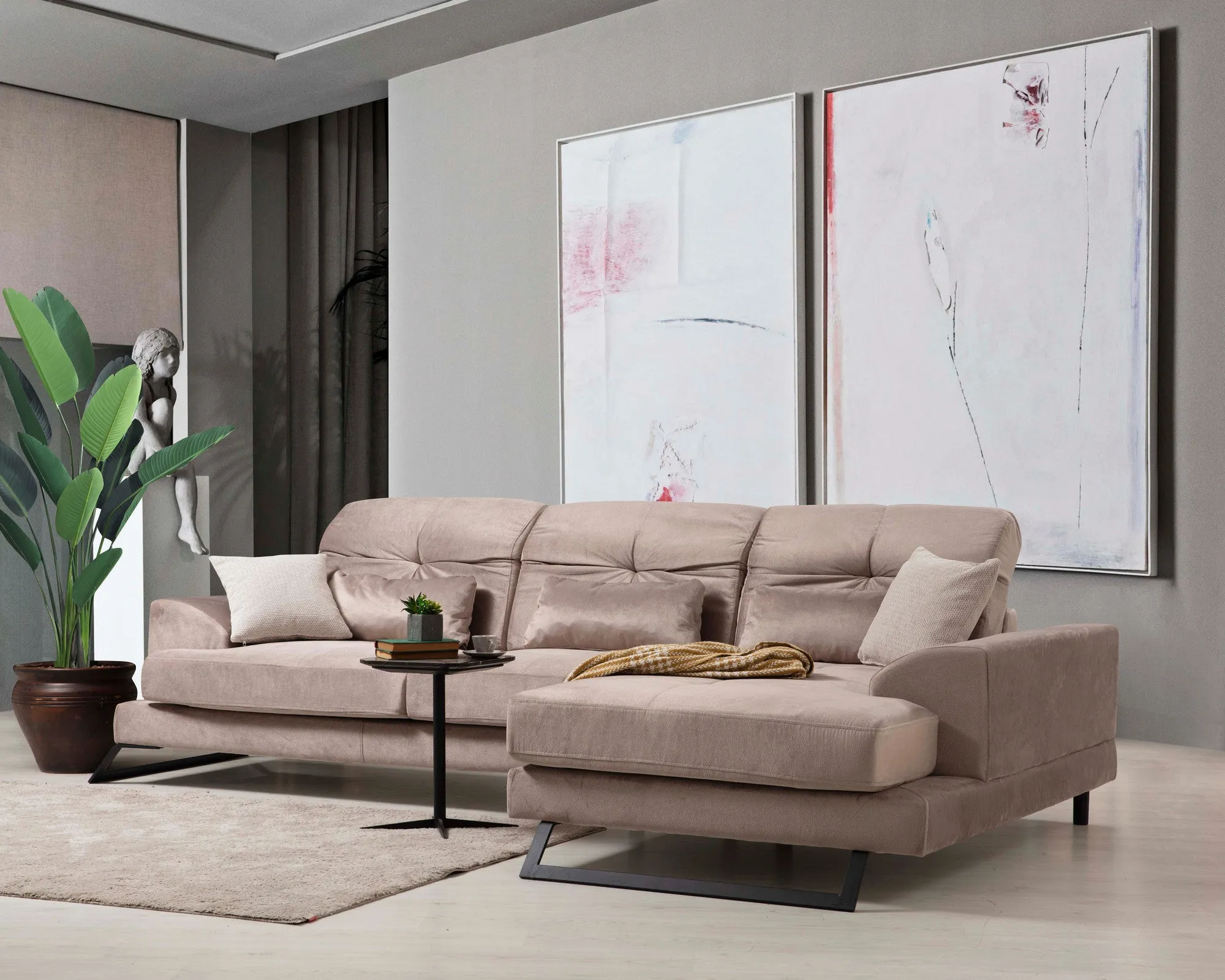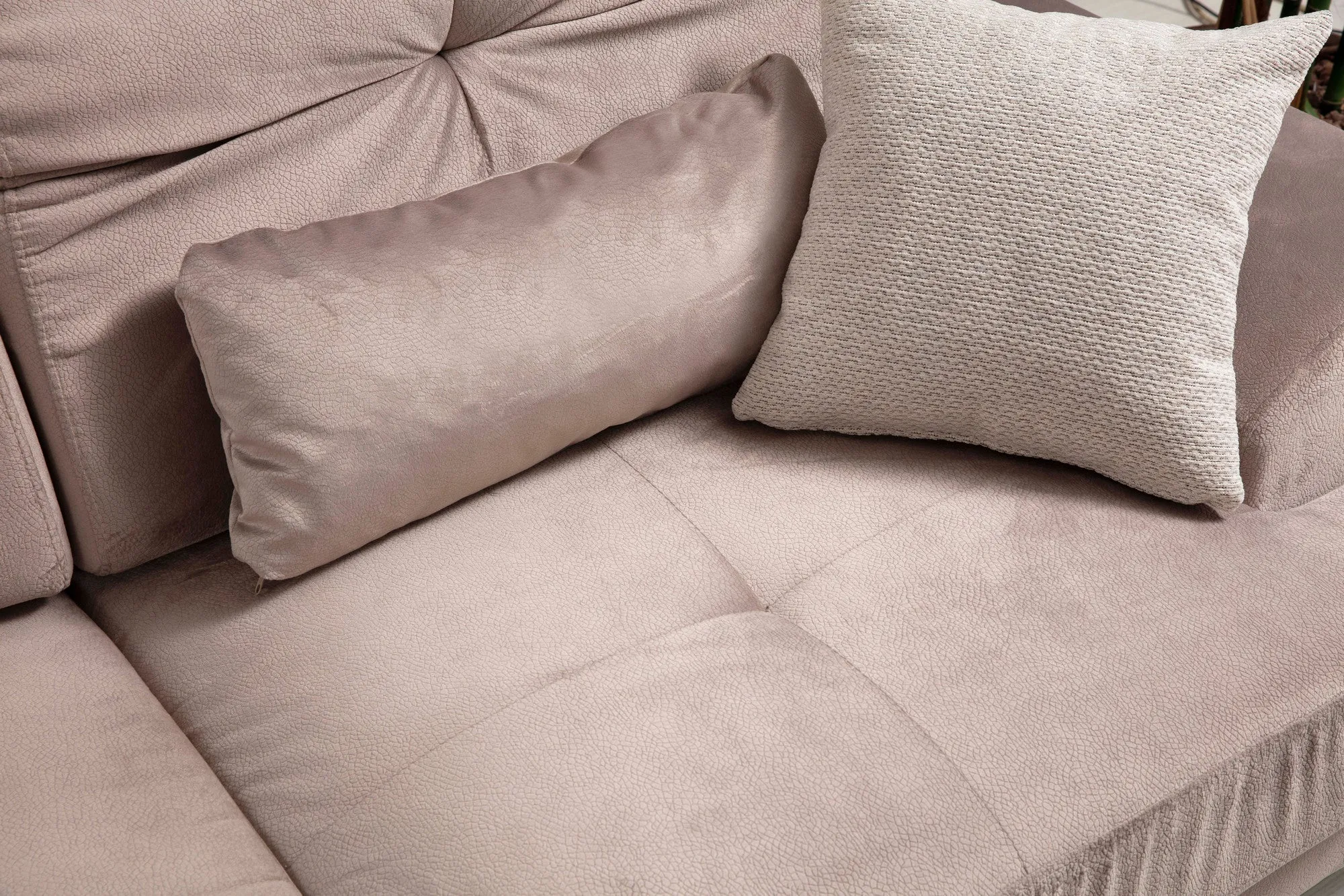 | Frame: BEECH WOOD / CHIPBOARD Fabric: 100% POLYESTER Length: 308 x 190 cm Width: 100 cm Height: 92 cm Foam: 28 DNS soft Grey Foam/24 DNS Feather/Spring in the middle For Sitting 60% Snipped Foam / 40% Silicone Foam For Back System: Sofa system with adjustable backrest mechanism 5 Pillows Included Pillows: 60% Snipped Foam / 40% Silicone Foam Pillow Size: 50 x 50 cm for 2 pillows , 65 x 30 cm for 3 pillows Seat Depth: 140 cm Armrest Depth: 70 cm Portable sitting cushion/ fixed back cushion Dry-cleanable Fabric Legs: Matt black metal legs Foam Height: 18 cm |