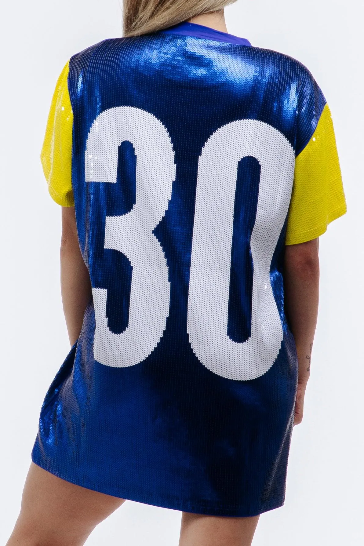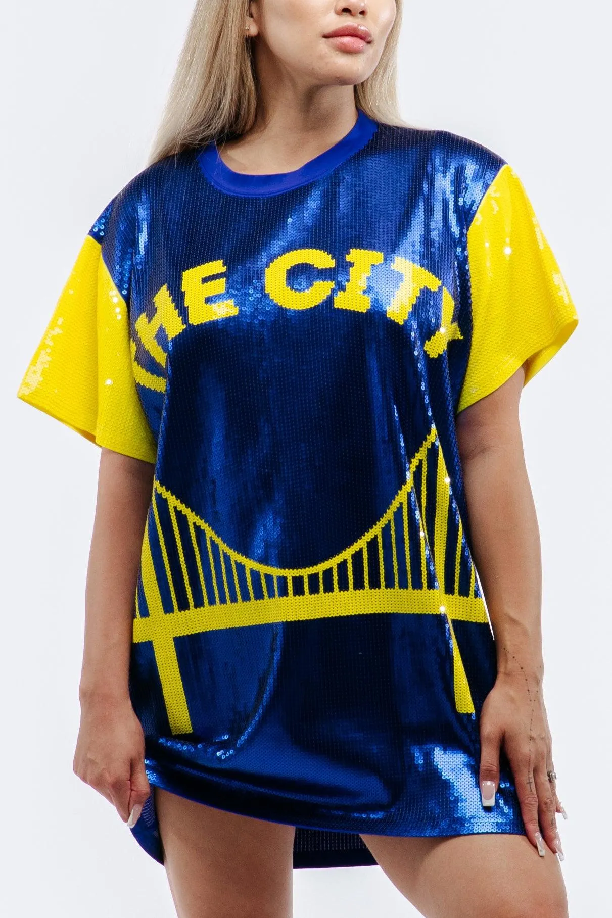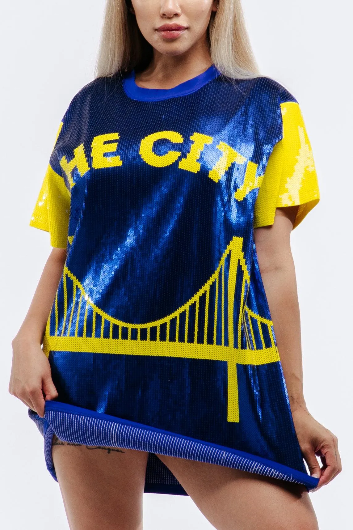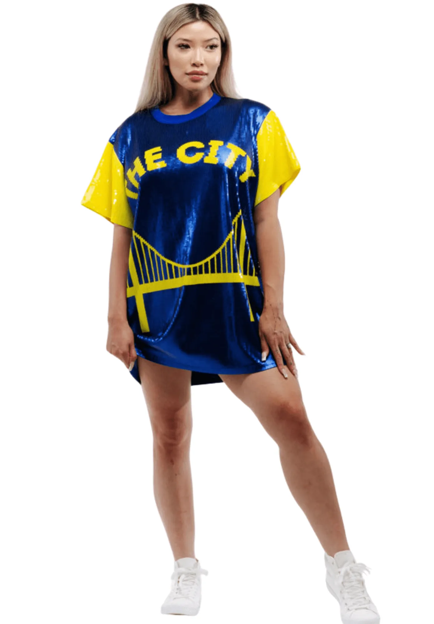 Designed by the Sequin Fans brand, this stunning The City Basketball Sequin Jersey Dress beautifully showcases your love for the Golden State Basketball team. Step onto the stadium or into any game day event with confidence and style with this sports glam basketball jersey dress, perfect for parties that go from day to night.