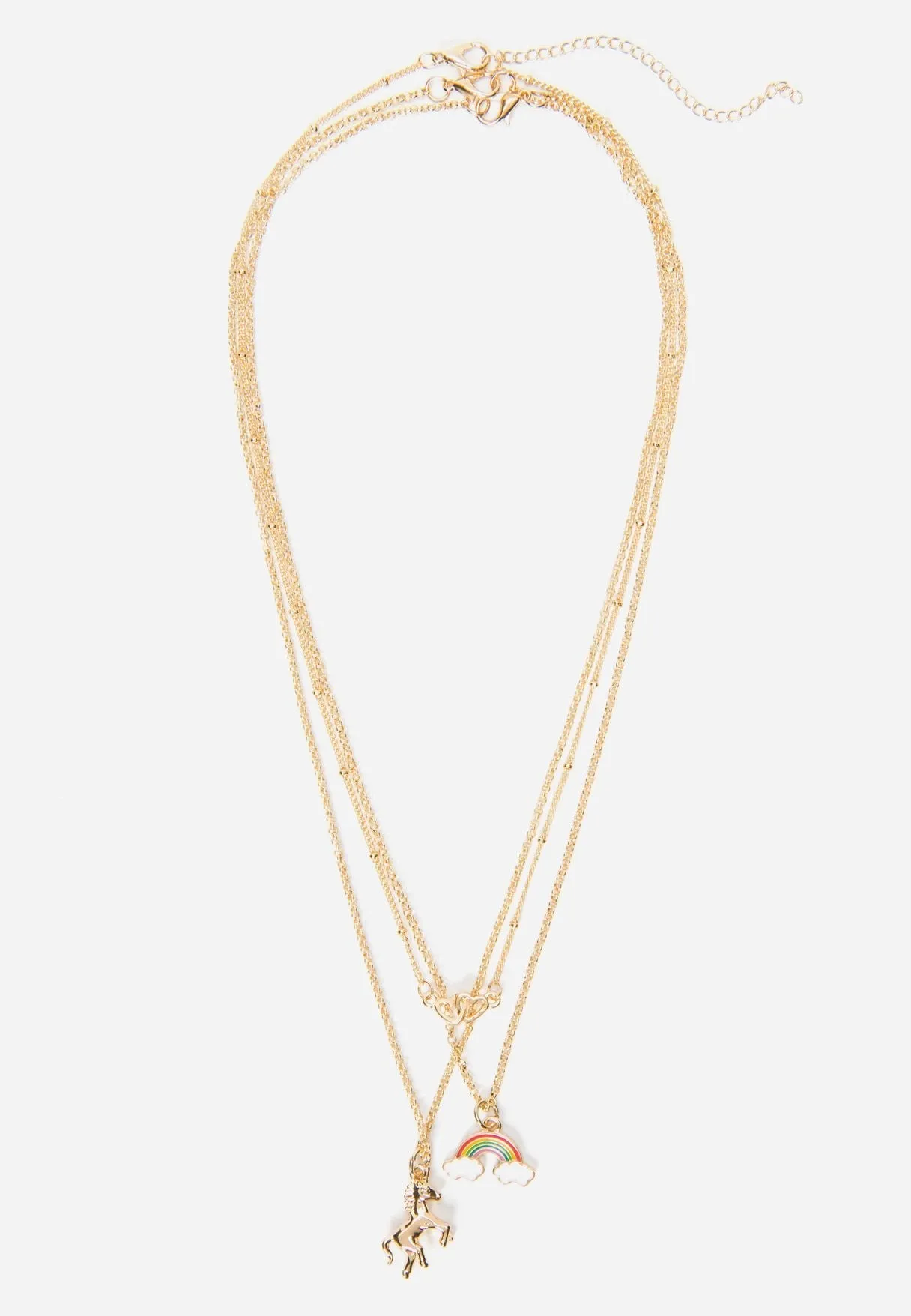 Our girls’ layered necklace set gives her neckline a touch of glam. Each layer is anchored by a sweet pendant. There are two chains with goldtone rolo links and a third has small round stations. It’s the perfect set to start her jewelry collection; your girl will learn to appreciate the delicacy of jewelry while upgrading her outfits. And she can style each necklace alone, layer them, or gift one to her bestie.