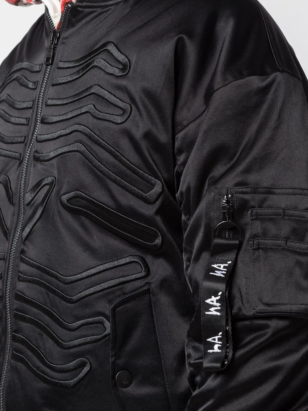 Black "Hac-Head" bomber jacket from Haculla featuring large embroidered detail on the front, character/Haculla logo embroidery on the back, long sleeves, front zipper closure, and ribbed collar, cuffs, and hem.