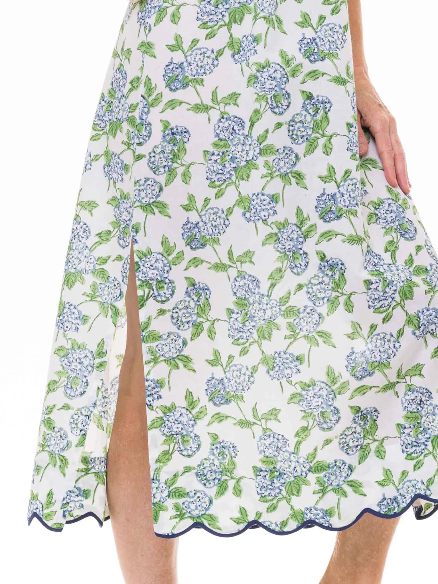 Hydrangeas’ soft shape is perfectly suited for the Indian block print process. The bulging flowers in white and blue can be carved into wood blocks and pressed on cotton by hand. Watching my hydrangea prints come to life, from the workshop in which they’re handcrafted by expert artisans to finished, form fitting products, has been a captivating experience.