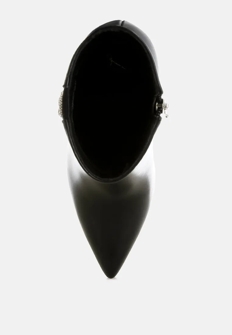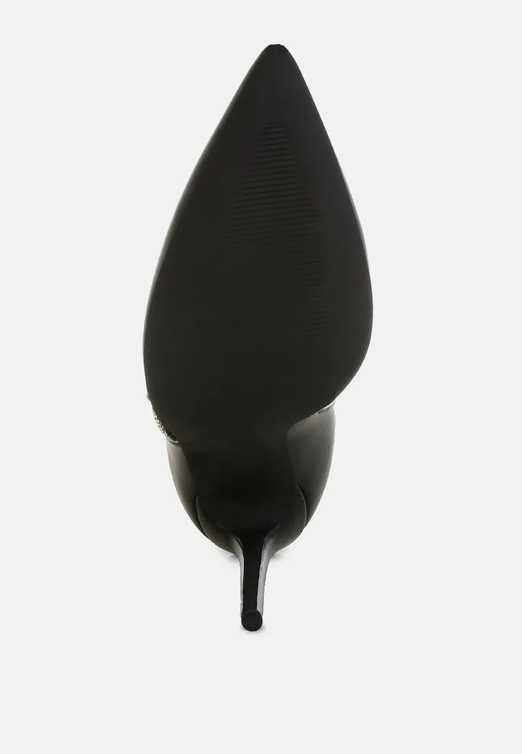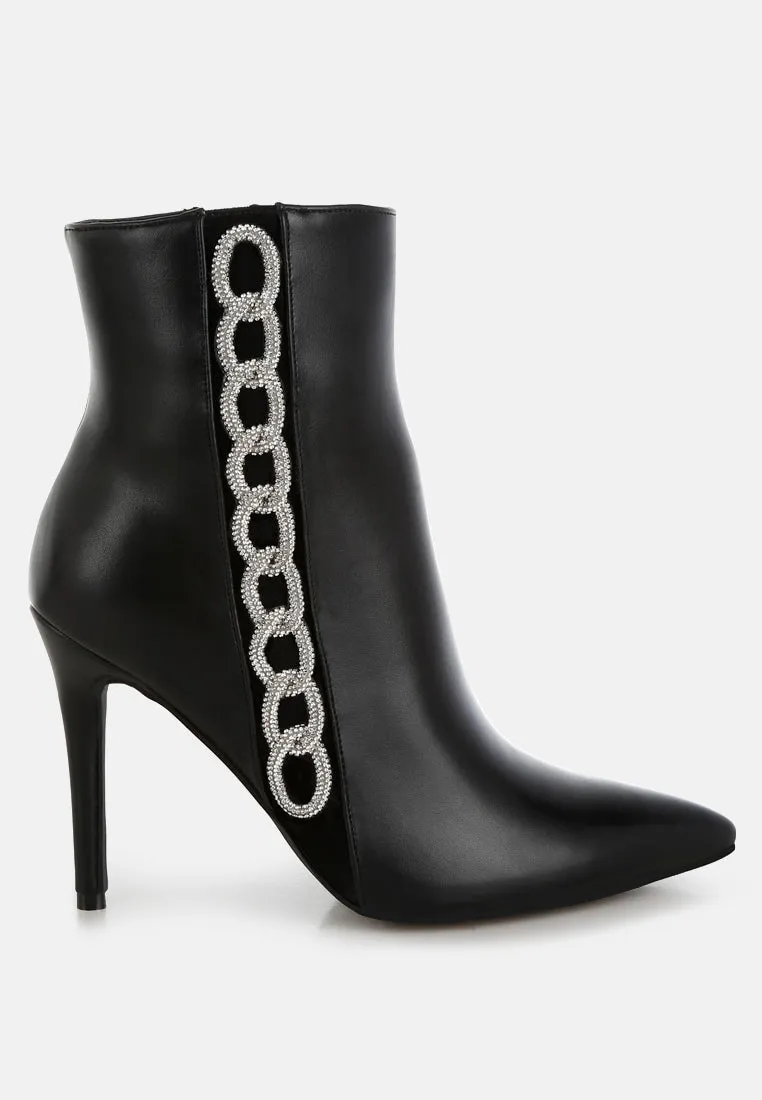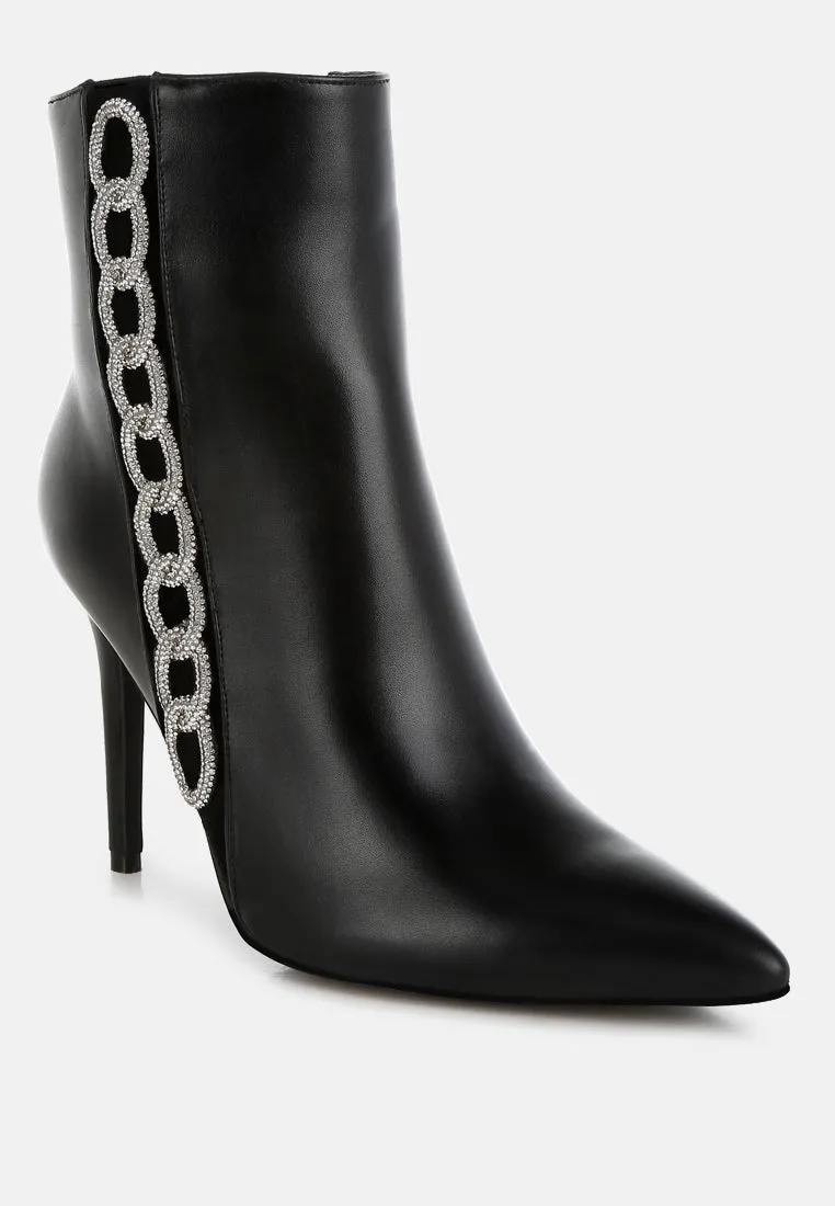 The ankle boots have a glamorous charm with the rhinestones embellished chain detail which gives them a unique glam look. The stiletto heels are stylish while the zipper closure is convenient. The comfortable cushion insoles cut strain and offer a relaxed fit.