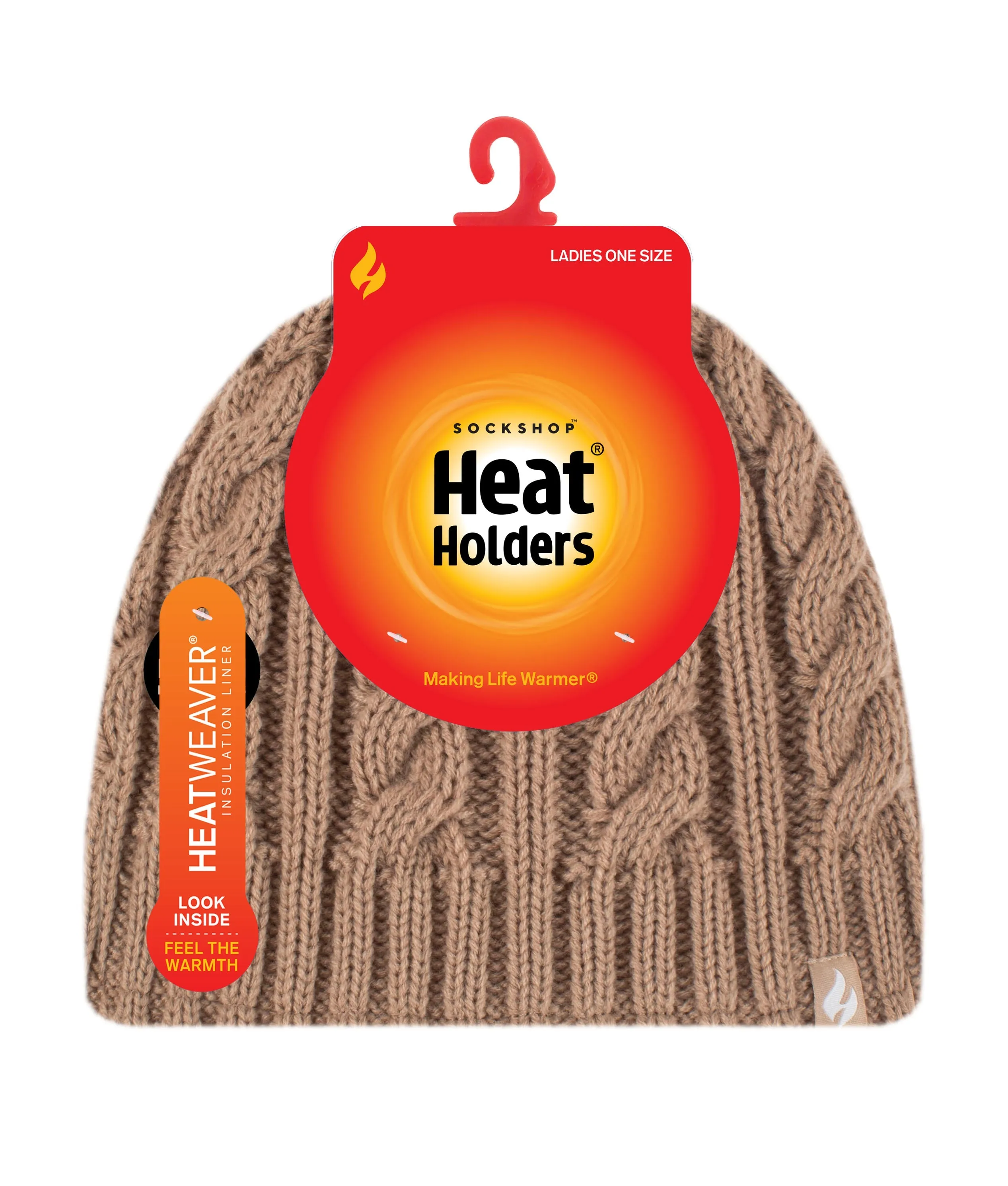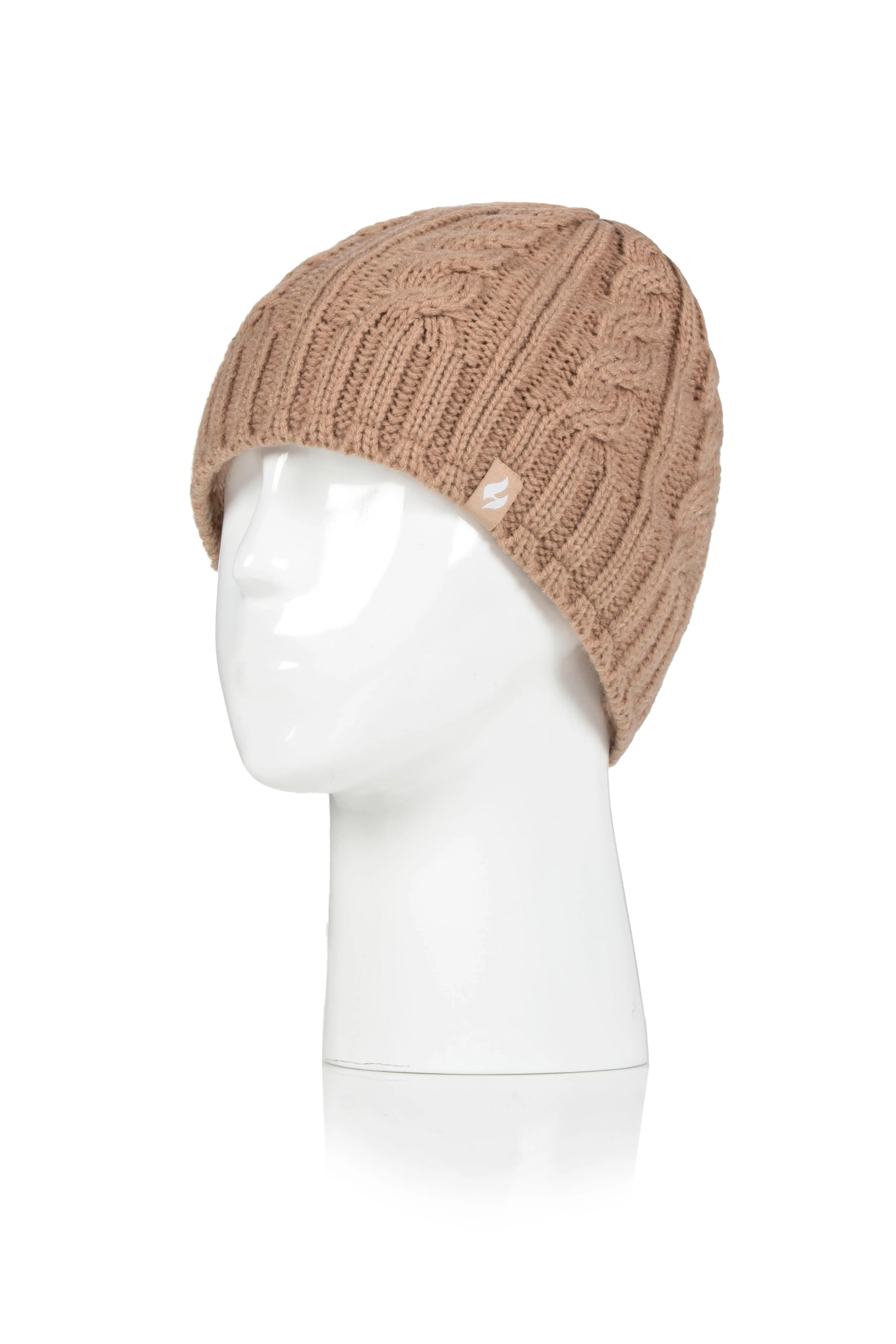 Whether you need reliable cold-weather protection or just an extra touch of warmth while strolling around town, this Ladies Original Thermal Hat in Camel is guaranteed to warm up your life. This women's thermal hat features a chunky cable knit in soft yarn with a ribbed hem.