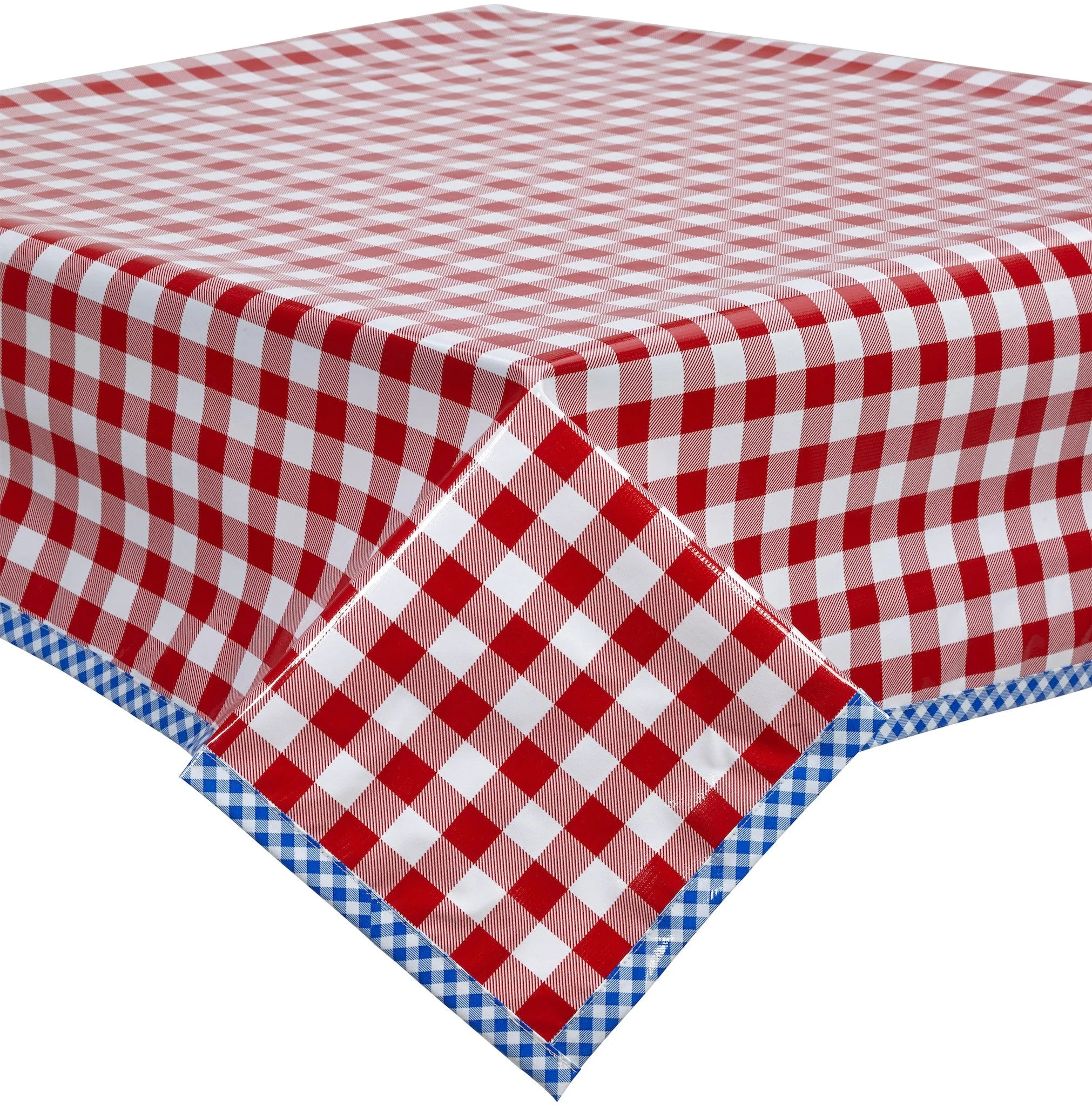These square and rectangular tablecloths are finished with gingham trim, which is also oilcloth.