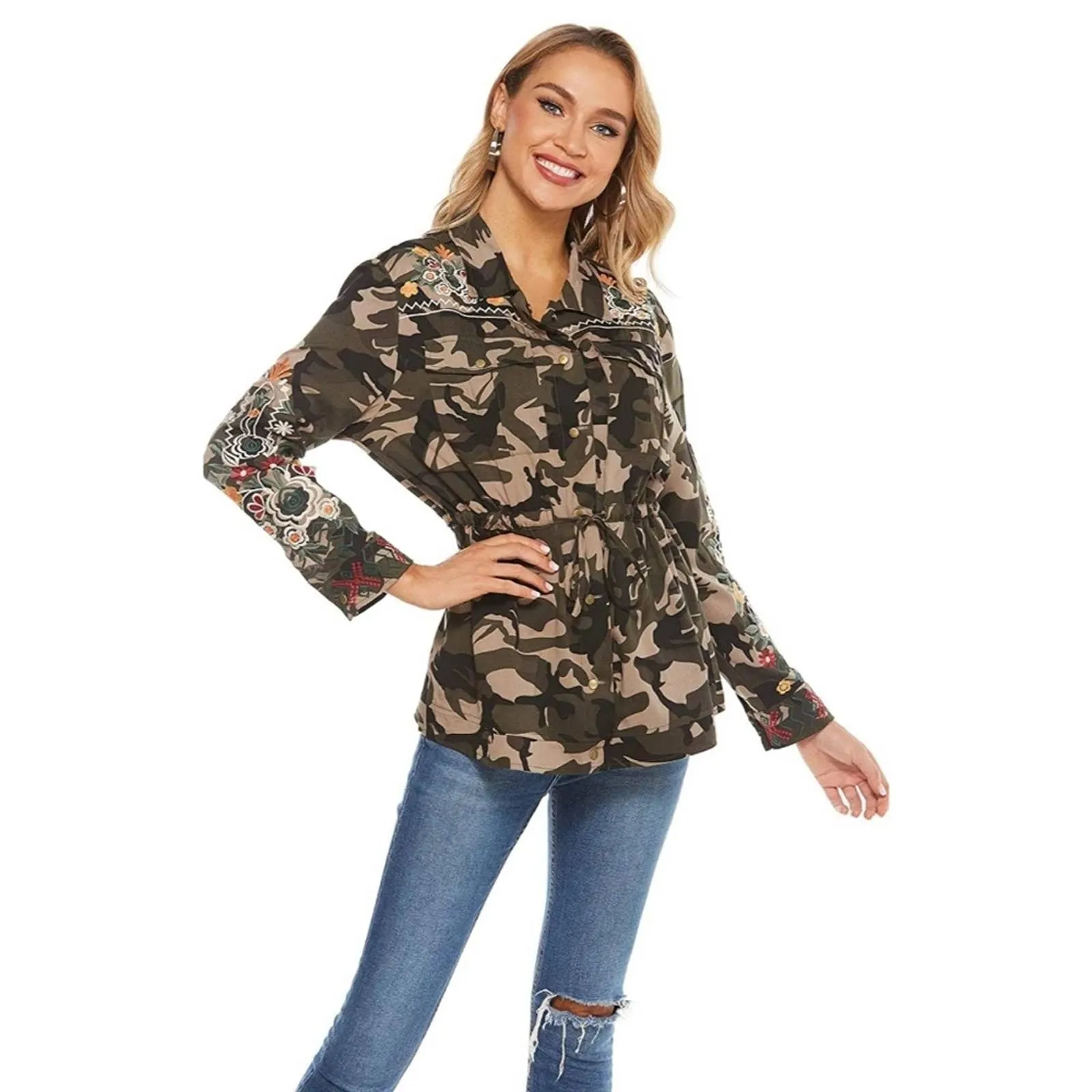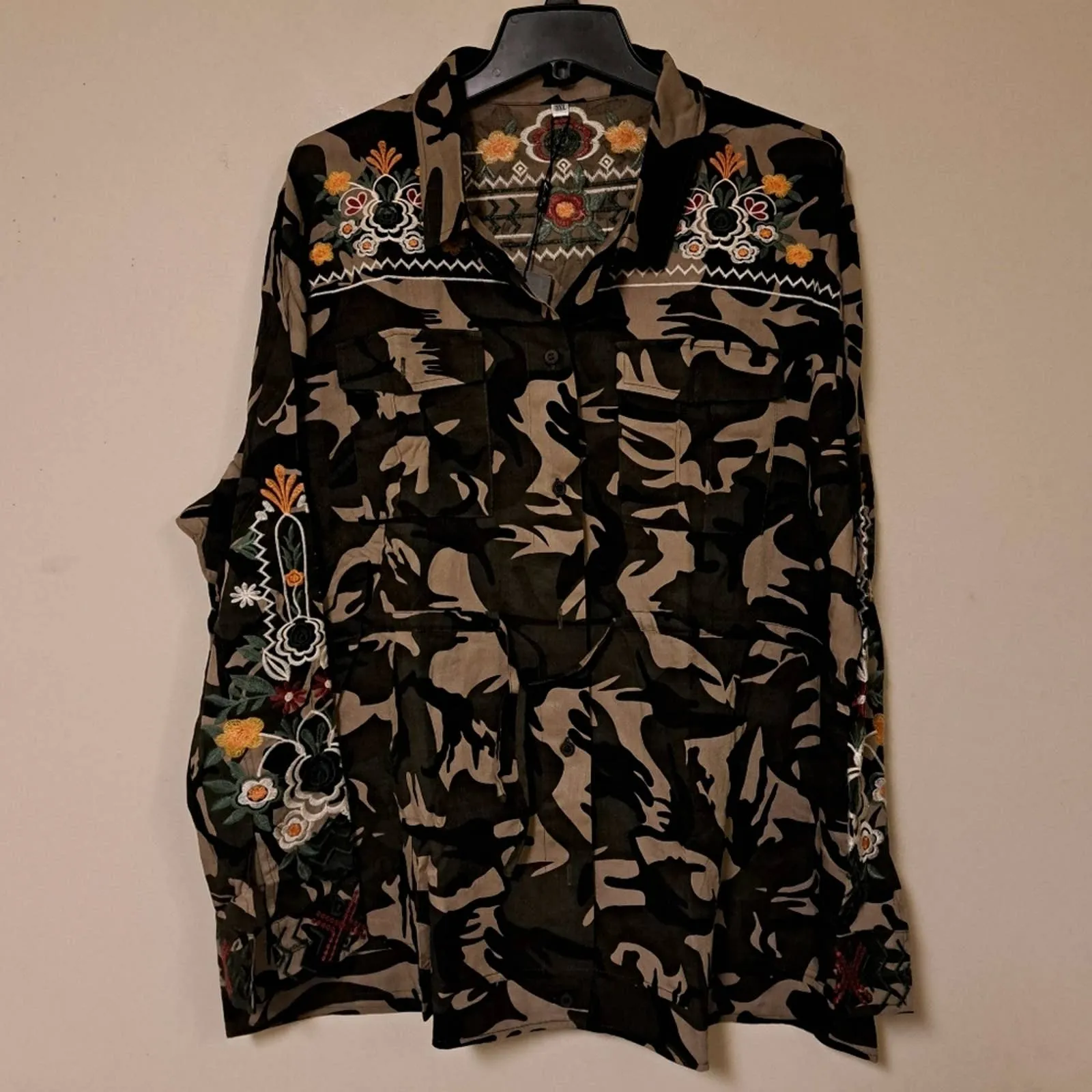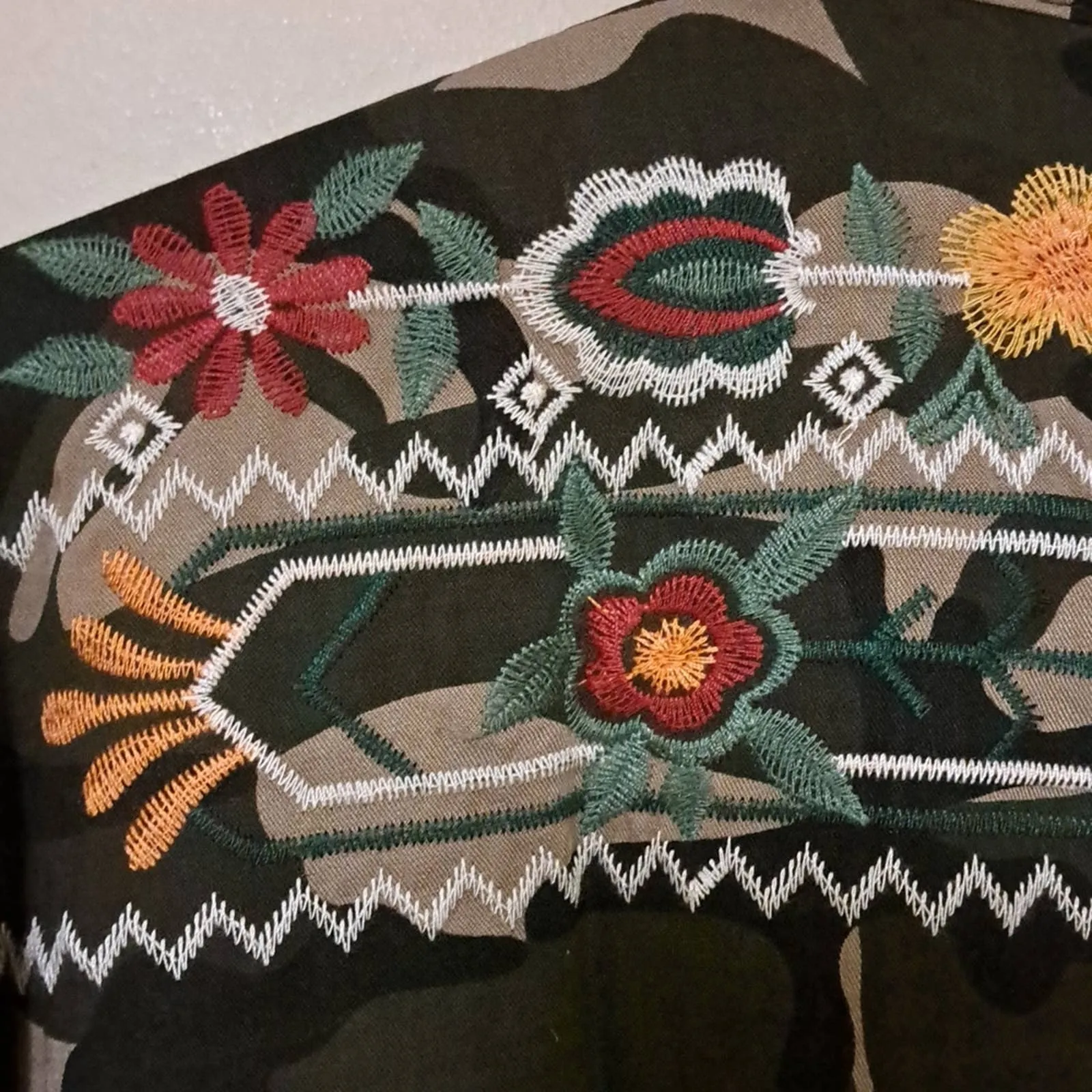 This camo embroidered blouse is made from 100% Cotton Rayon and is beautifully crafted. It is soft and comfortable to wear.