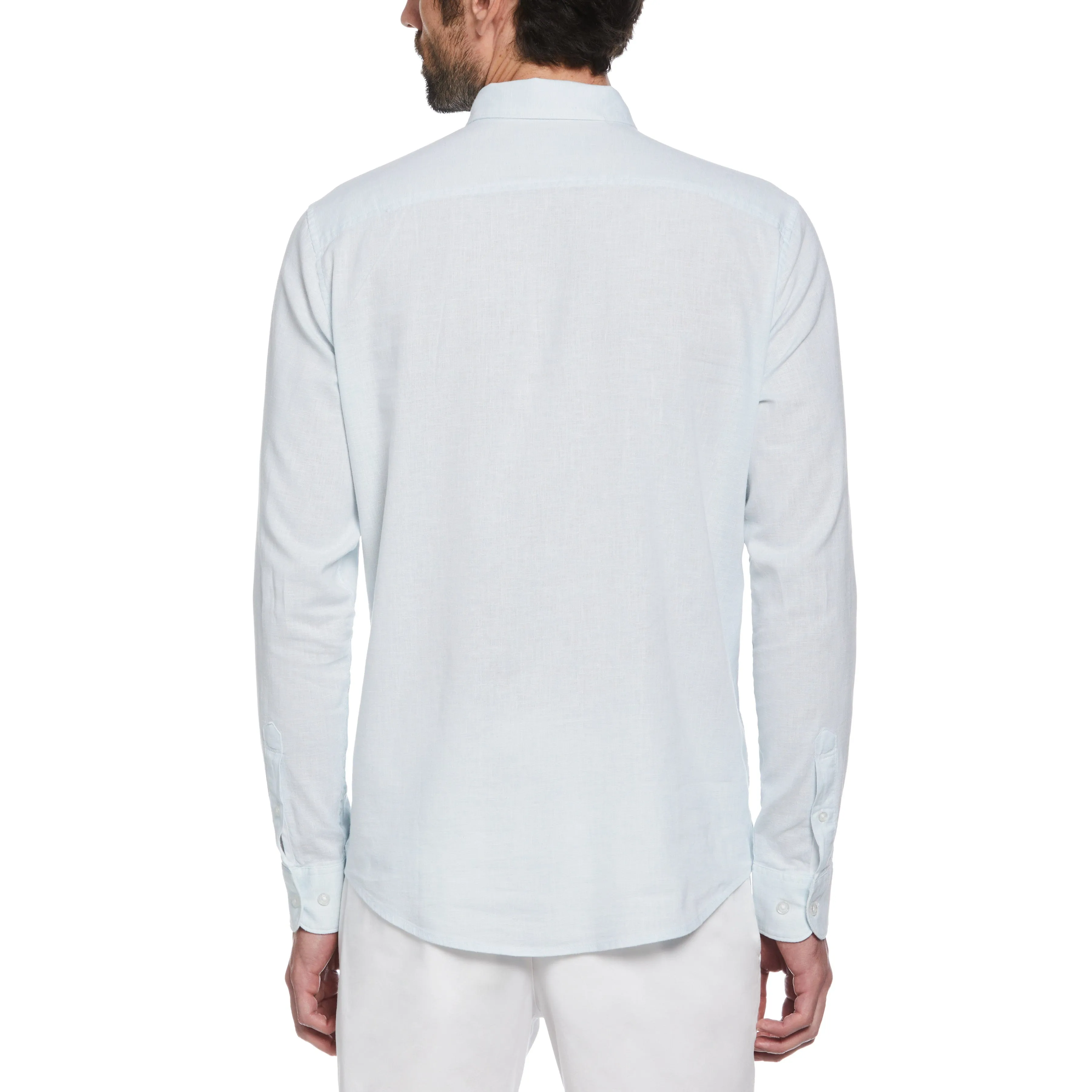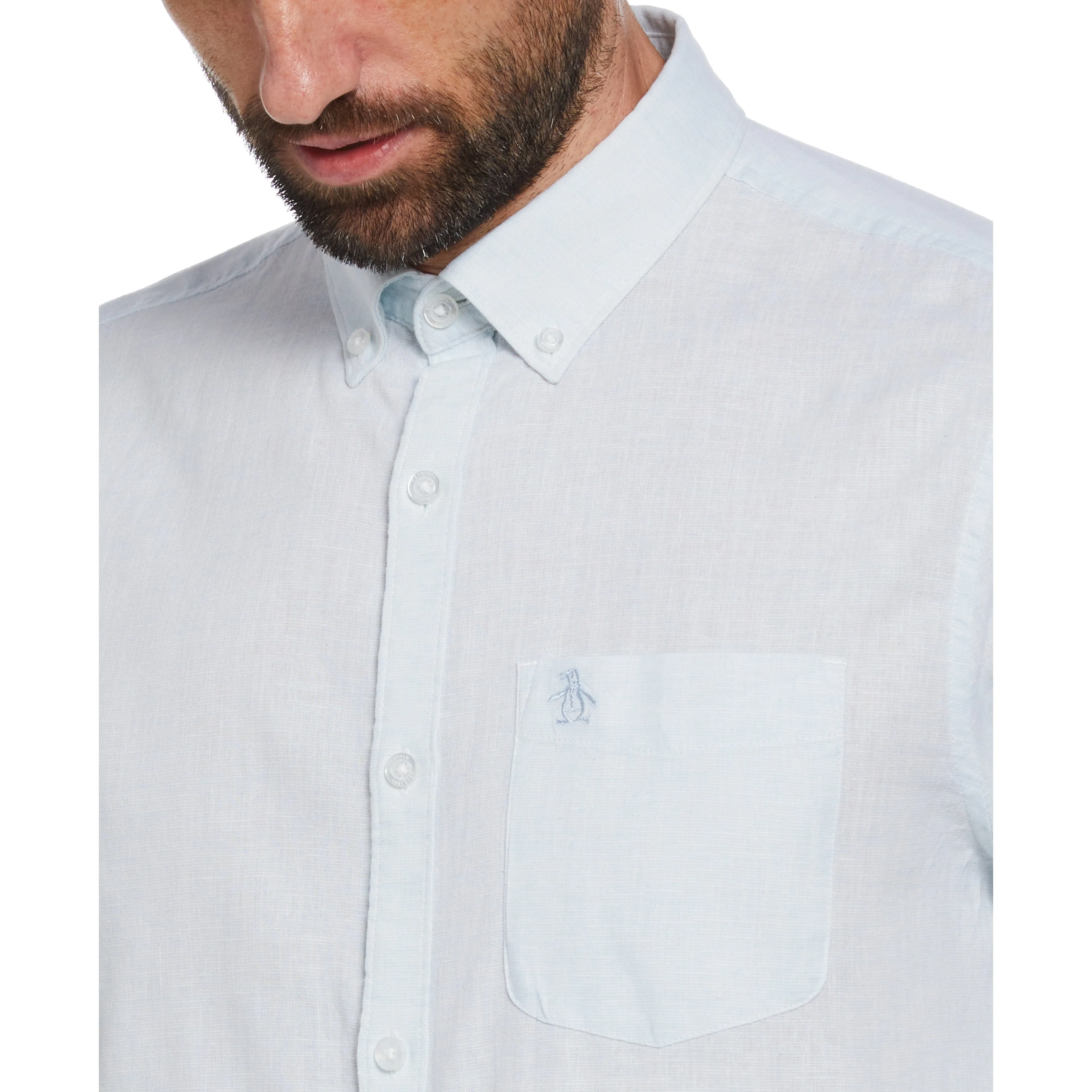 Look and feel your coolest in this Original Penguin men’s button-down shirt. The men’s long sleeve shirt is made from a blend of breathable linen and soft cotton for impressive comfort and a lightweight feel perfect for warm climates. A hint of stretch in the durable plain weave fabric lets you move freely, while the sleek slim fit and a Pete logo on the front pocket add sophisticated modern style.