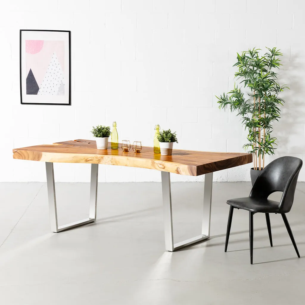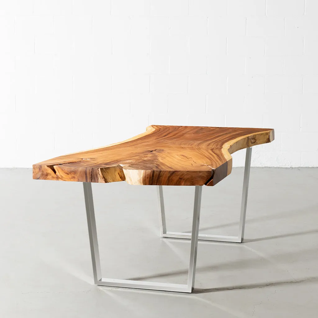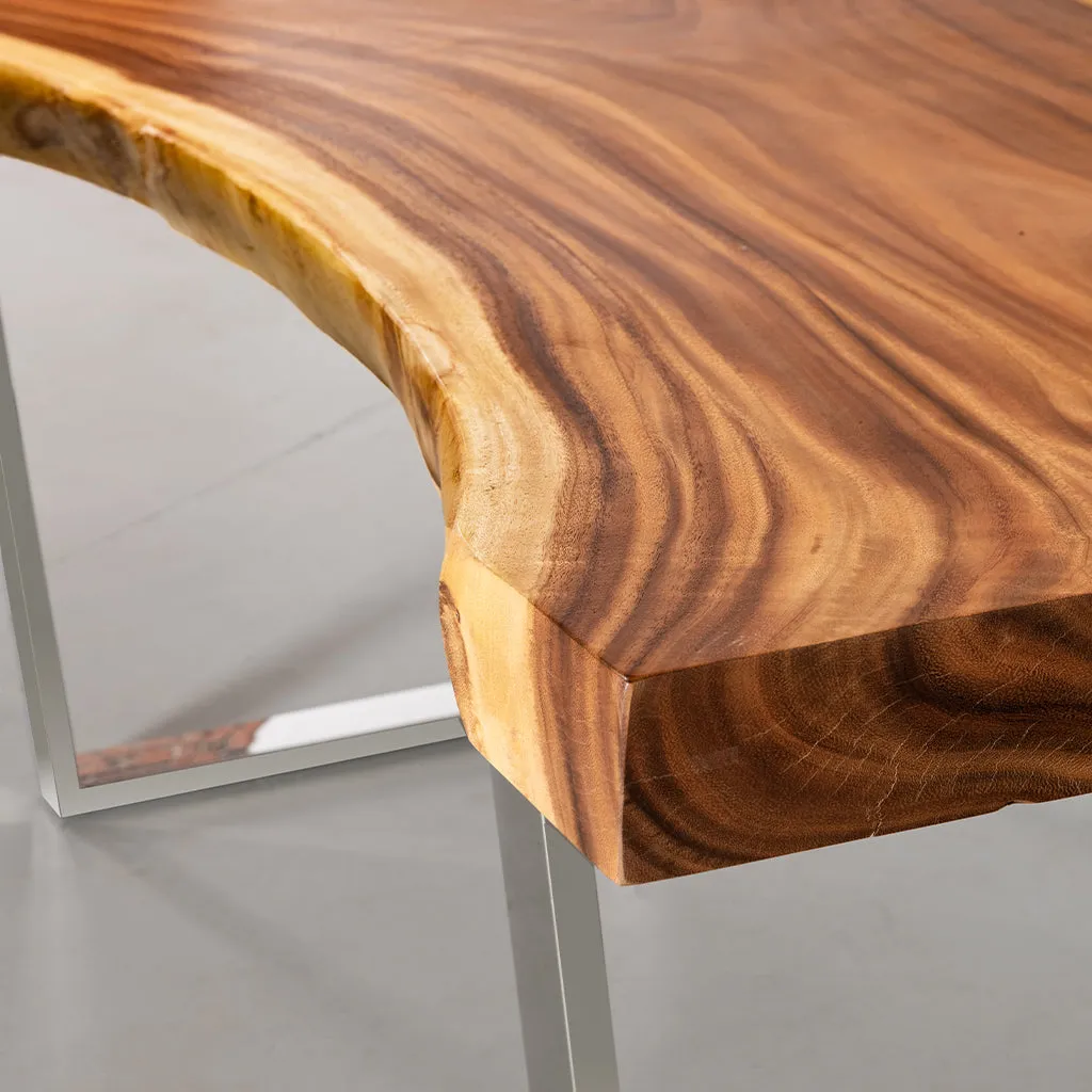 Our premium Live Edge One Piece Solid Slab Suar Tabletops are natural works of art, each with its own unique story. No matter what your decor style, a gorgeous one-of-a-kind 100% solid Suar table will bring natural warmth and timeless beauty to your dining experience. Made from one of the most durable and sustainable hardwoods, our Suar tables exude natural elegance with stunning wavy patterns and striking wood grain. The Suar tables that we carry are made from a single piece of solid wood, cut from one edge to the other. Each with its own distinctive shape. All one-of-a-kind.